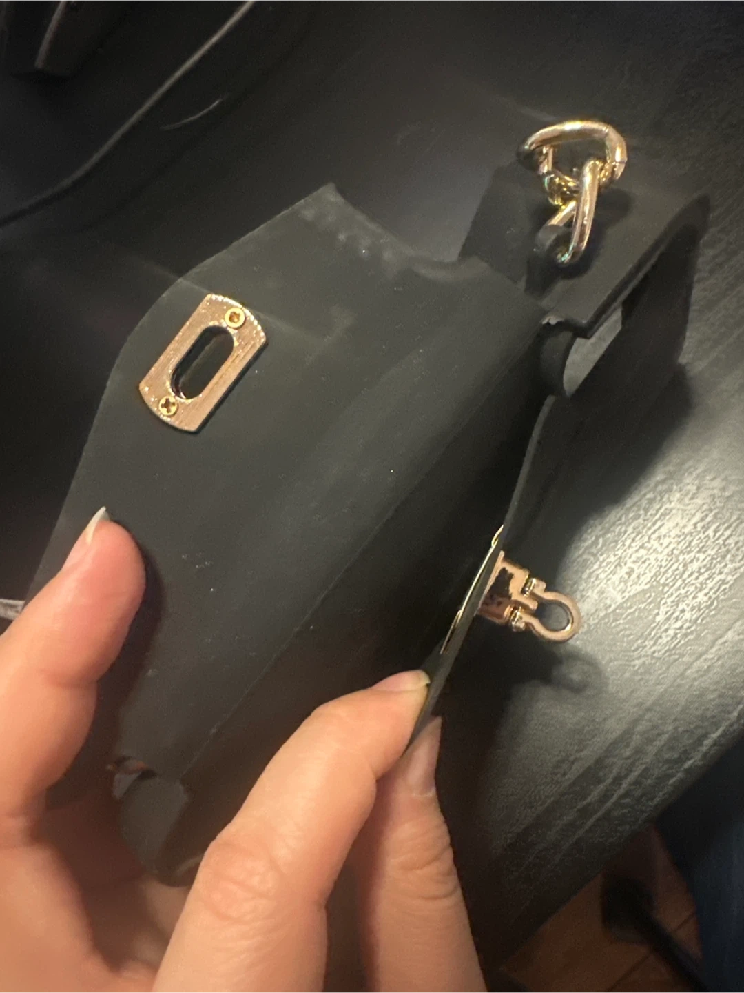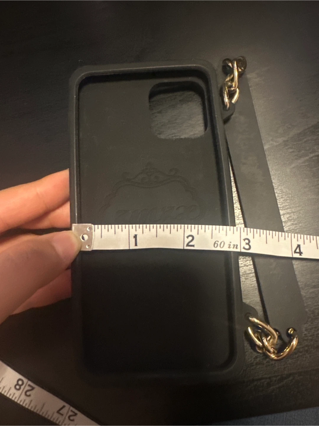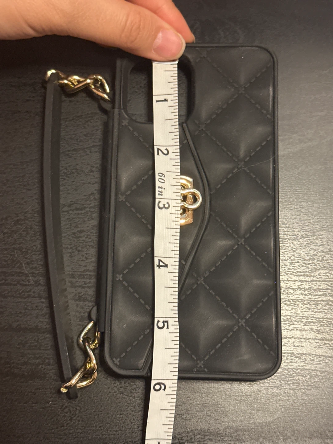 A stylish black iPhone case with a gold chain detail! It measures approximately 3 inches wide and 6 inches tall. It's in great condition and ready for a new phone