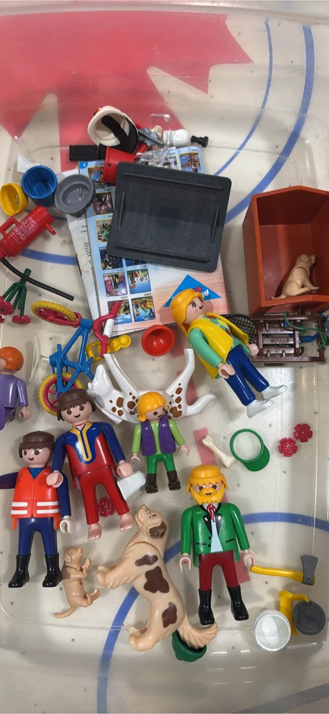 A collection of Playmobil toy figures and accessories. Includes people, animals, and various small parts. Great for expanding your Playmobil collection or starting a new adventure!