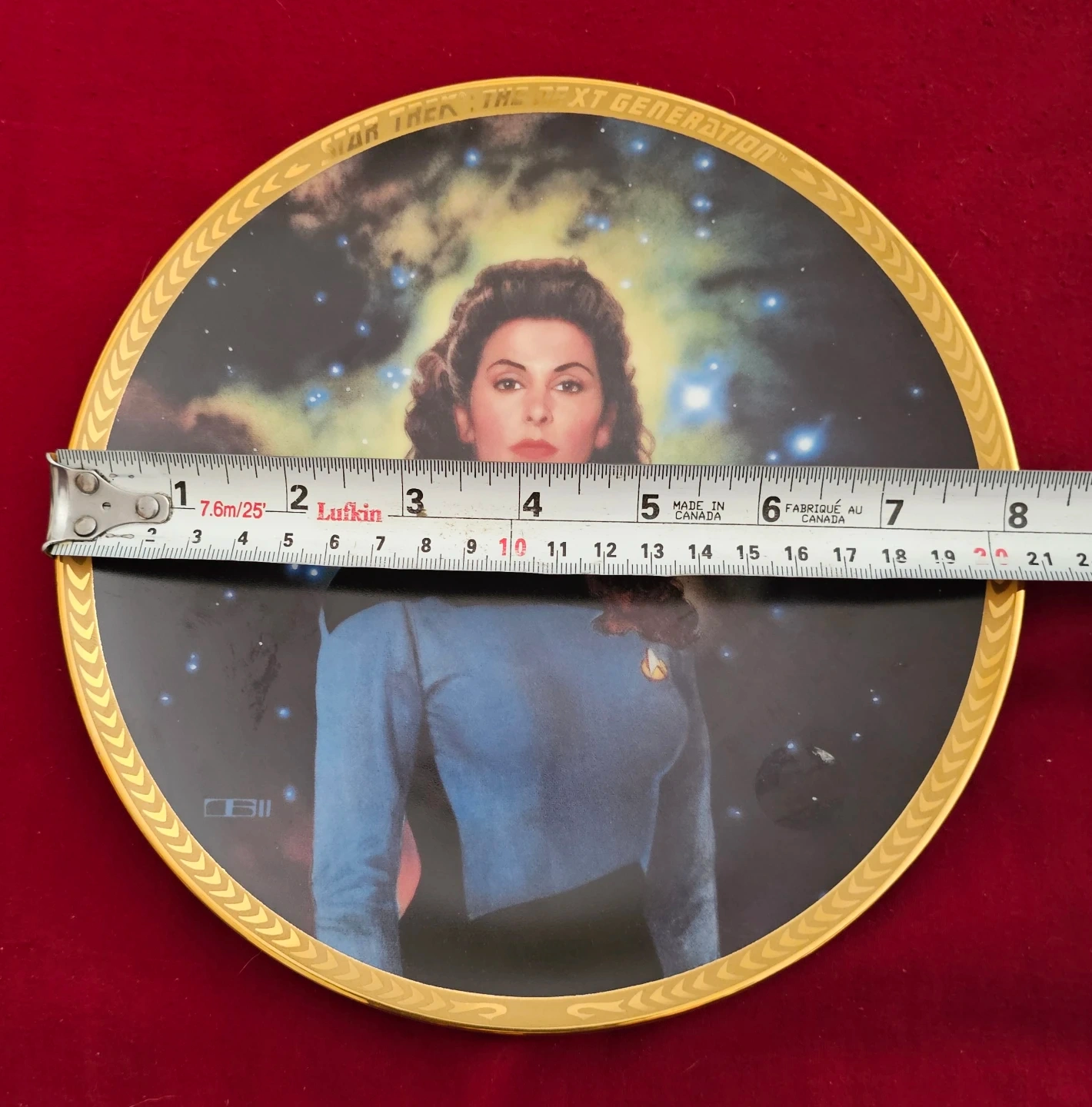 Thank you for considering this 1993 limited edition Counselor Deanna Troi, as portrayed by Marina Sirtis in Star Trek the Next Generation Collectors Plate! This 8" plate is from The Hamilton Collection, with artwork by artist Thomas Blackshear II, and is officially authorized by Paramount Pictures. It comes with a certificate of authenticity and is in MINT condition. A must-have for any Star Trek fan!