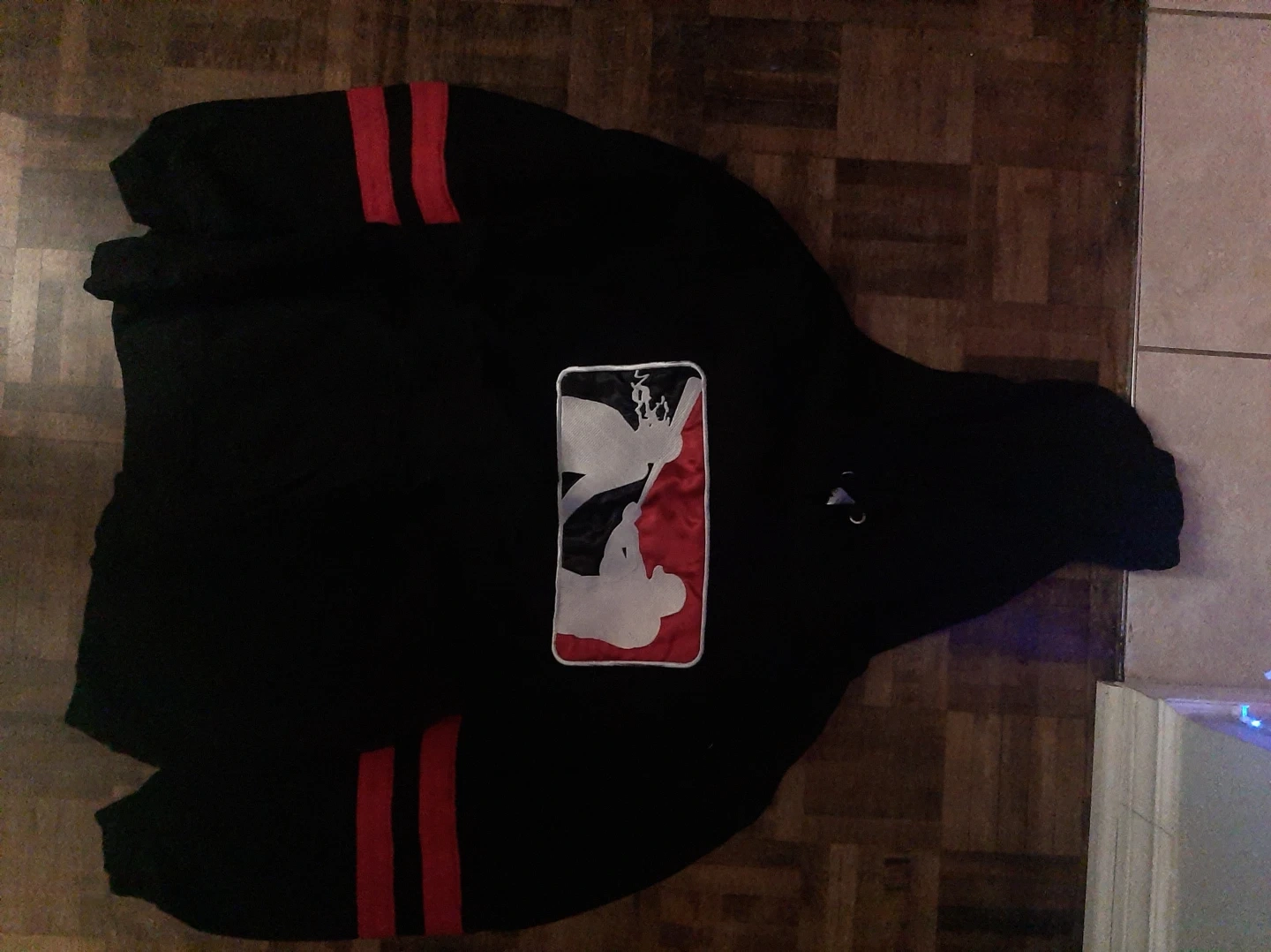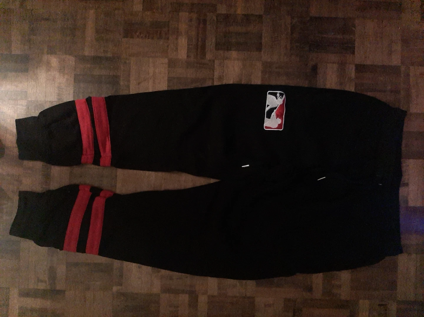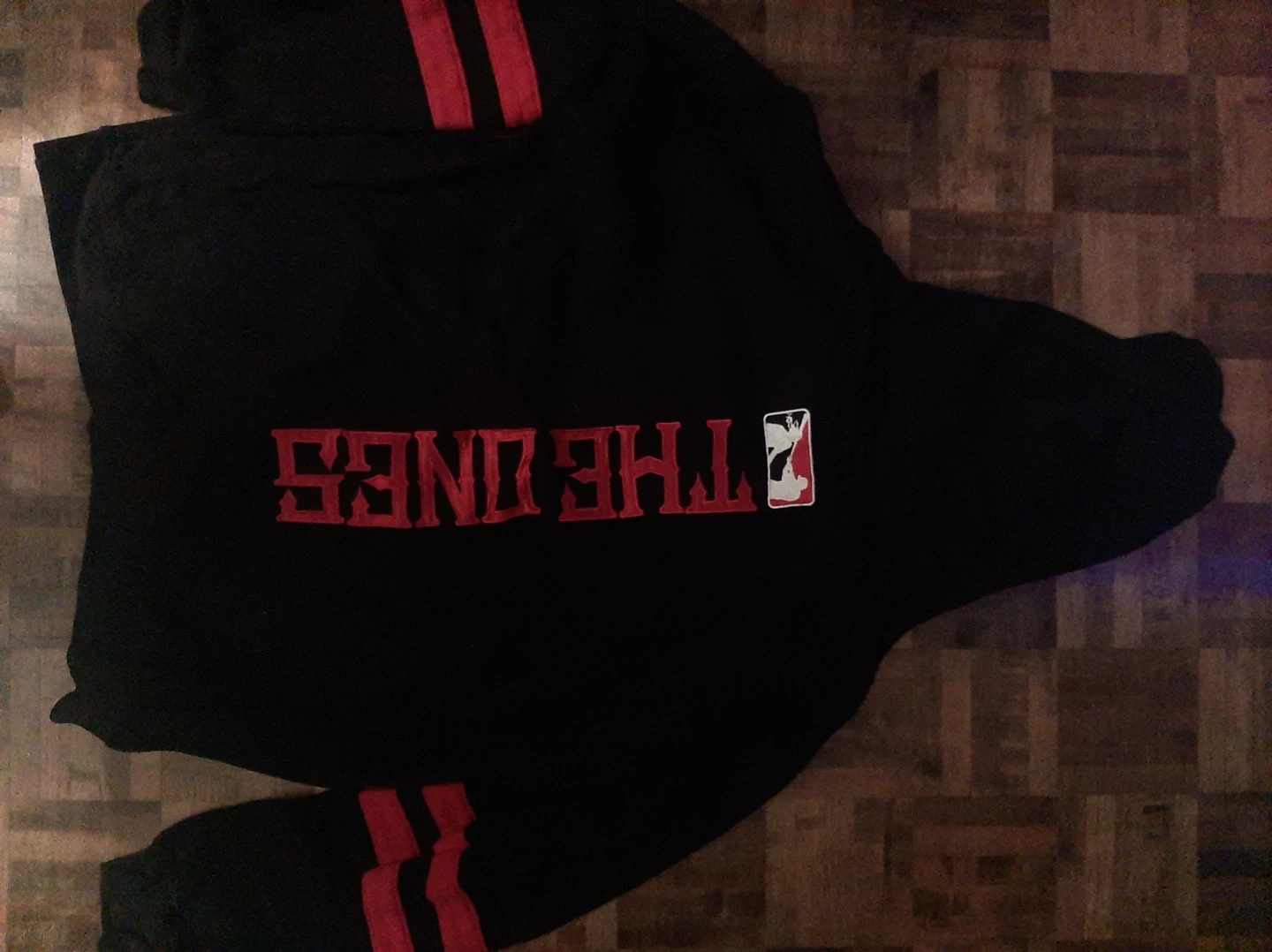 Selling a black tracksuit with red stripes and the Harley Gs logo. It's in great condition and ready for a new owner!