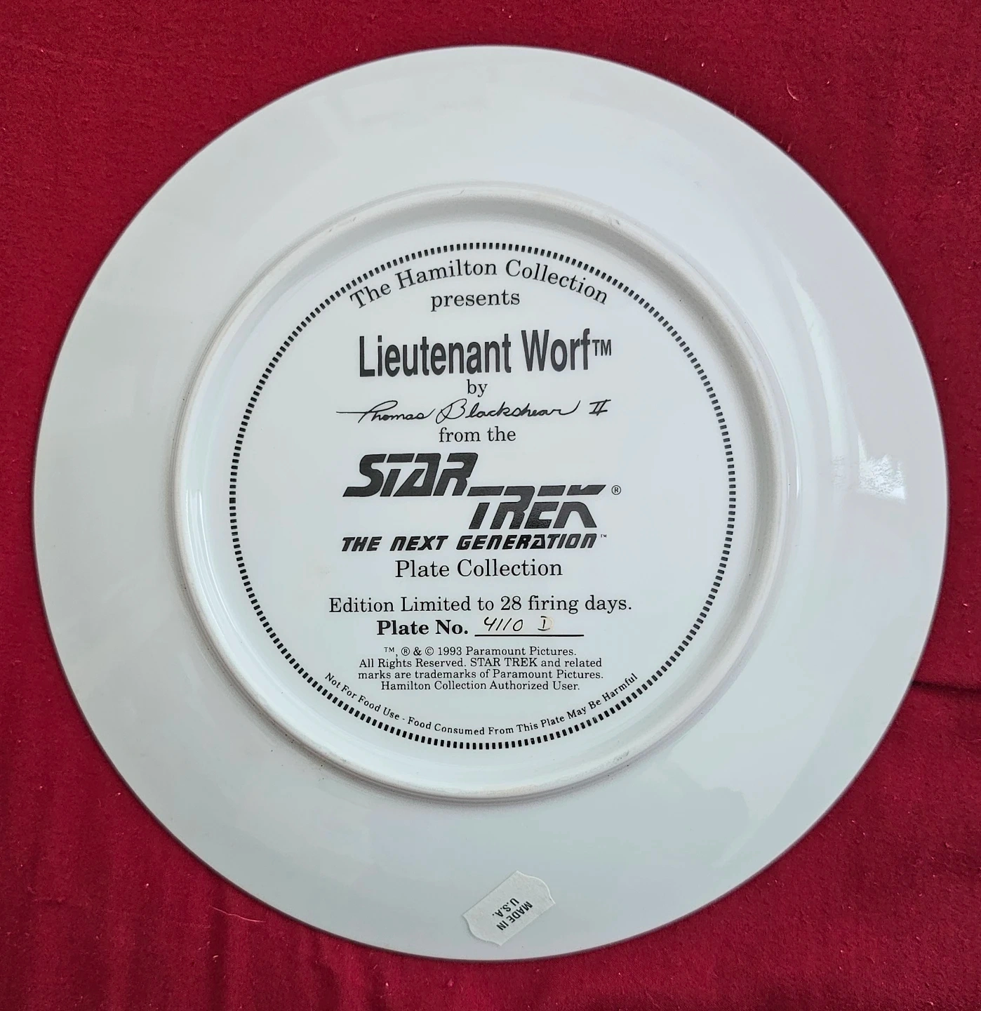 Thank you for considering this 1993 limited edition lieutenant commander Worf, as portrayed by Michael Dorn in Star Trek the Next Generation Collectors Plate! This 8" plate is from The Hamilton Collection, with artwork by artist Thomas Blackshear II, and is officially authorized by Paramount Pictures. It is in MINT condition. A must-have for any Star Trek fan!