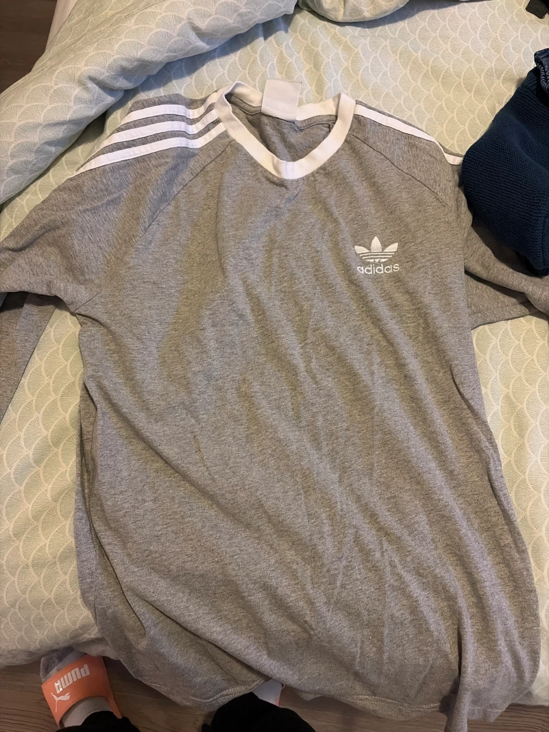 Giving away a grey long sleeve Adidas shirt. It features the classic three stripes on the shoulders and the Adidas logo on the chest. Great for casual wear or sports!