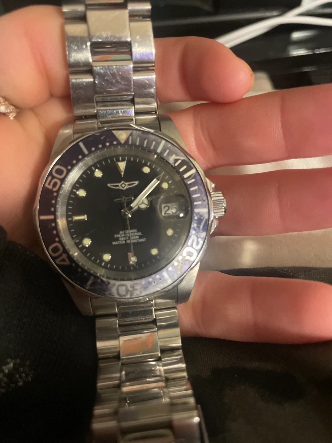 Selling an Invicta Automatic Professional watch. It's water-resistant up to 660ft-200M. The watch has a date display and a stainless steel band. It shows some signs of wear but is still functional