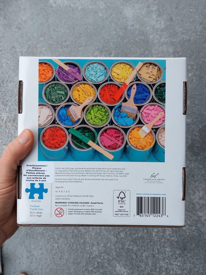 This is a 1000-Piece jigsaw puzzle where the picture is of LEGO pieces in paint cans. Brand new, unopened box, never used. The box is in great condition to be gifted to a LEGO lover in need of a challenge.