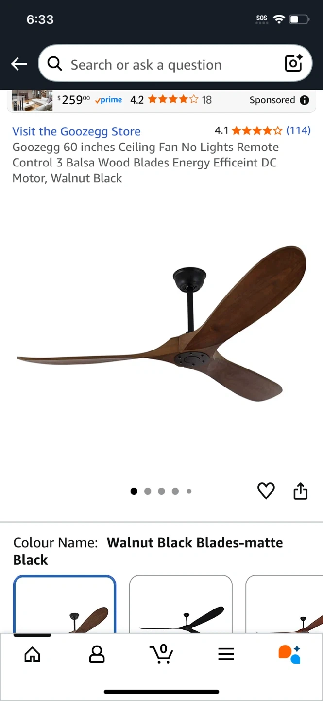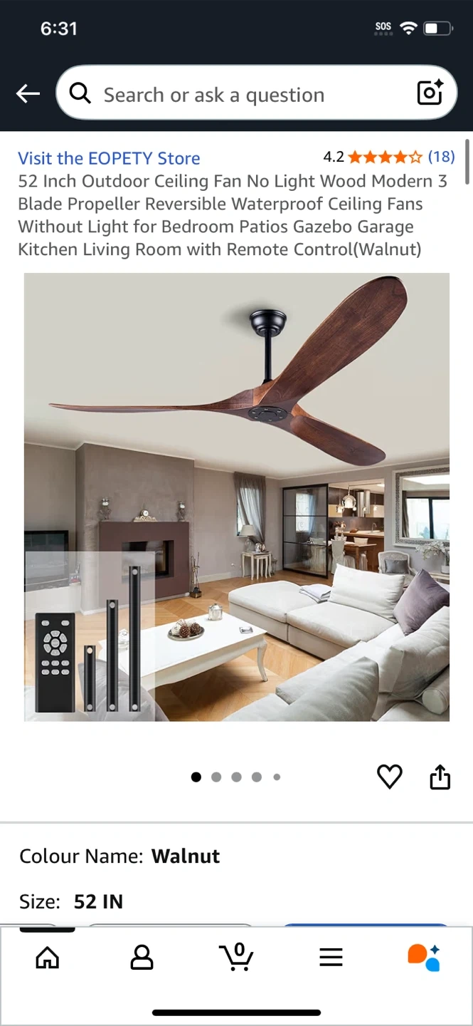 Selling a 52-inch outdoor ceiling fan from EOPETY Store. It has a modern 3-blade propeller design. It's waterproof, making it great for patios, gazebos, garages, kitchens, and living rooms. It comes with a remote control and has a walnut finish