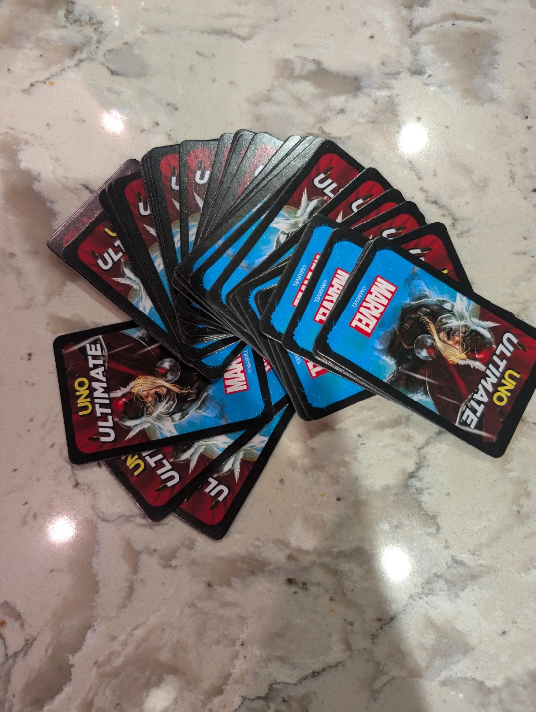 Selling a 48 used UNO Ultimate Marvel card game! It's a fun twist on the classic UNO game with a Marvel theme. Perfect for family game nights or playing with friends who love superheroes