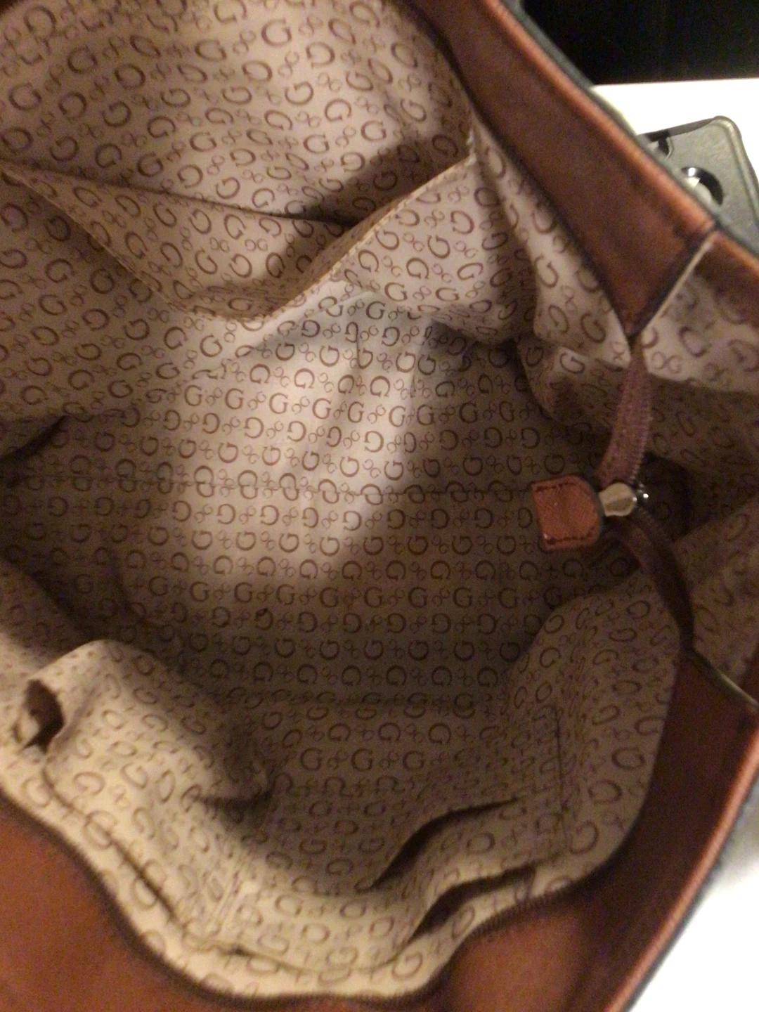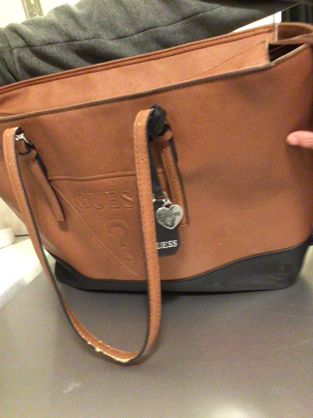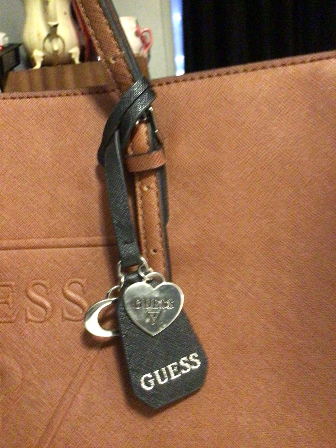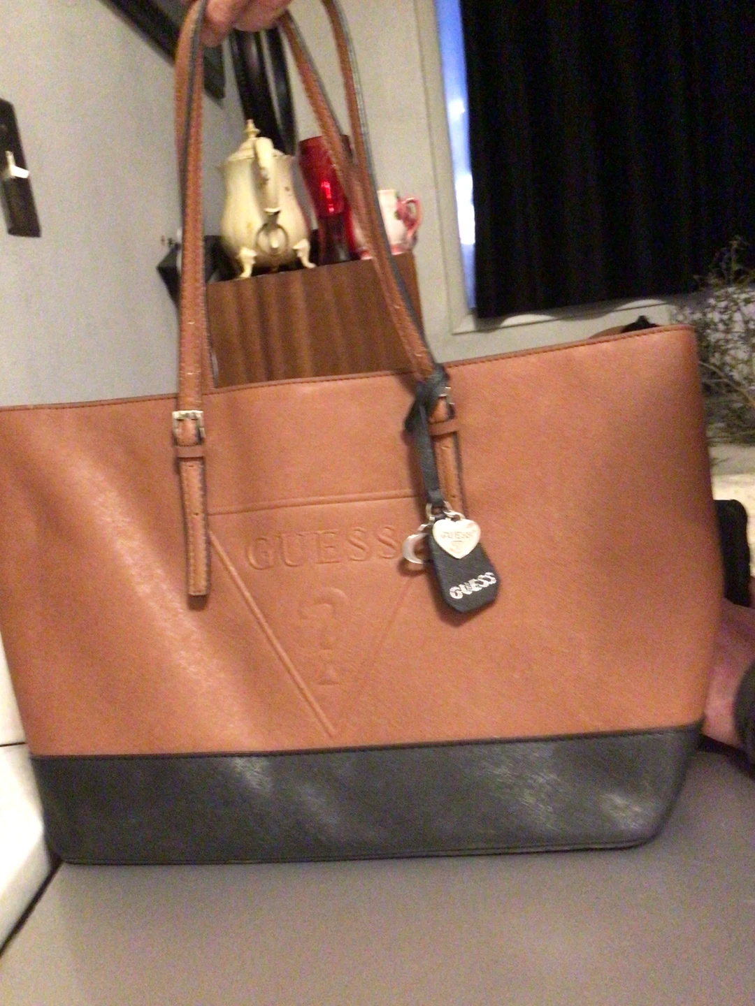 Selling a Guess tote bag in a lovely brown colour! It's in good condition and perfect for everyday use. It features the Guess logo and a heart-shaped charm. The interior lining has the Guess logo pattern as well