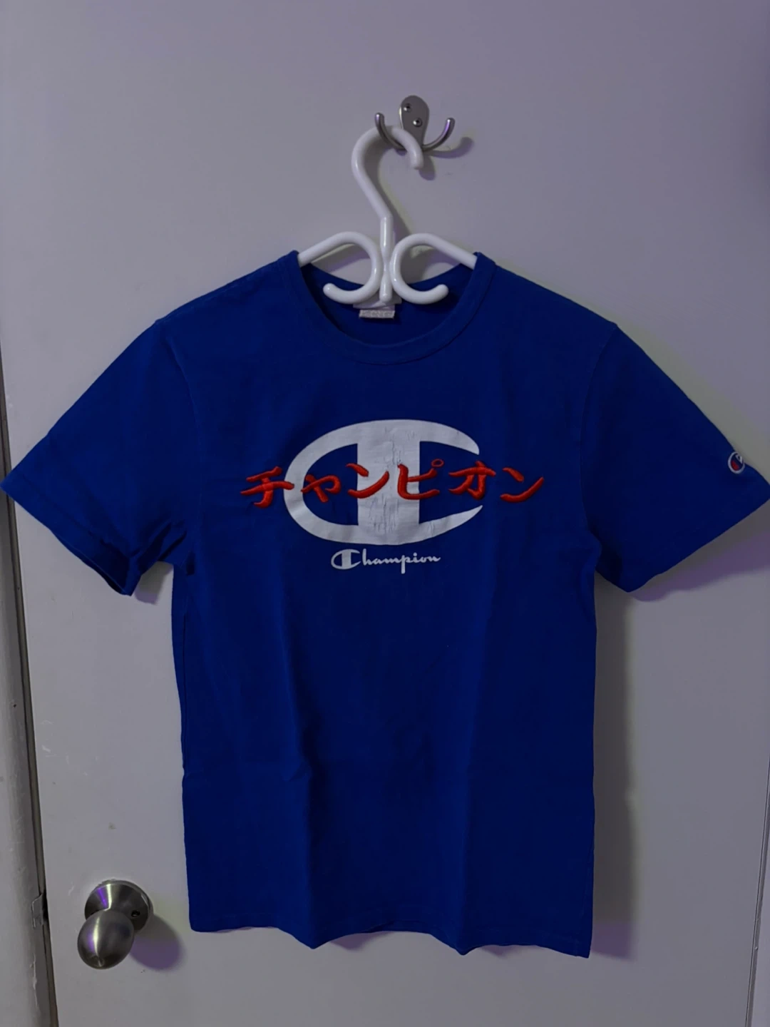 Selling a Champion blue t-shirt. The shirt features the Champion logo with Japanese text above it. It's in great condition and ready for a new owner!