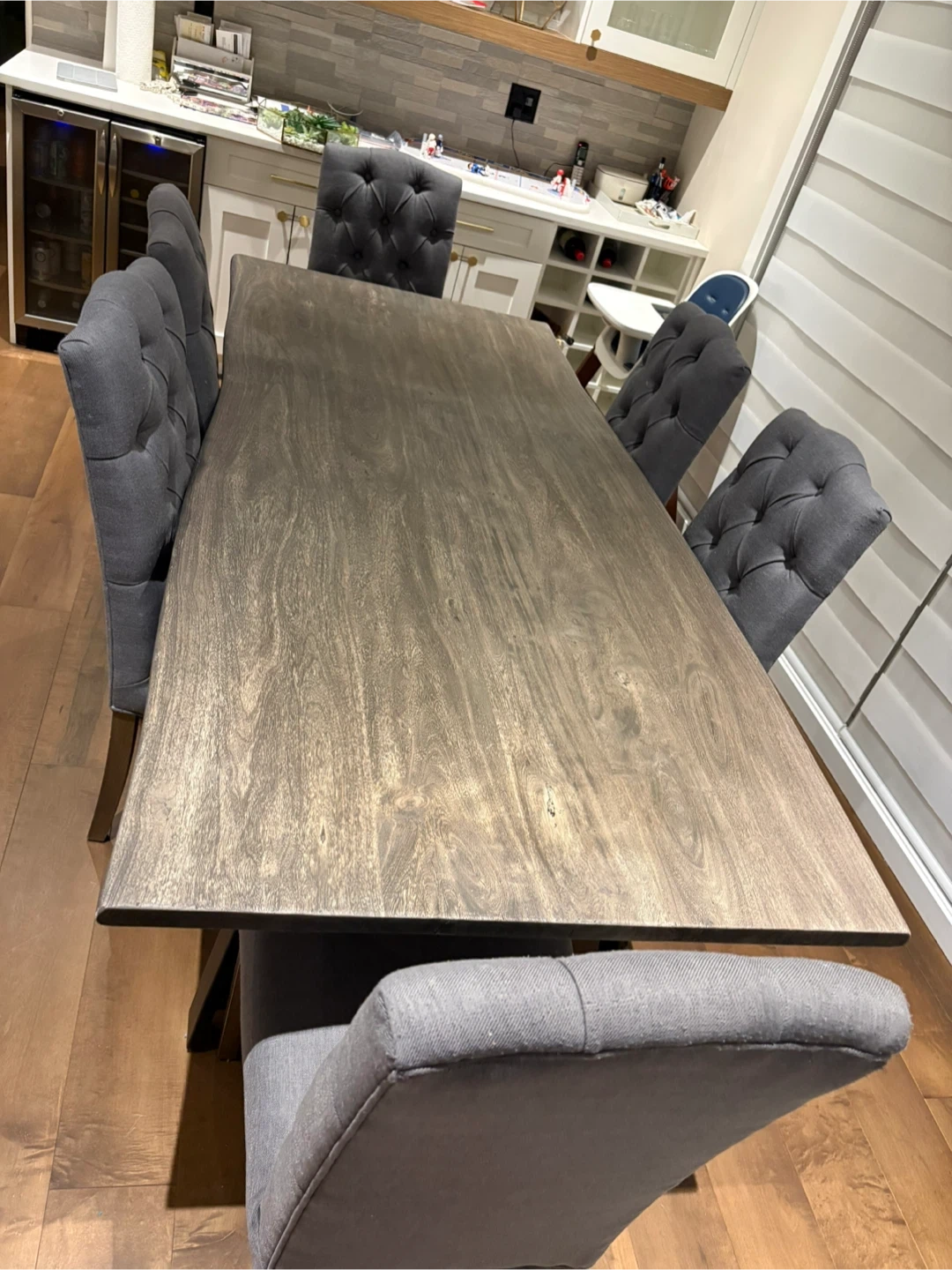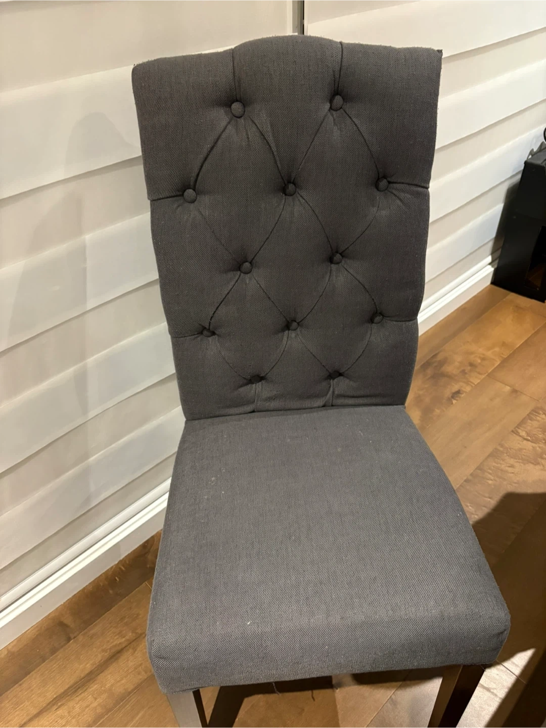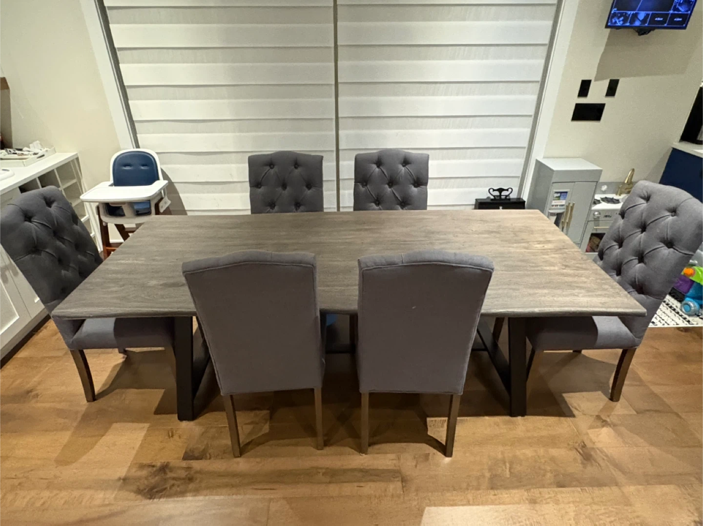 Selling a dining table with six stylish grey tufted chairs. The set is in good condition and would look great in any dining room. The chairs feature a classic tufted design that adds a touches of elegance to your space. If you're interested, send me a message!