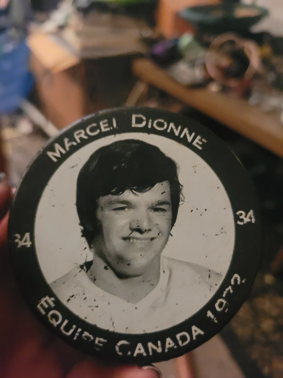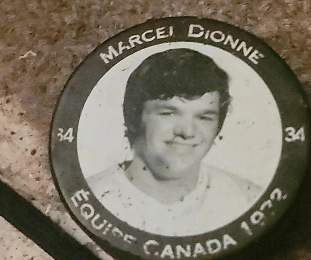 Selling a Marcel Dionne Equipe Canada 1972 hockey puck. It features a picture of Marcel Dionne. The puck also has the Equipe Canada logo and the year 1972 on it