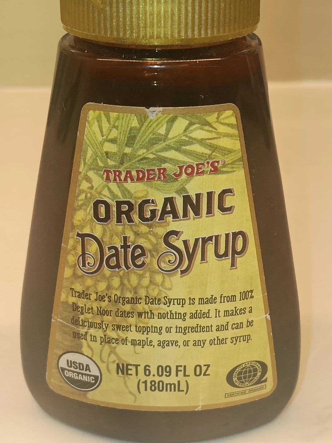 Trader Joe's Organic Date Syrup is made from 100% Deglet Noor dates with nothing added. It makes a deliciously sweet topping or ingredient and can be used in place of maple, agave, or any other syrup. The net content is 6.09 FL OZ (180mL). The best by date is 2024 November 05