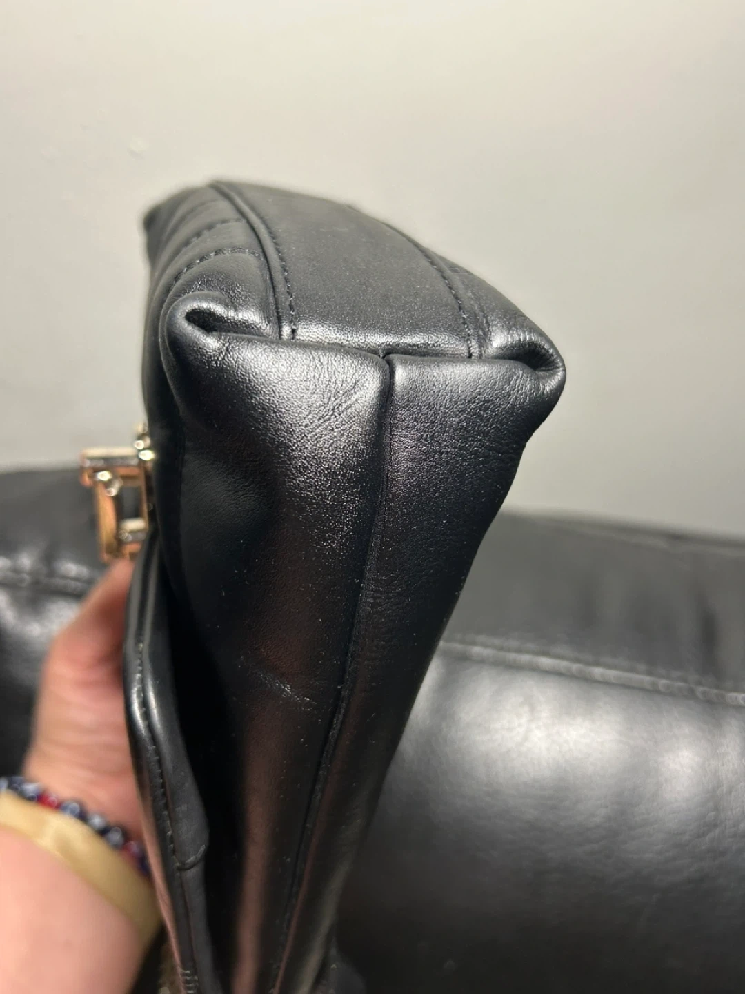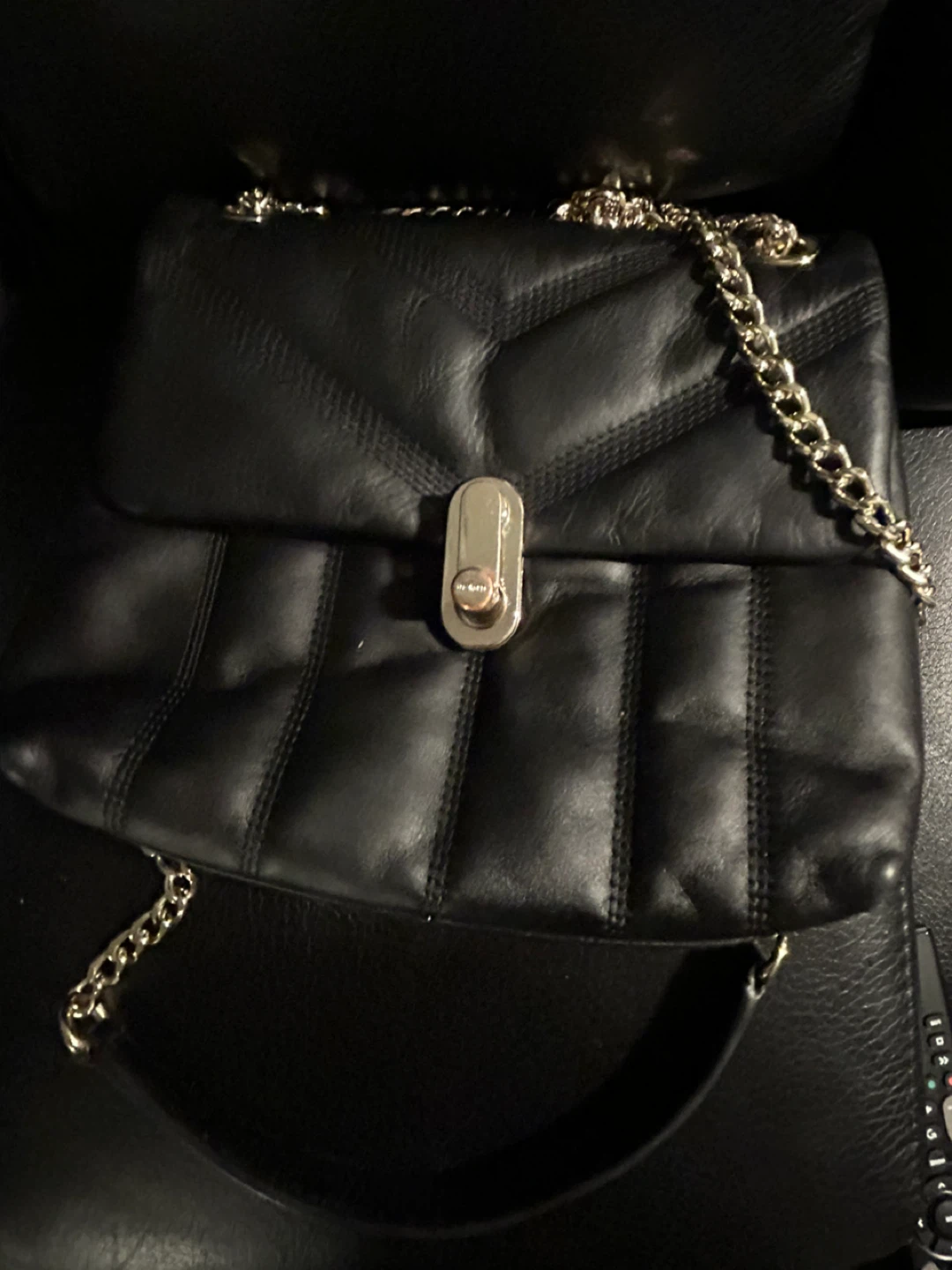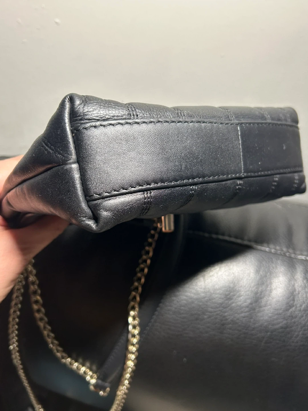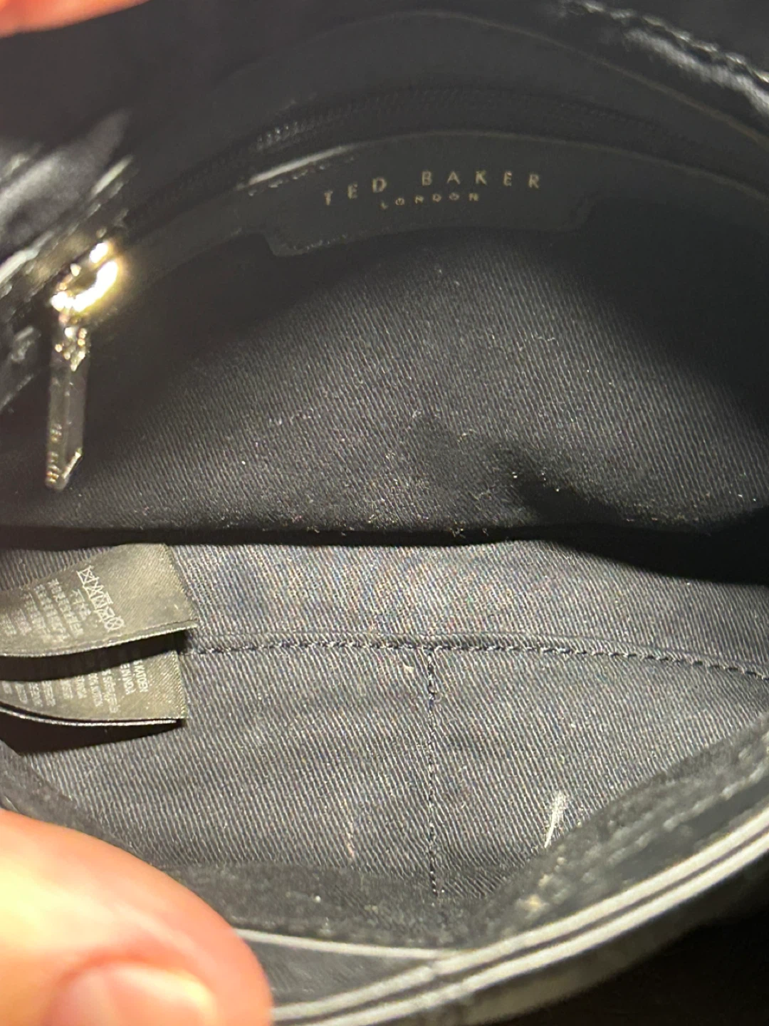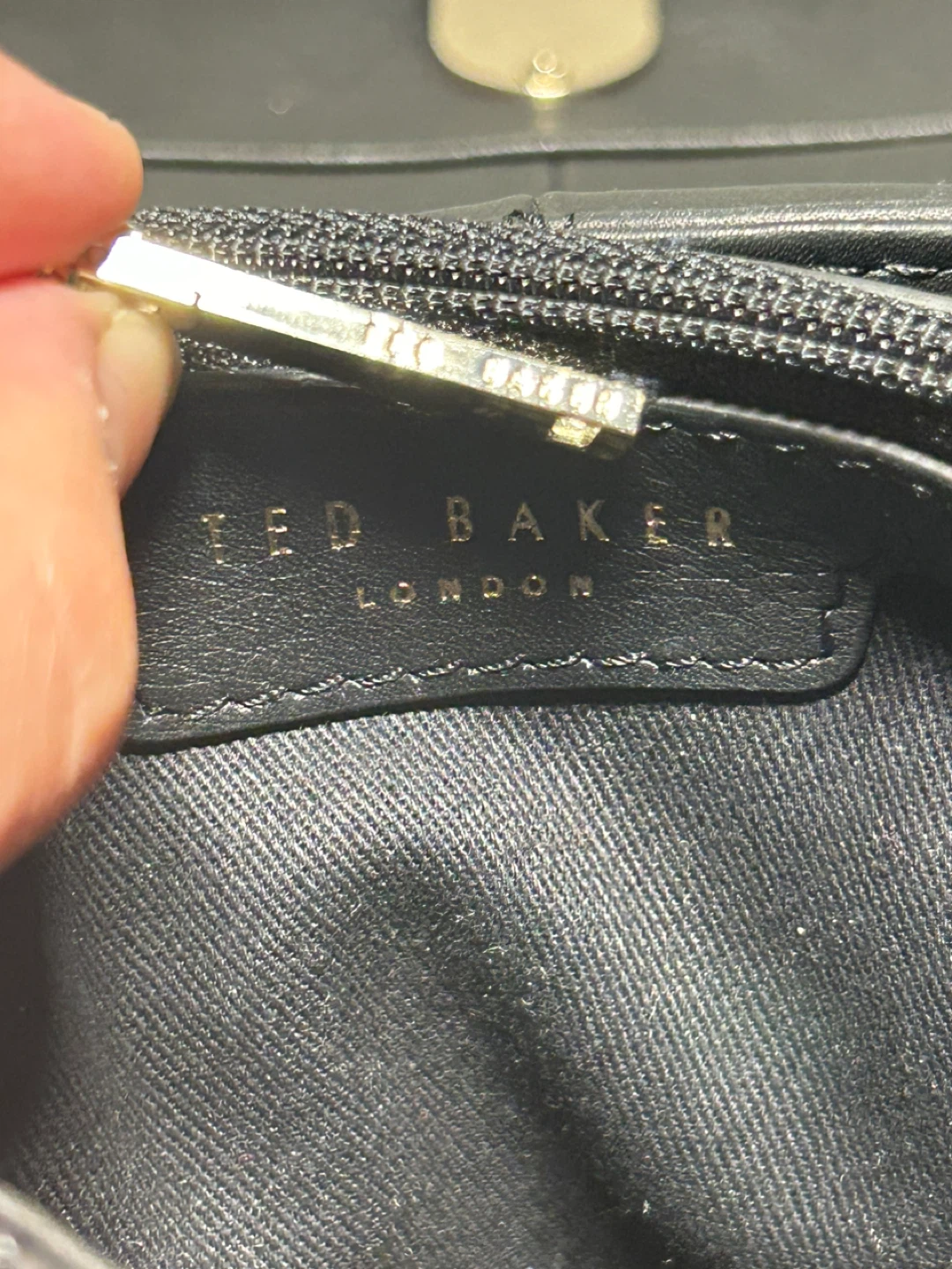 Selling a lovely black leather shoulder bag from Ted Baker. It's in great condition and would be perfect for everyday use or a night out! The chain detailing adds a touch of elegance, and the interior is nice and clean. It's in very good condition; the only issue is that the small plate has lost its gold color. 22 cm wide x 15 cm high. I invite you to view my other items; if you are interested in any of them, I will give you a better price.