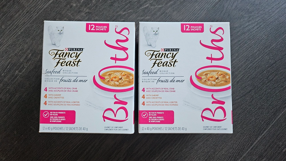 Selling two boxes of Purina Fancy Feast Seafood Broths for cats! Each box contains 12 pouches of gourmet cat complement, with accents of real crab, shrimp, and lobster. Your kitty will love this bisque collection!