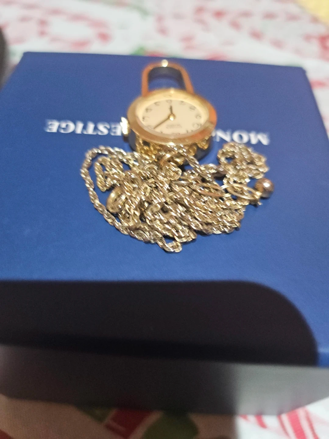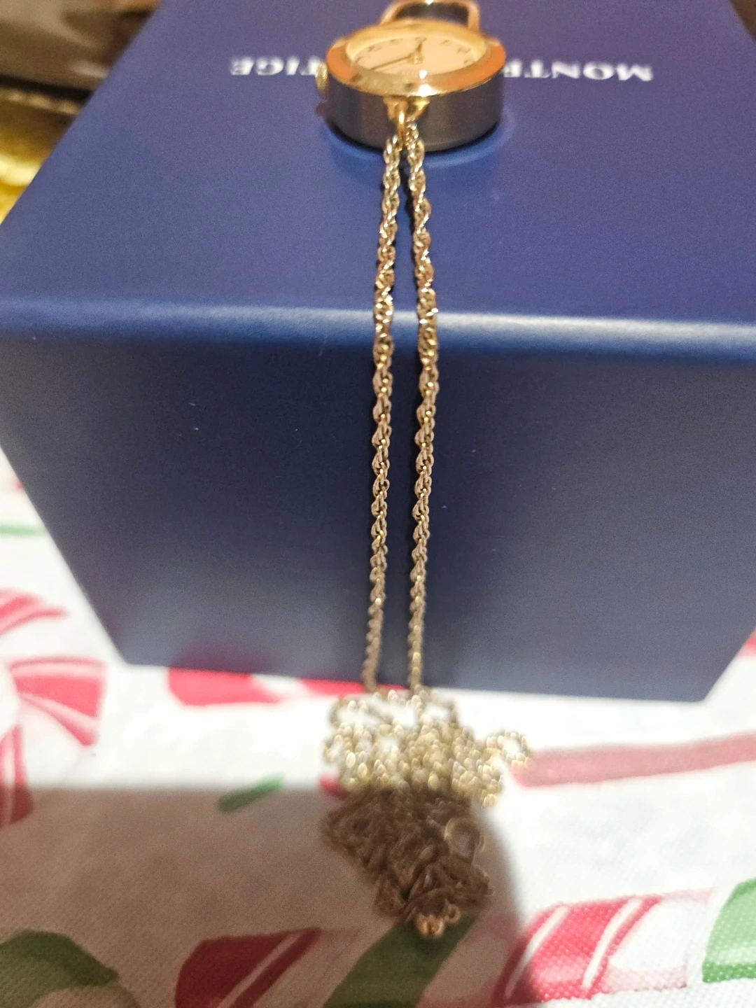 Selling a Montega necklace watch with a gold-tone finish. It's a unique and stylish piece that can be worn as a necklace and used as a functional watch. The watch face is easy to read, and the chain is a nice length. Perfect for adding a touch of elegance to any outfit!