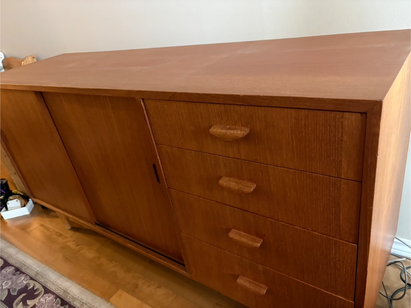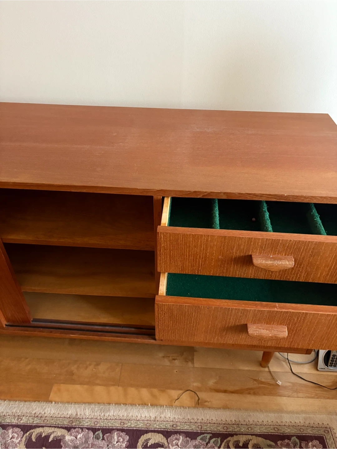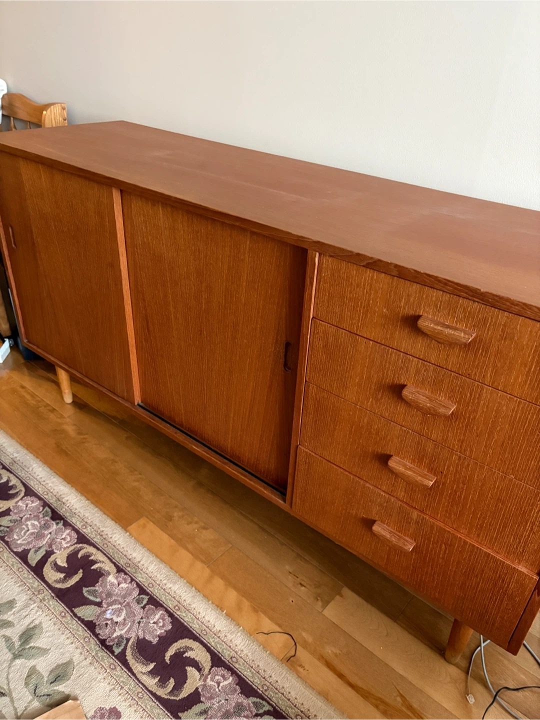 Offering a vintage 60s original family owned Teak wooden credenza sideboard. It features sliding doors and drawers for many storage options. Warm deep teak colour.