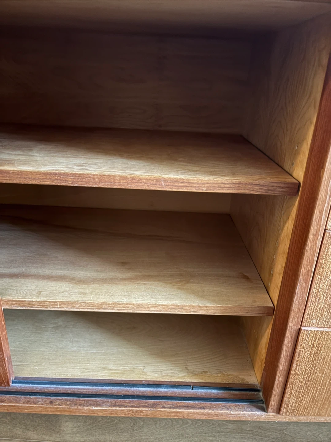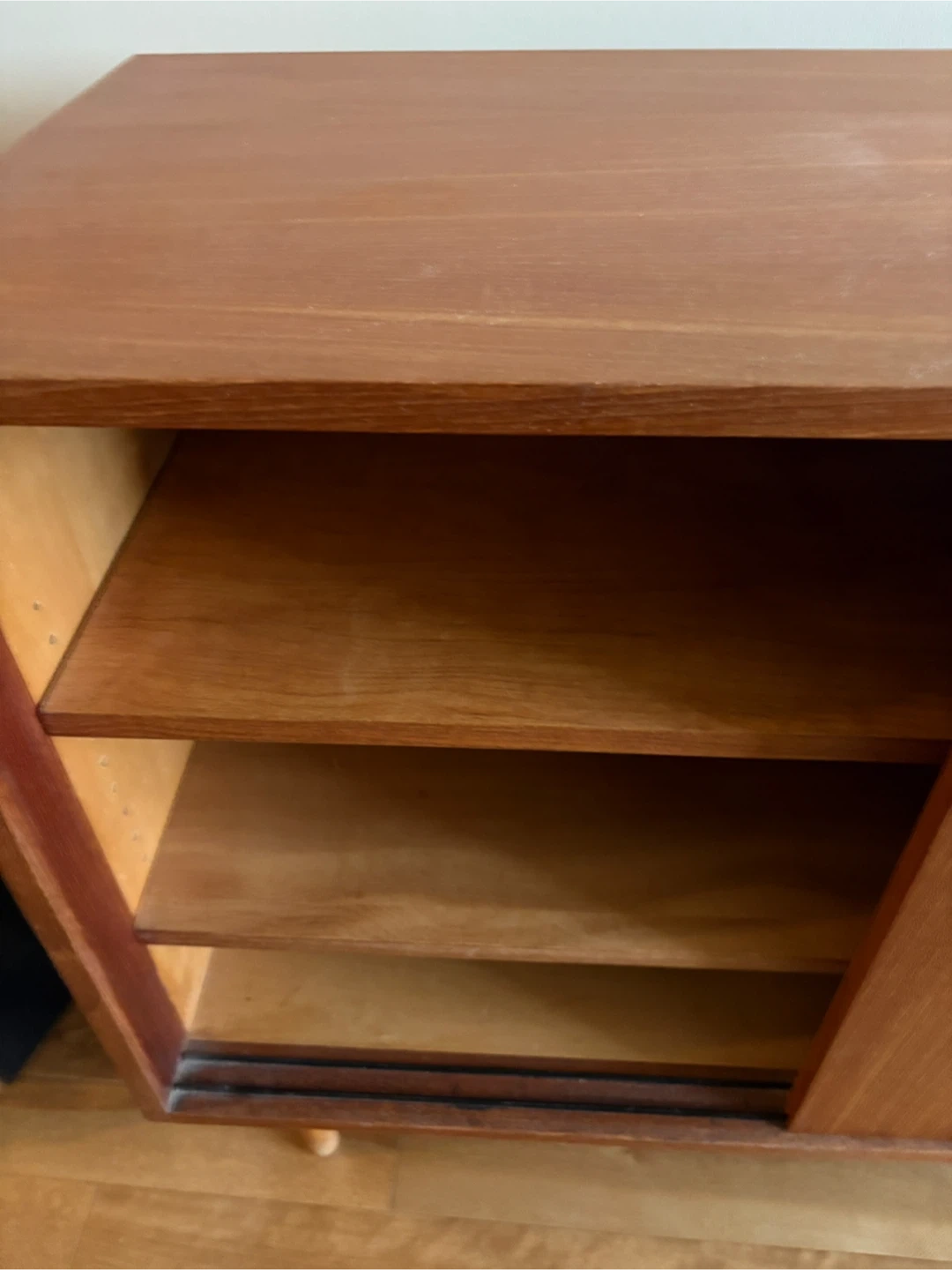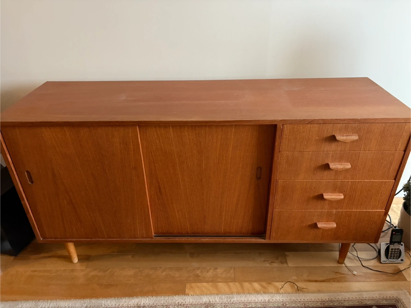 Offering a vintage 60s original family owned Teak wooden credenza sideboard. It features sliding doors and drawers for many storage options. Warm deep teak colour.