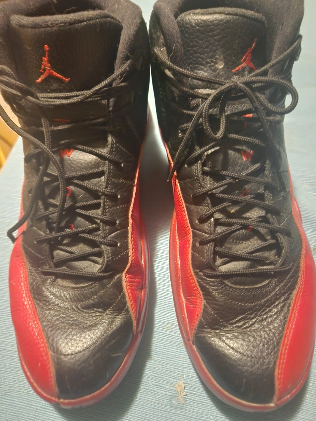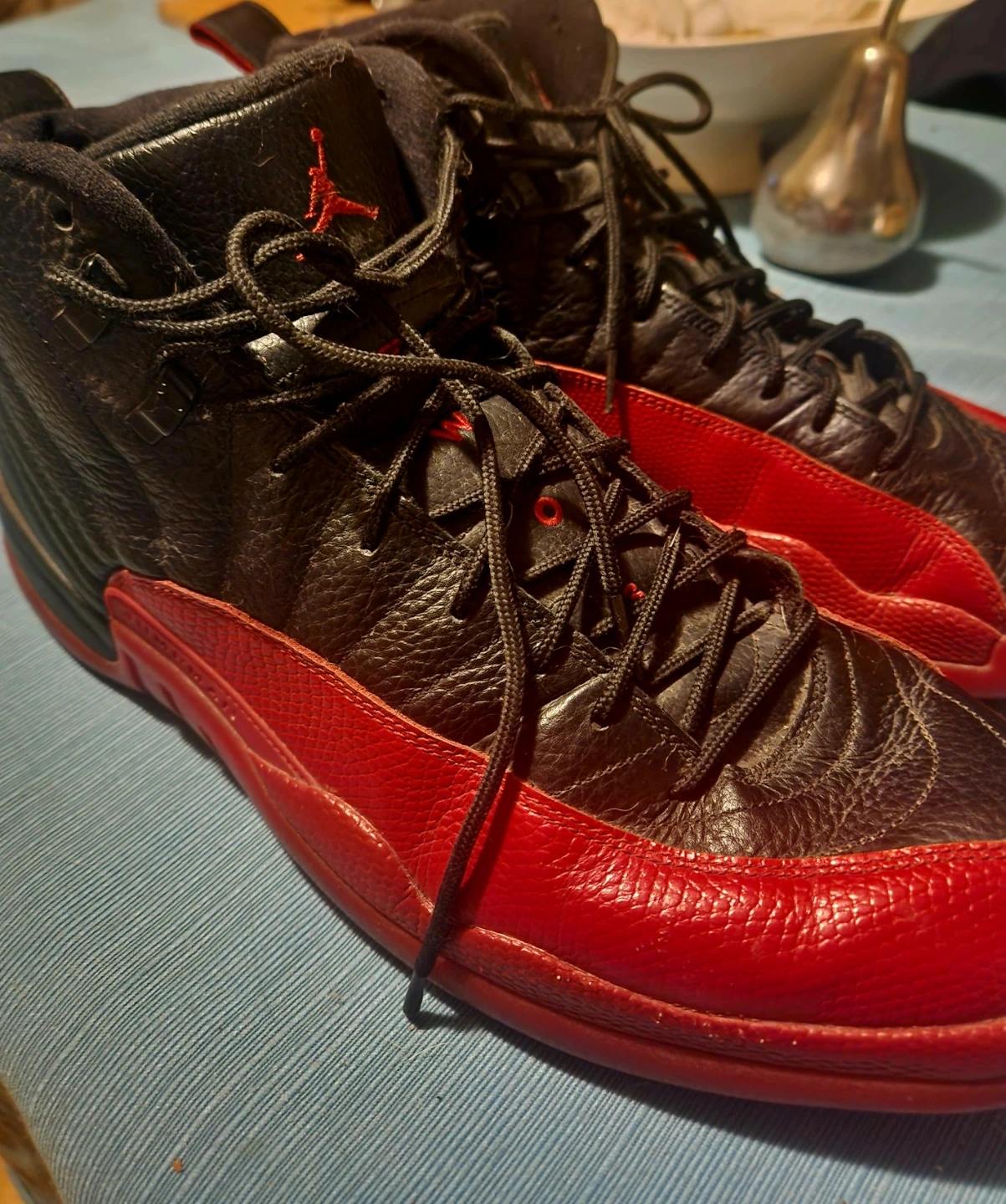 Selling a pair of Air Jordan 12 Retro "Flu. They are black and red. Please see photos for condition