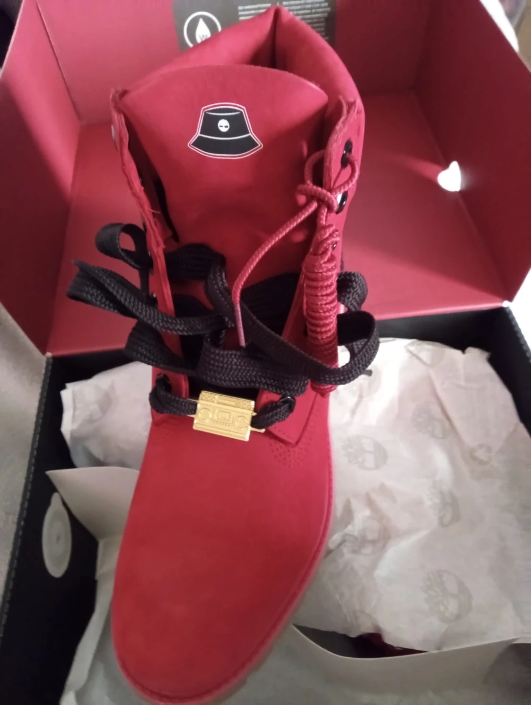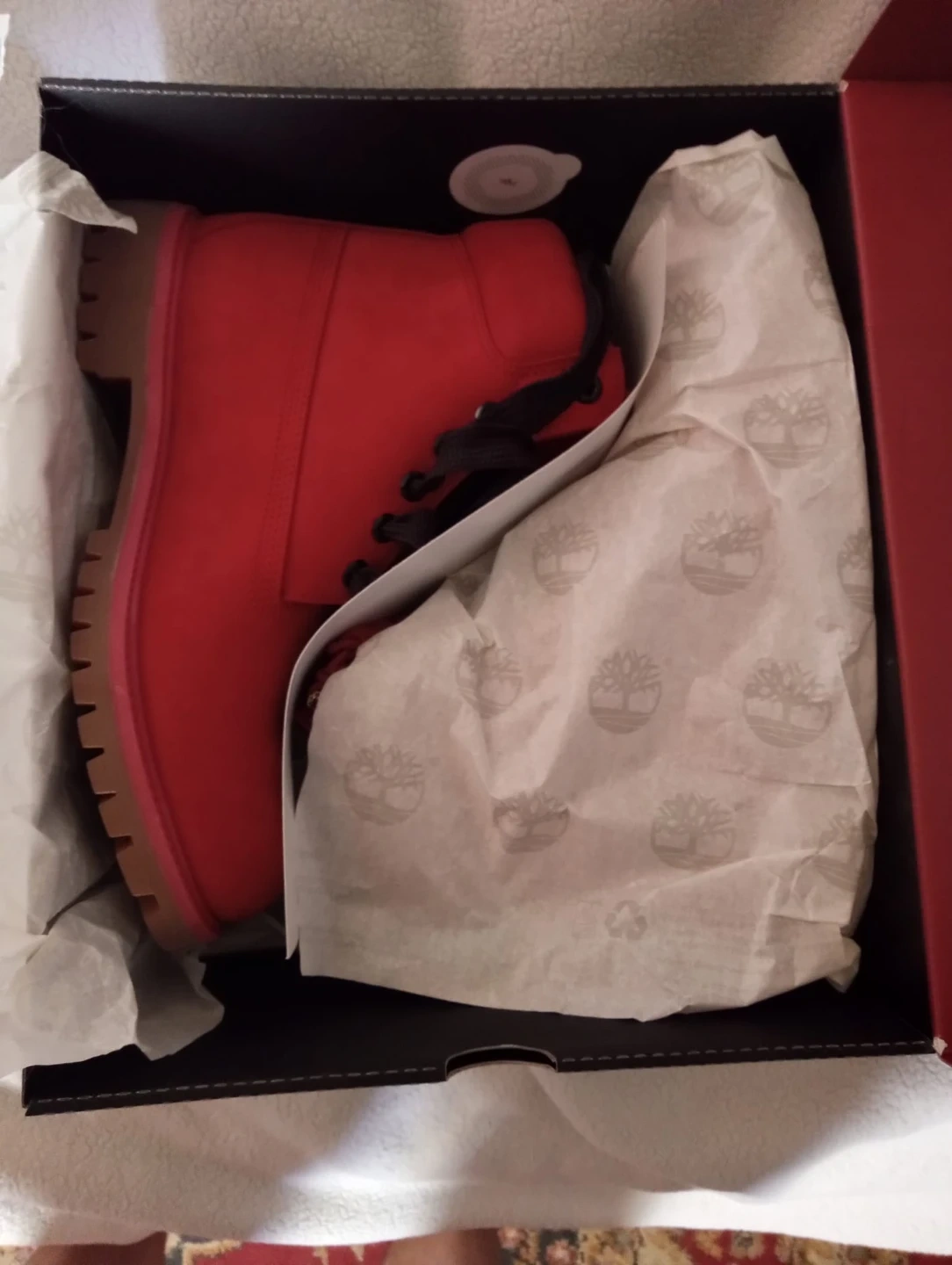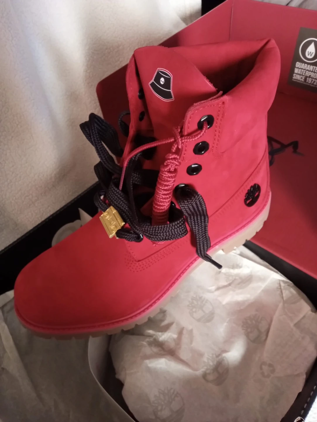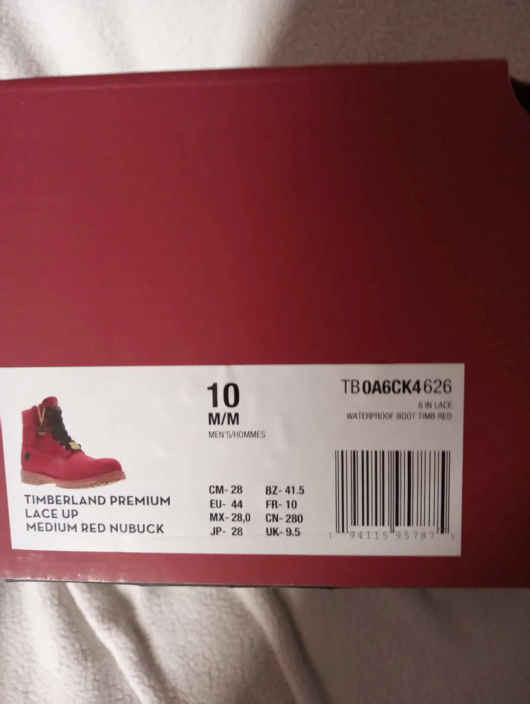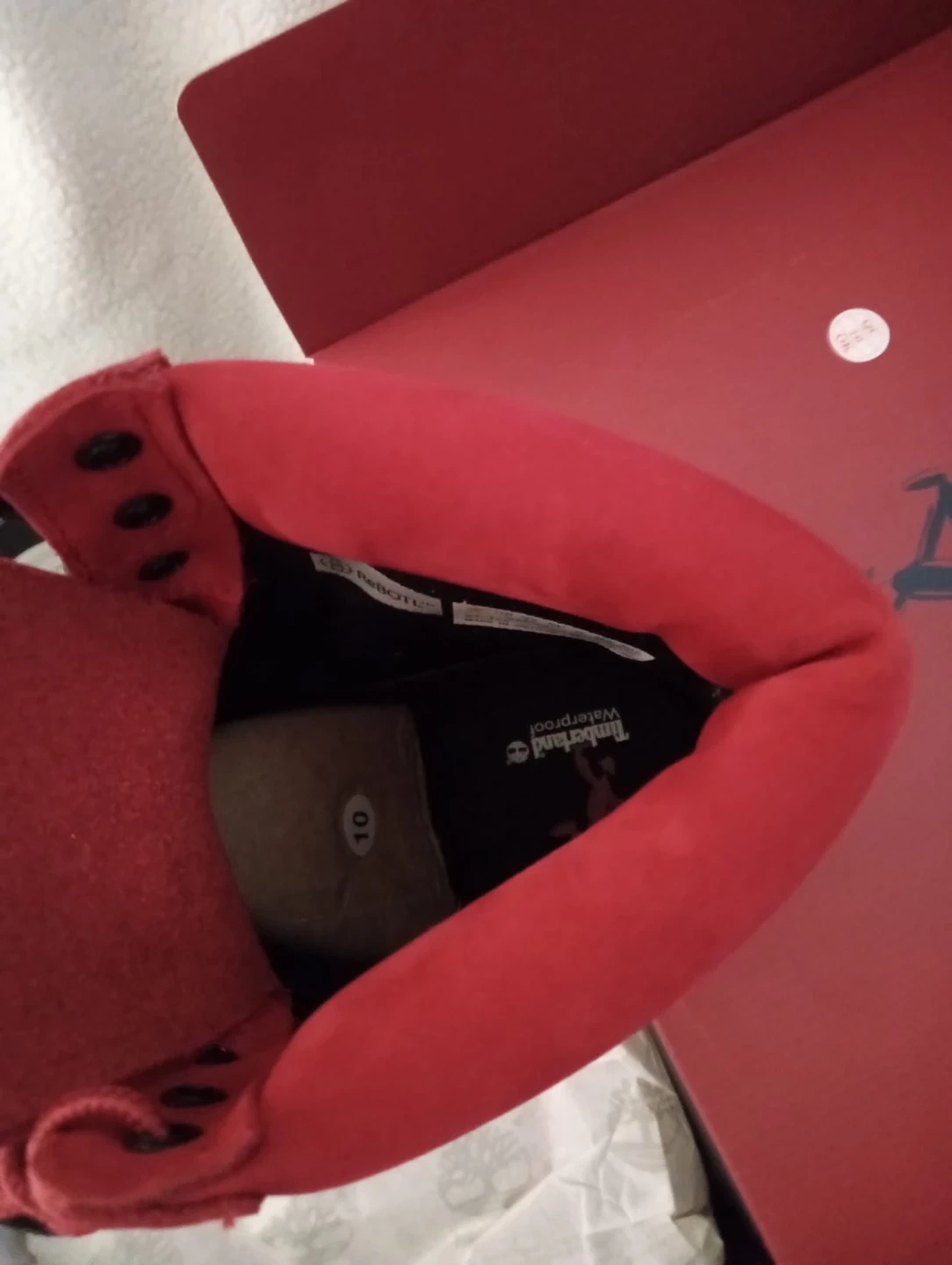 Selling a pair of Timberland Premium Lace Up Boots in men's size 10. They come in a medium red nubuck color and are waterproof. Includes the original box $200