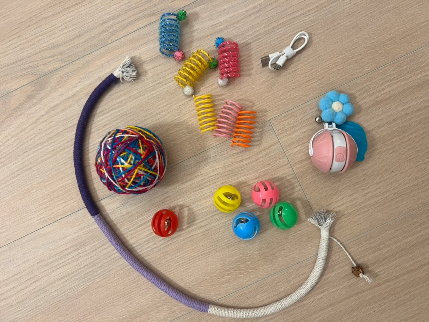 Selling a variety of cat toys to keep your furry friend entertained! Includes colourful balls with bells, fun springs, a rope toy, and an interactive ball with a flower. Perfect for playtime!