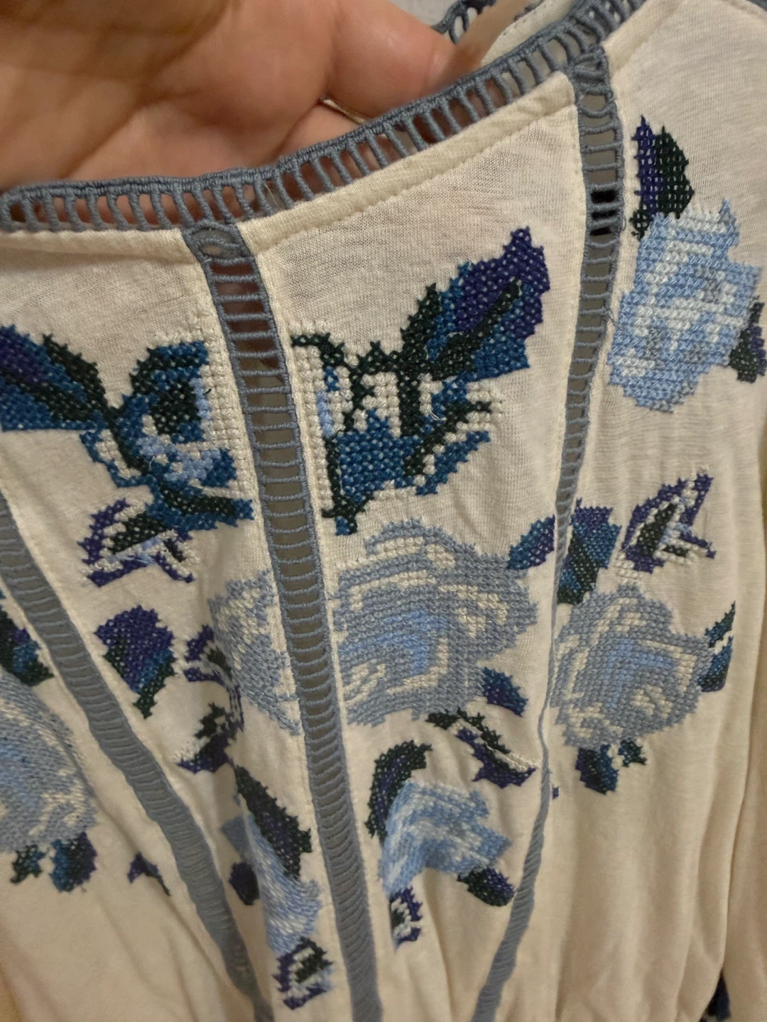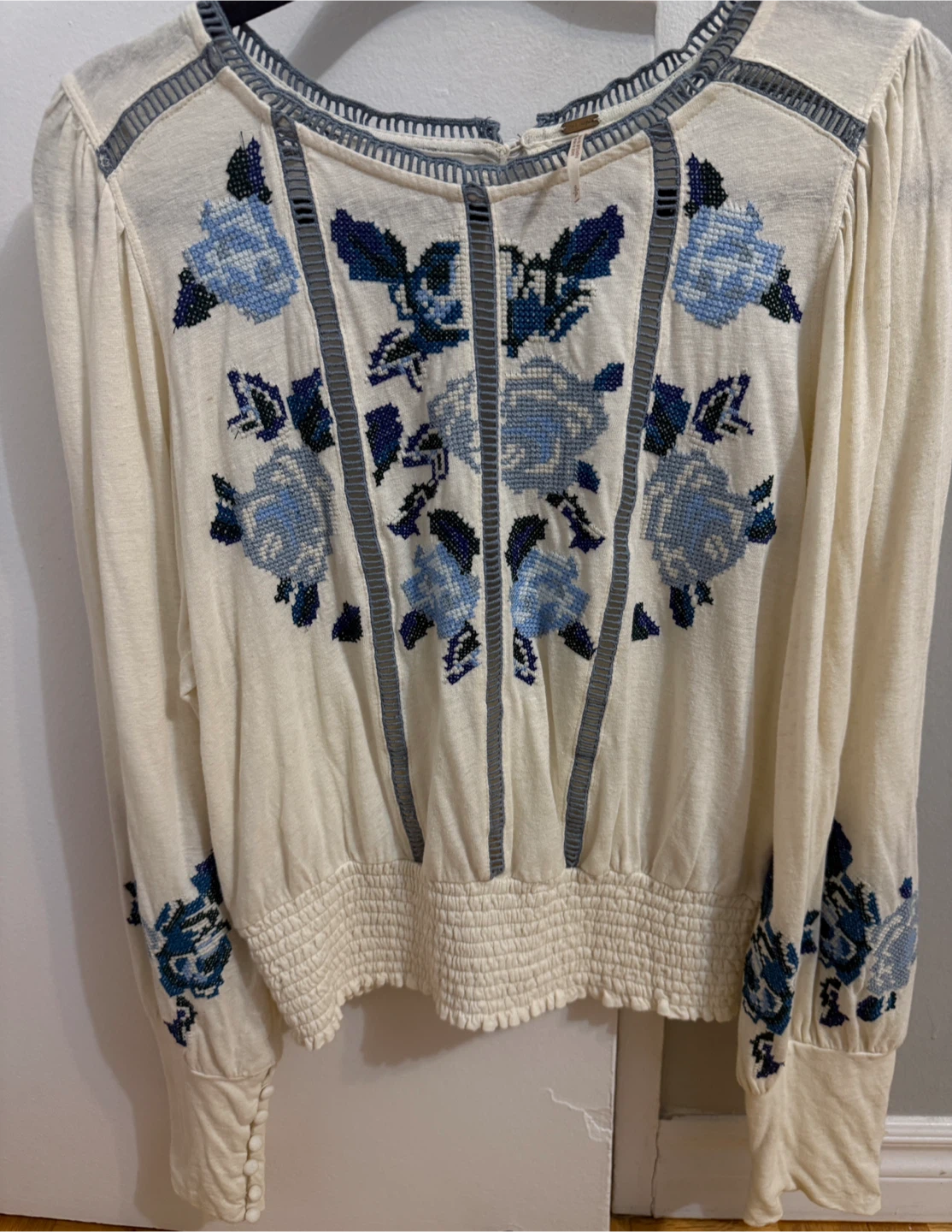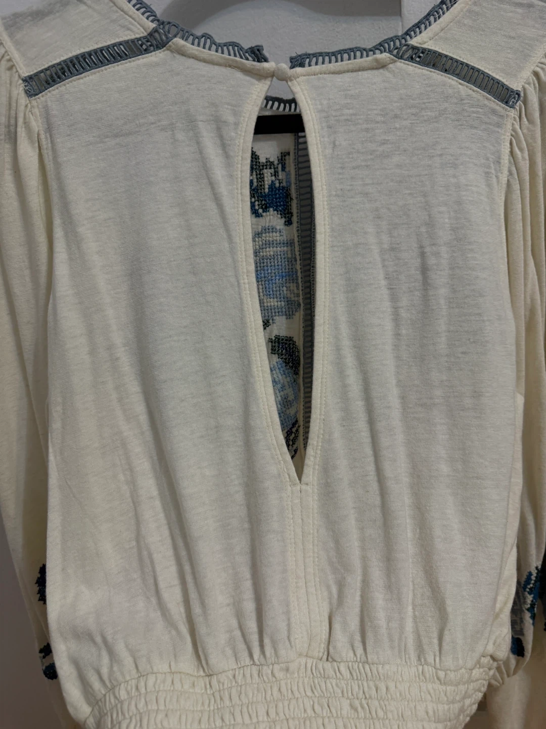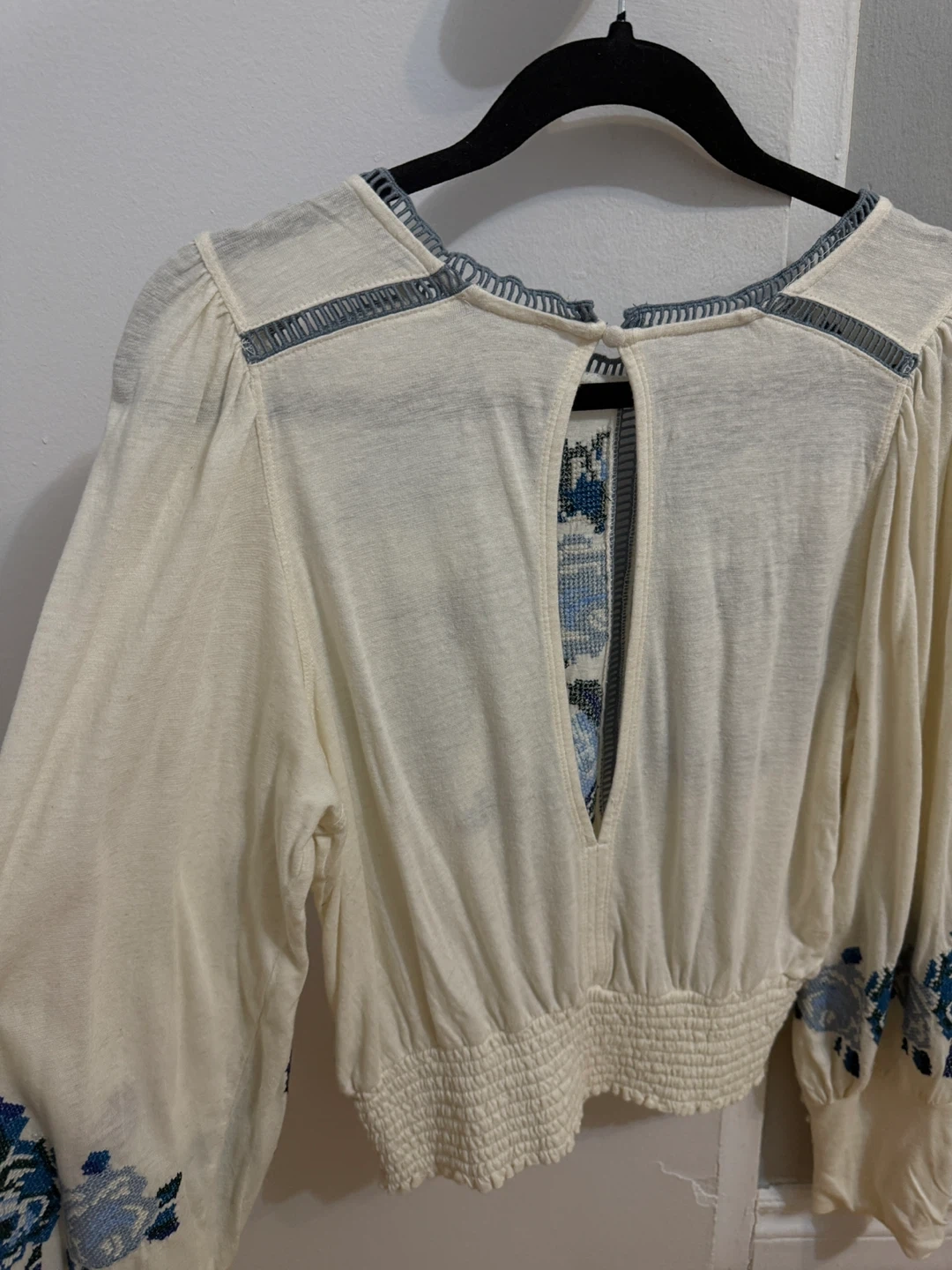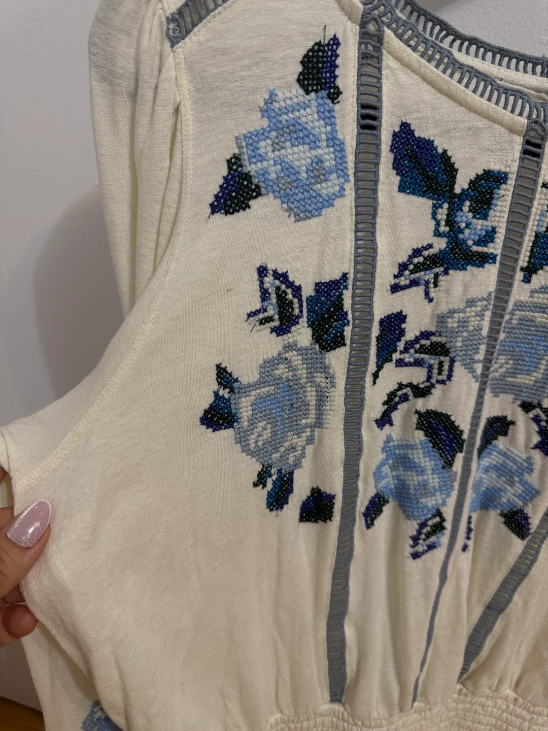 This Free People top features beautiful blue floral embroidery on a cream-coloured background. It's a size small and in great condition. Perfect for adding a touch of bohemian style to your wardrobe! Up to size M