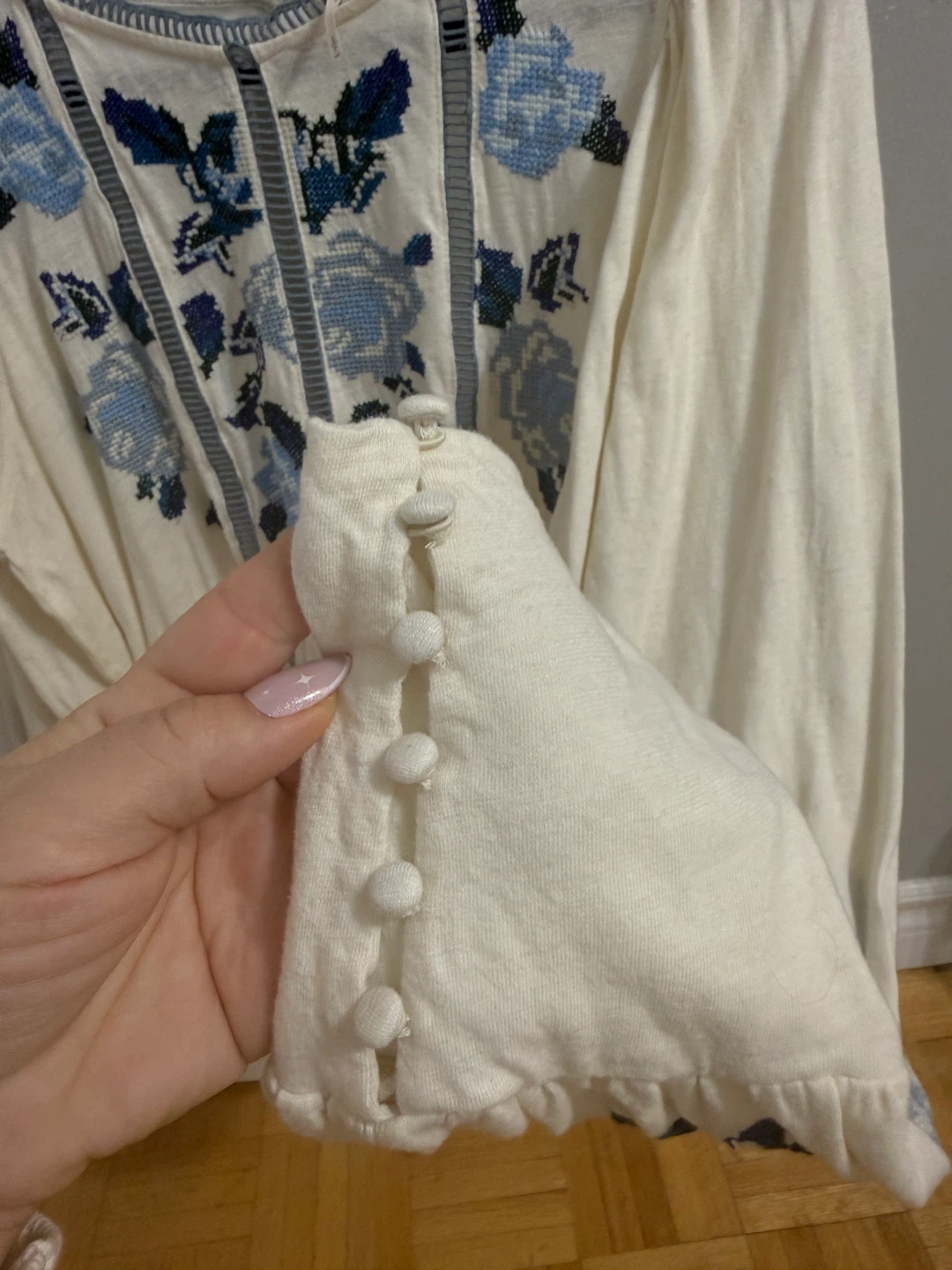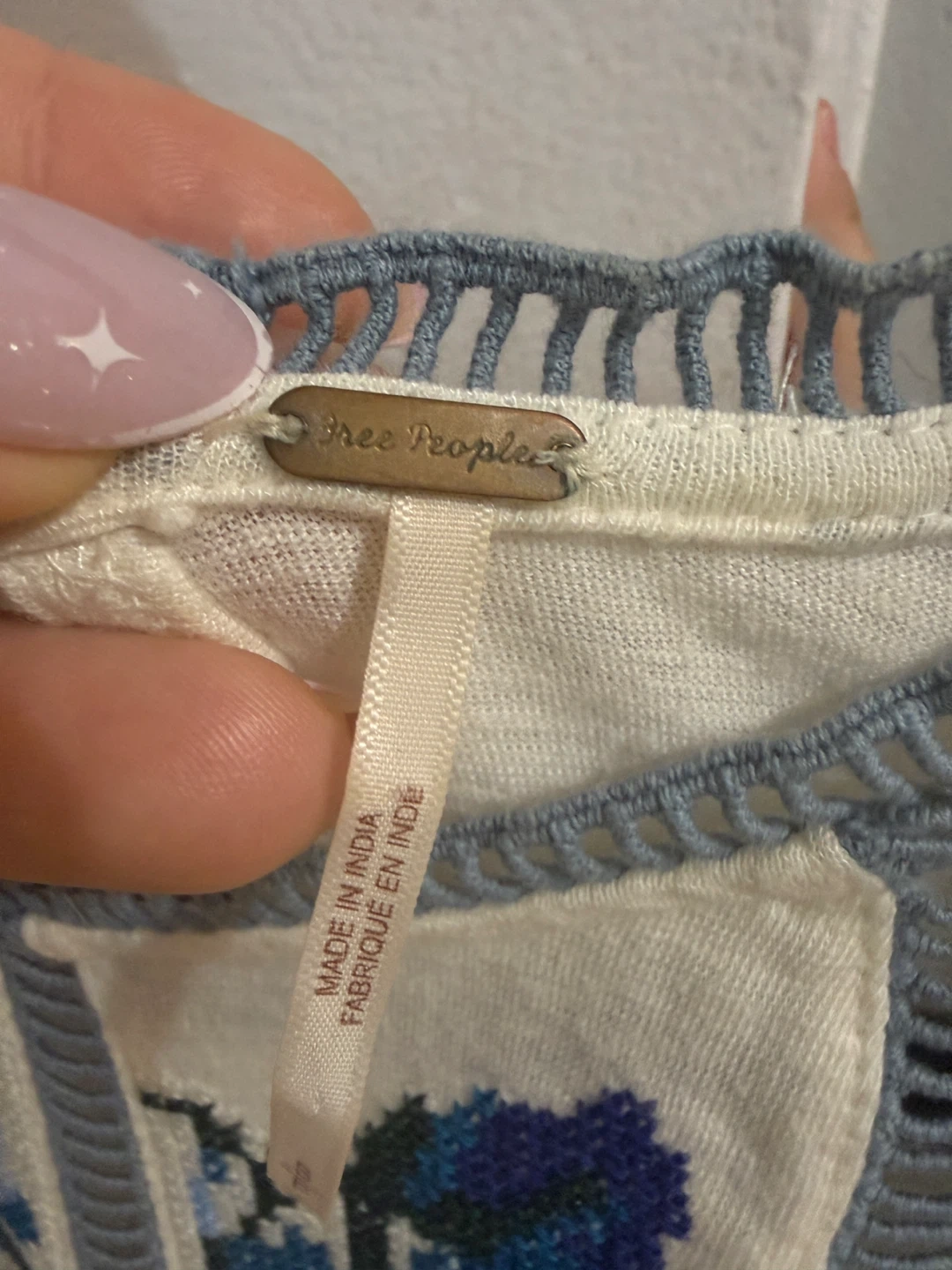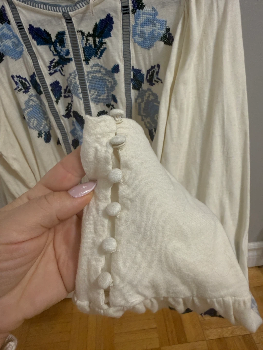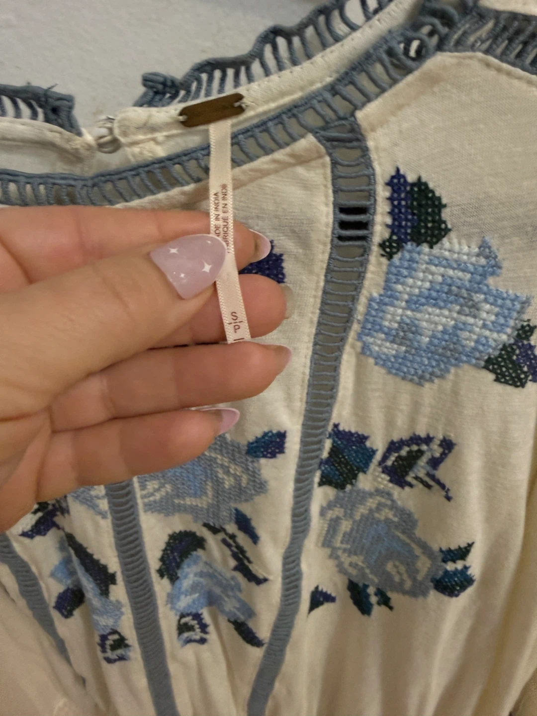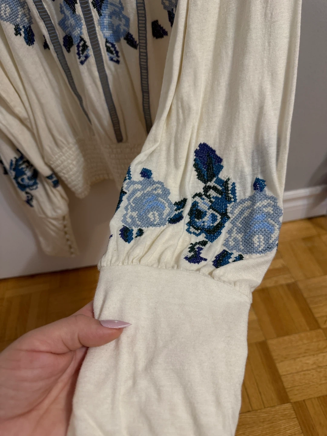 This Free People top features beautiful blue floral embroidery on a cream-coloured background. It's a size small and in great condition. Perfect for adding a touch of bohemian style to your wardrobe! Up to size M