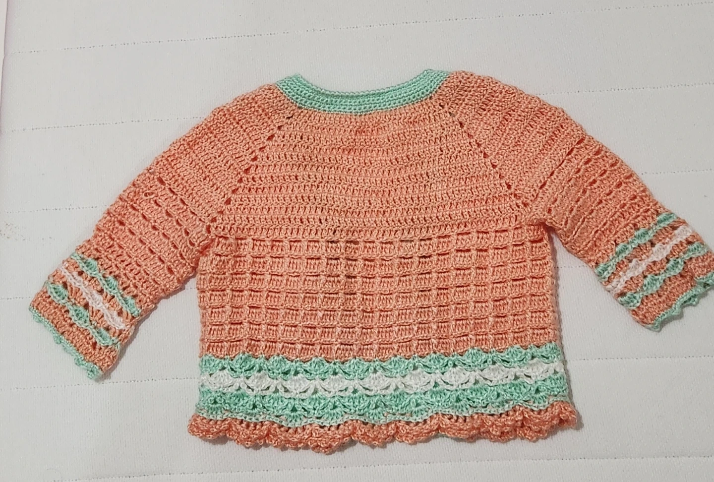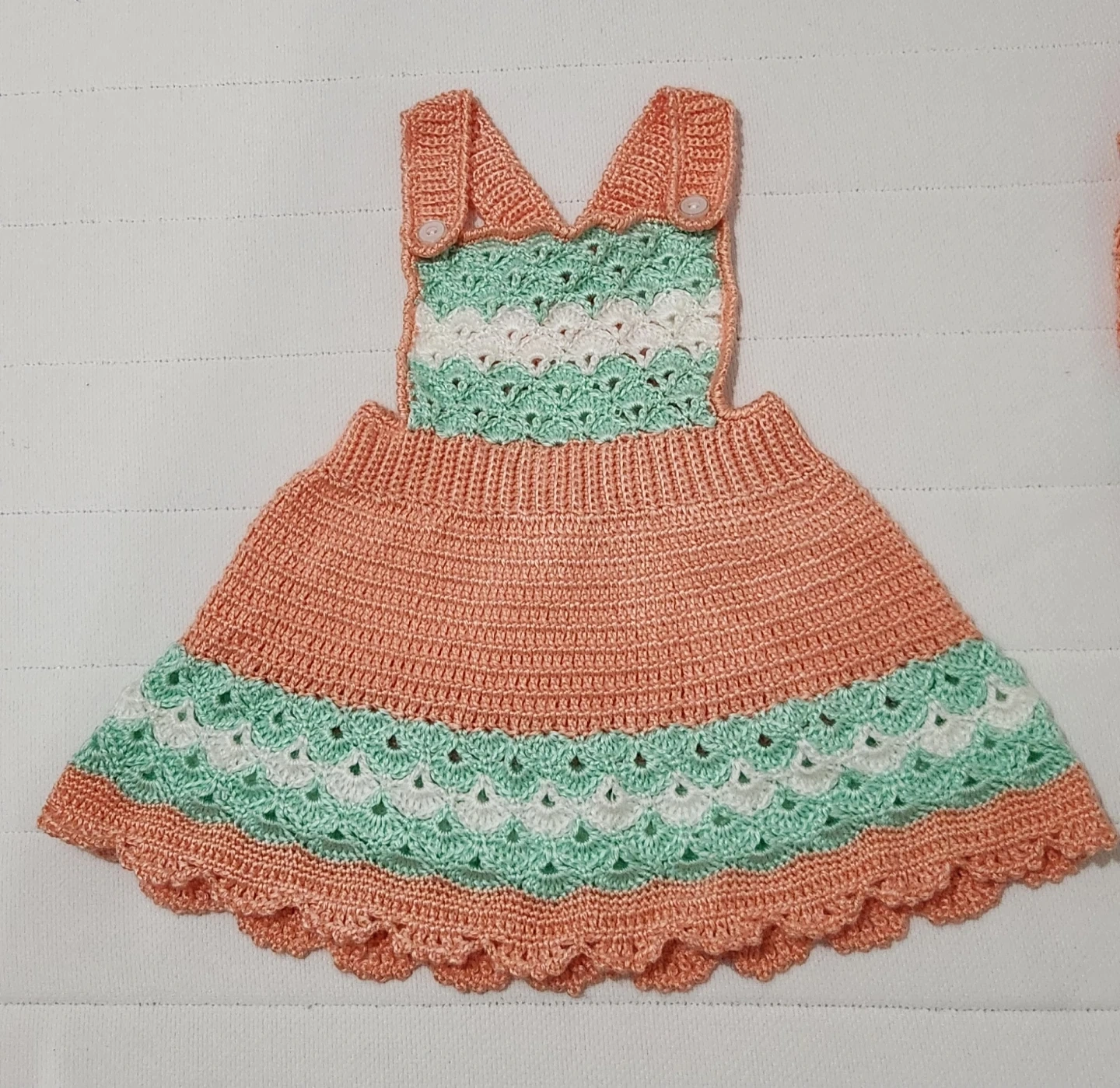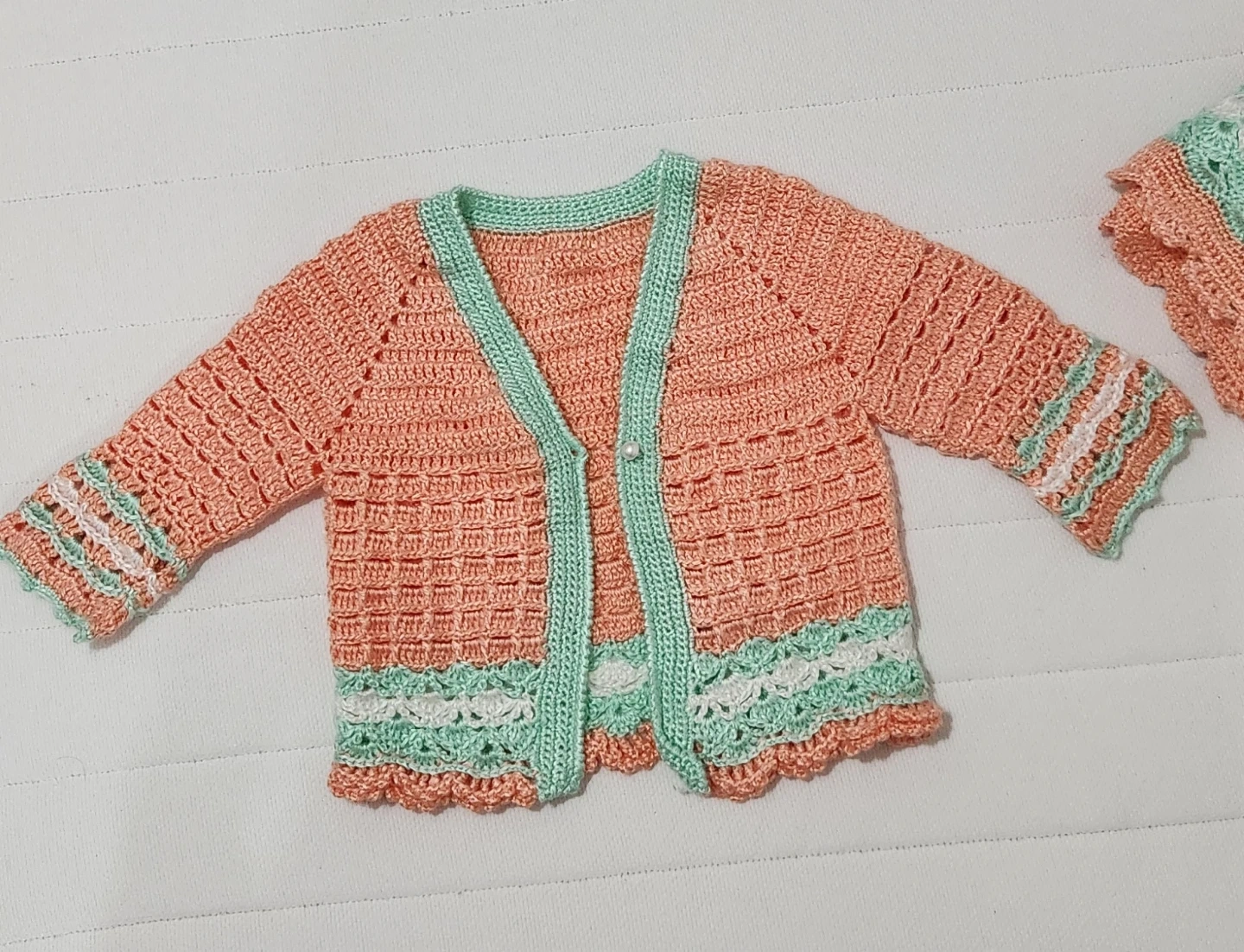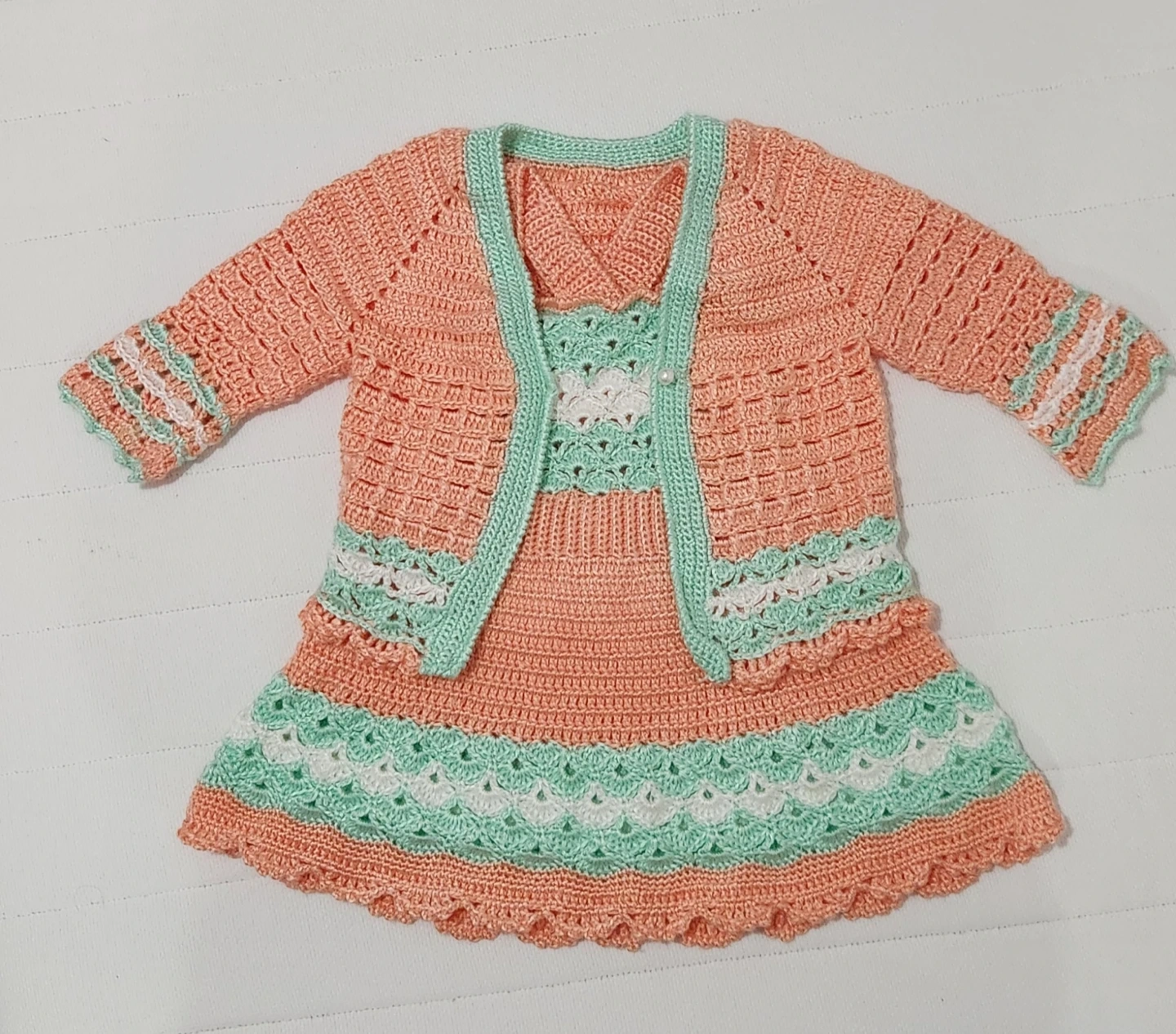 This adorable handmade crochet baby dress and cardigan set is perfect for your little one. The set features a lovely peach colour with mint and white accents. It's carefully crafted with a beautiful crochet pattern. A sweet addition to any baby's wardrobe!