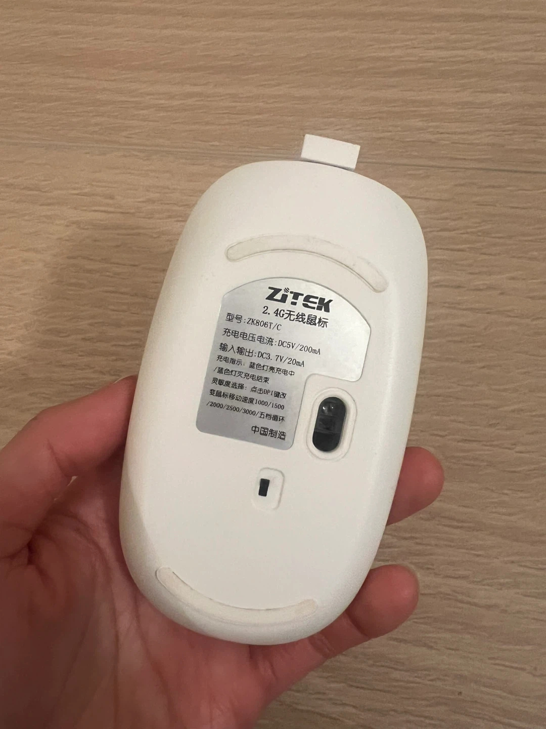 Selling a Ziitek 2.4G wireless mouse, model ZK806T/C. It's in great condition and ready for a new user! The input is DC3.7V/20mA and the charging indicator is a red light when charging. It has DPI speed selection of 1000/1500 and a key life of 2000/5000/5 million times