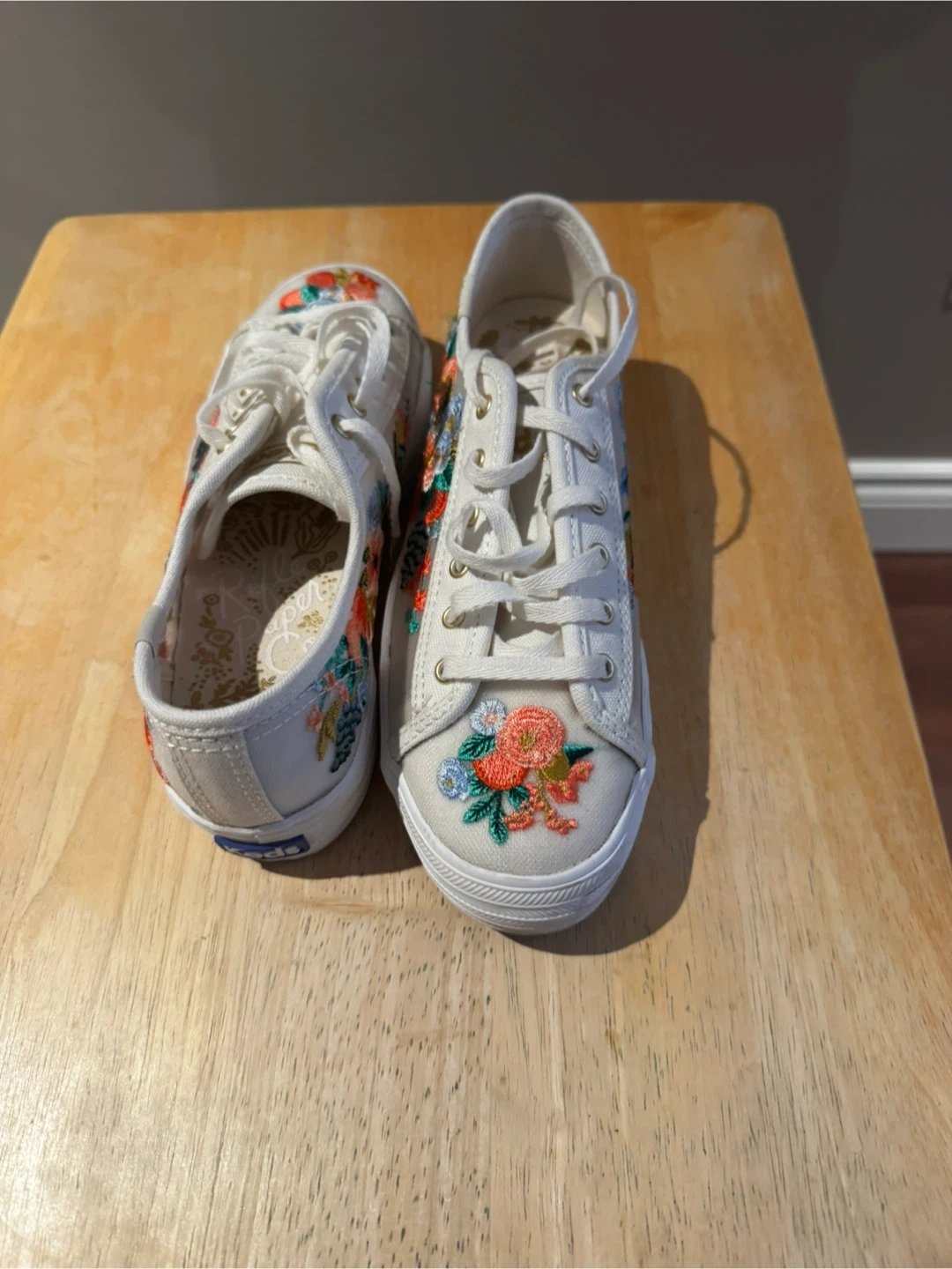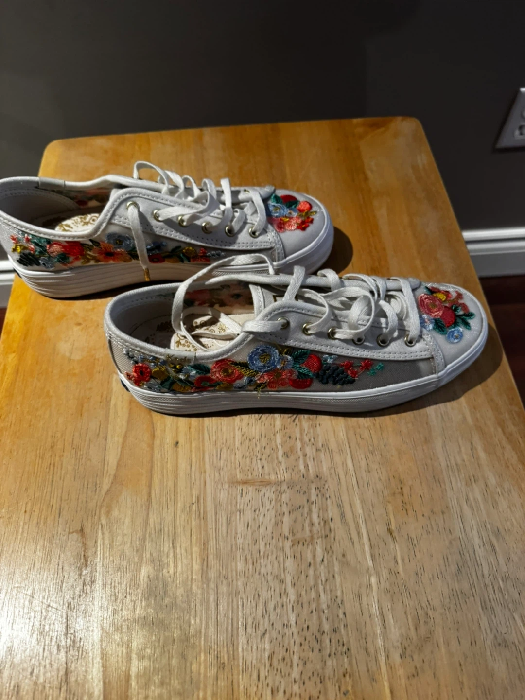 These Keds sneakers are a lovely addition to any wardrobe! They feature a beautiful embroidered floral design on a white canvas. They are a women's size 6. They are in great condition and ready for a new home!