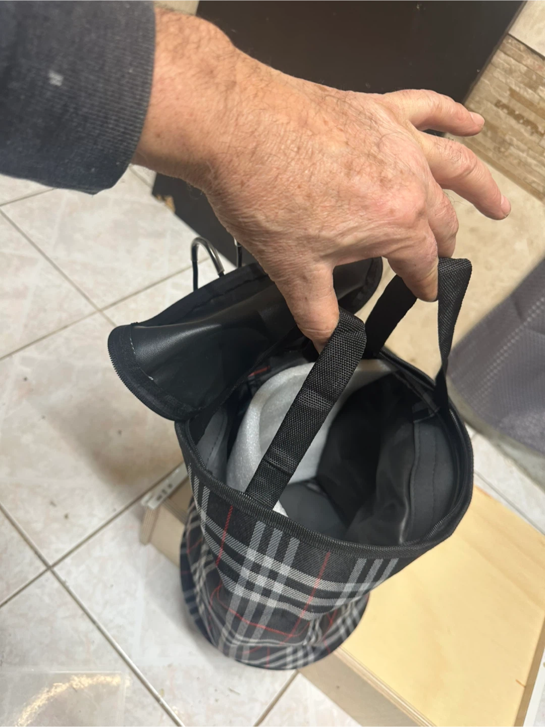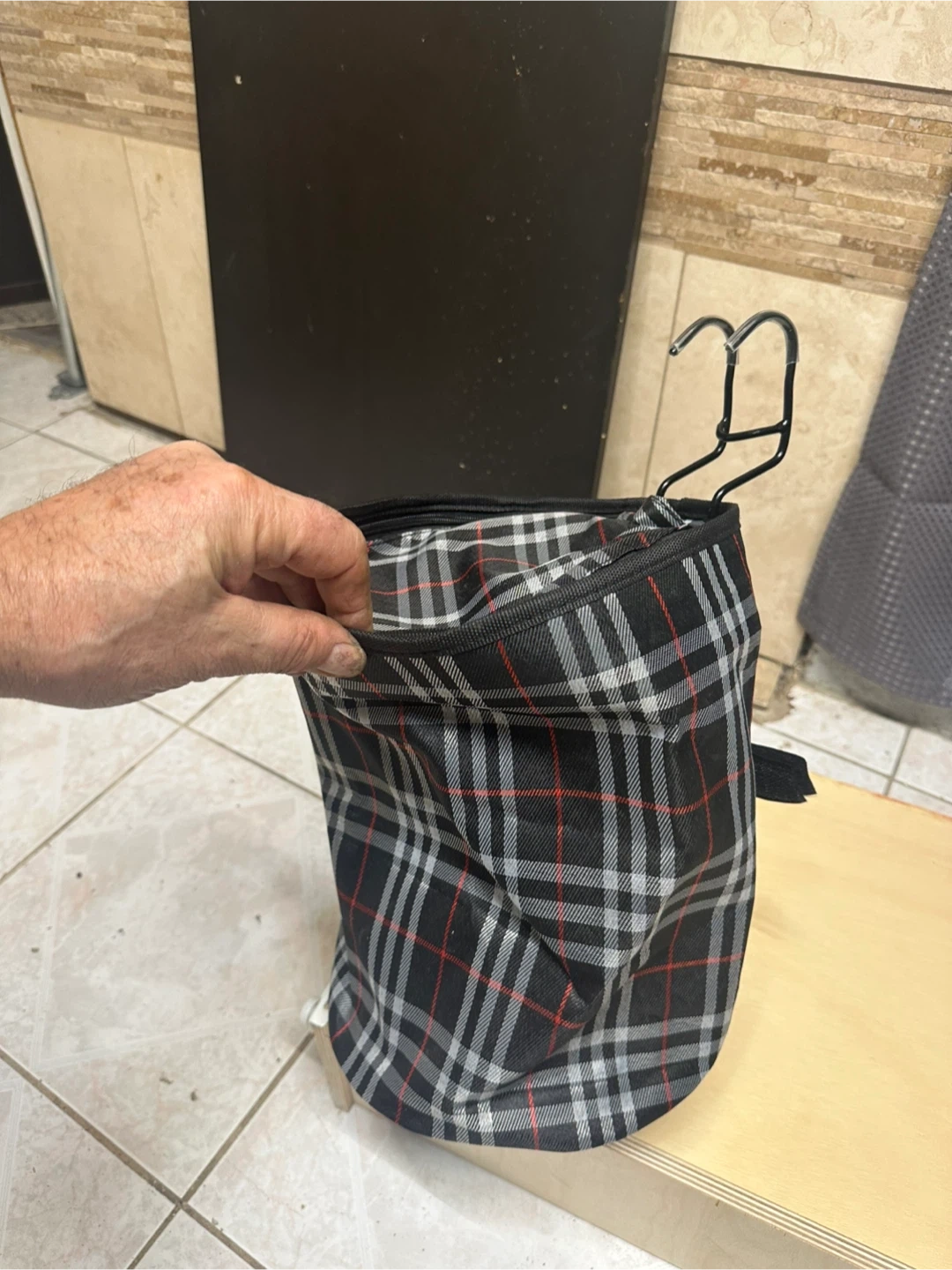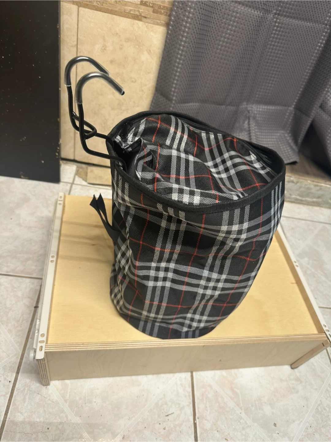 Bike basket with a plaid design. It has a black metal frame and a black interior. Great for carrying groceries or other items while biking around town