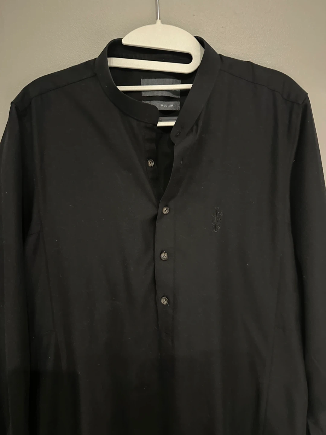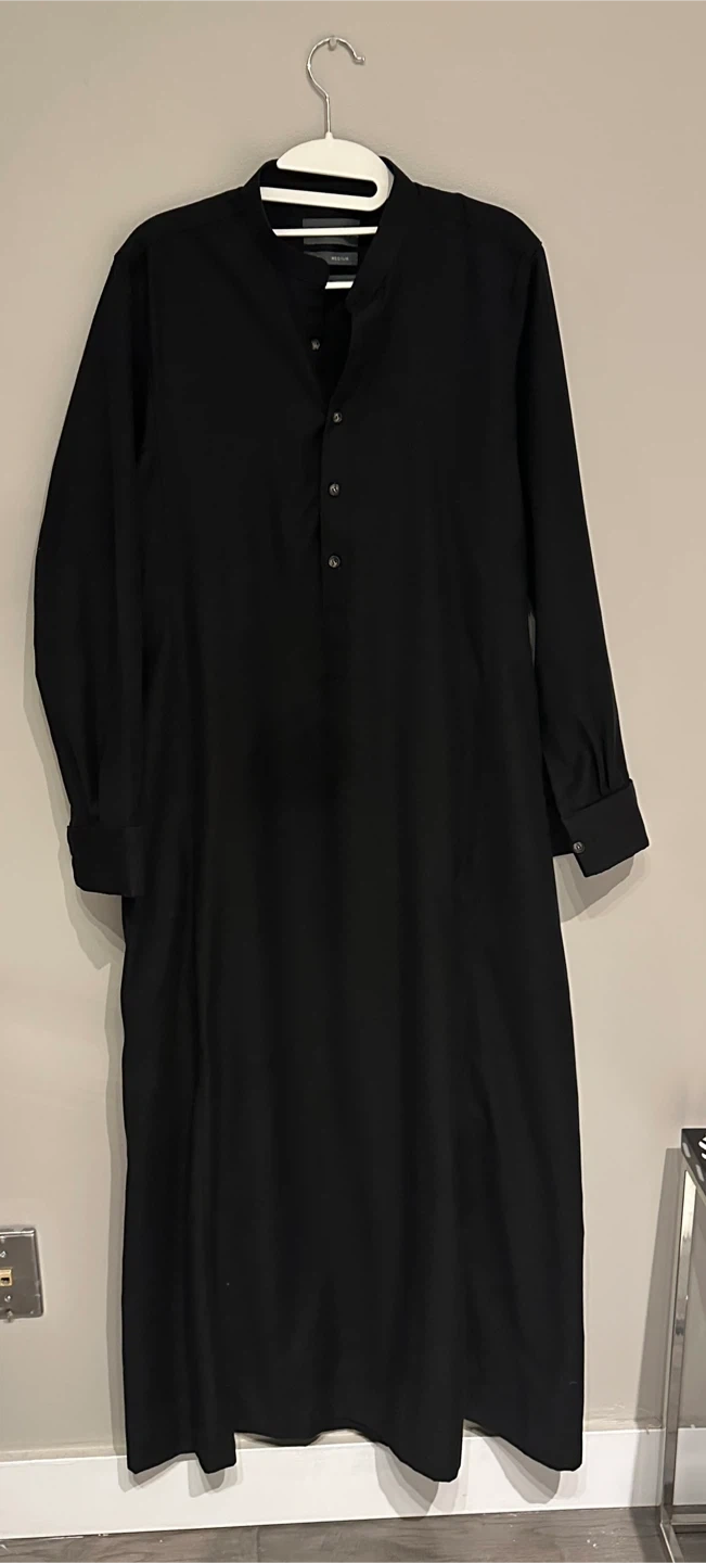Selling a stylish Fares long sleeve thobe in black. It's a size medium and features a unique button-up design. Perfect for a casual or dressed-up look!