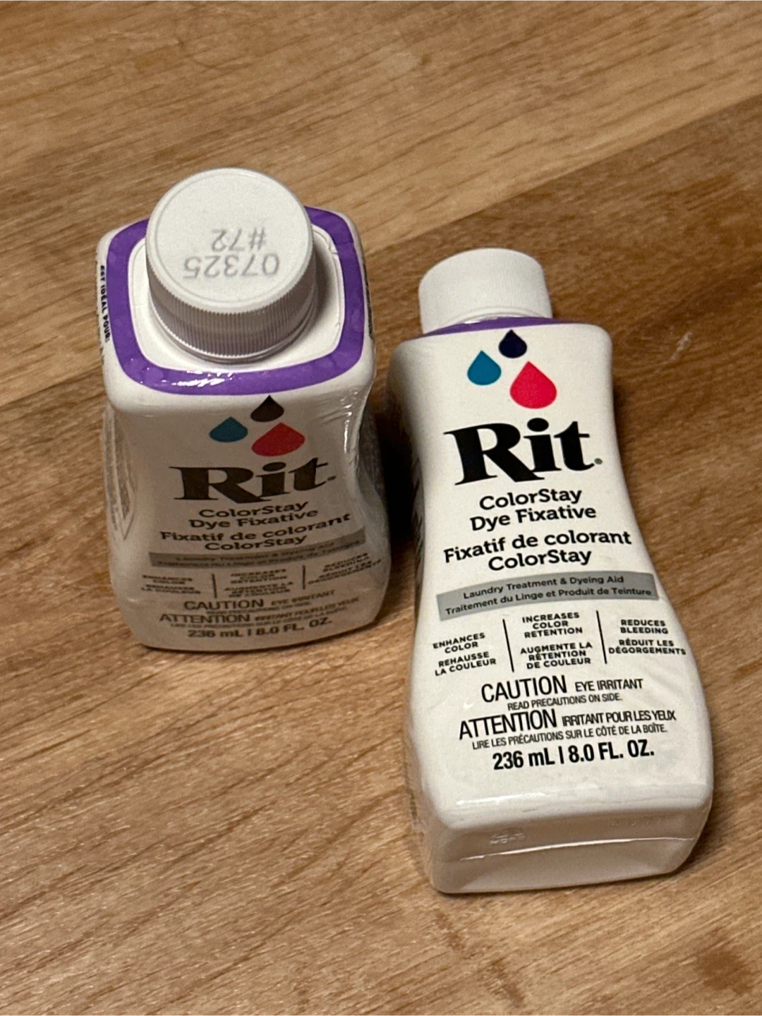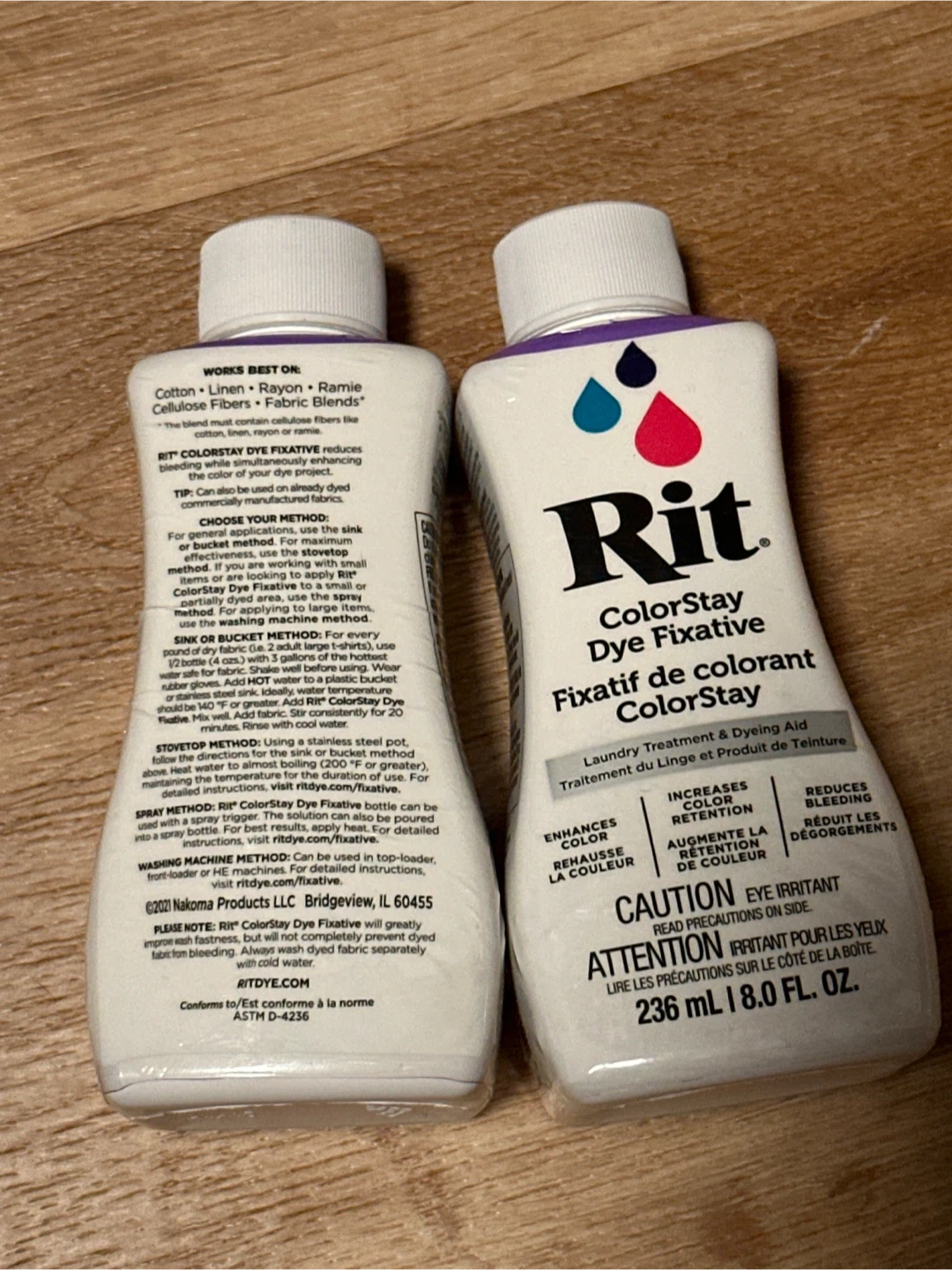 Selling two bottles of Rit ColorStay Dye Fixative. They're both brand new and ready to help keep your fabrics looking their best! Each bottle contains 236 mL (8.0 fl oz) of product. Perfect for laundry and dyeing projects to prevent colour bleeding and fading