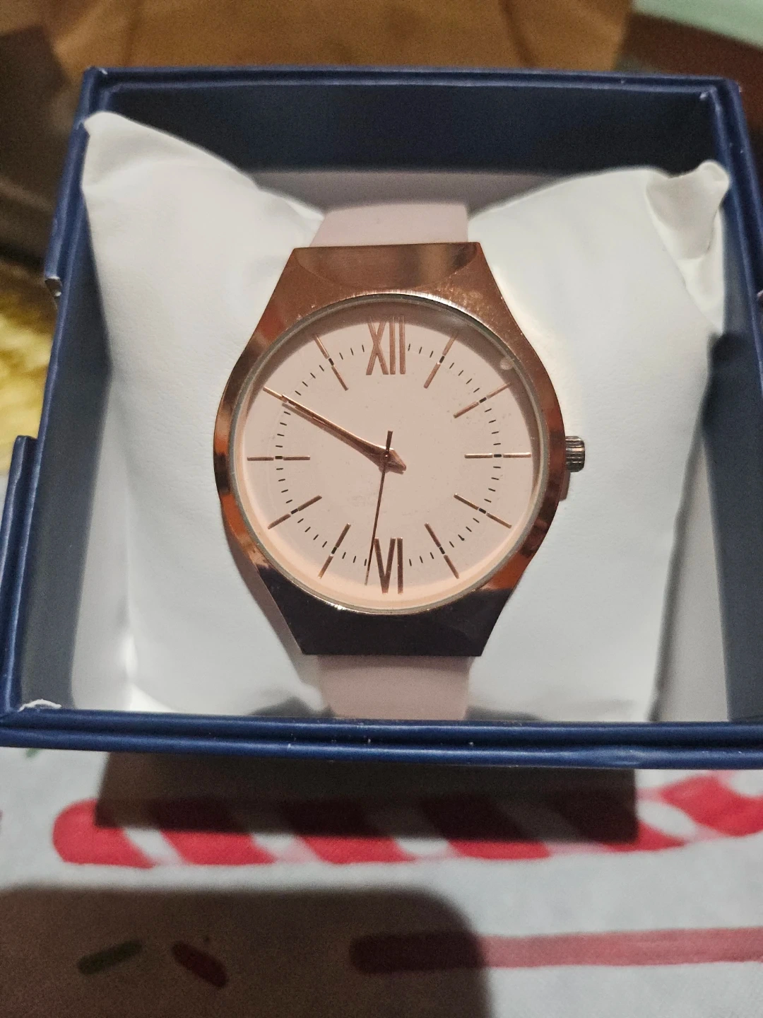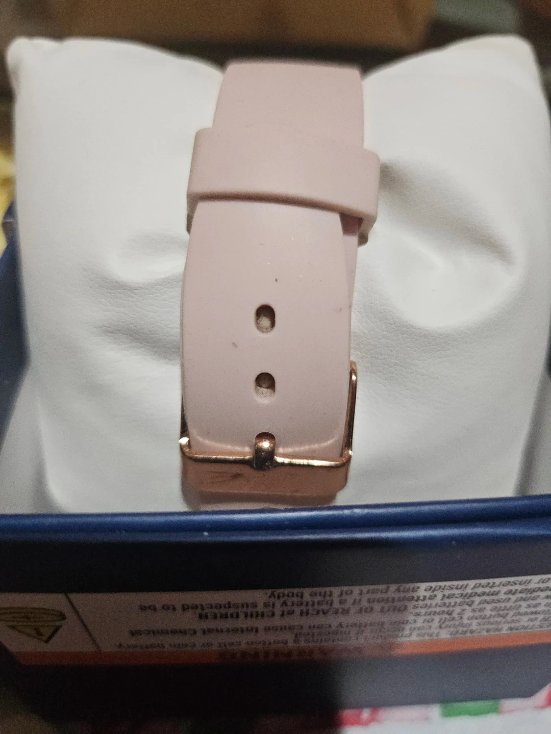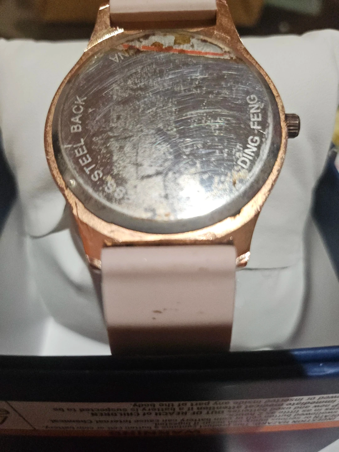 Selling a women's watch by Ding Feng. It has a rose gold face and a light pink wristband. The back is stainless steel. It comes with the box
