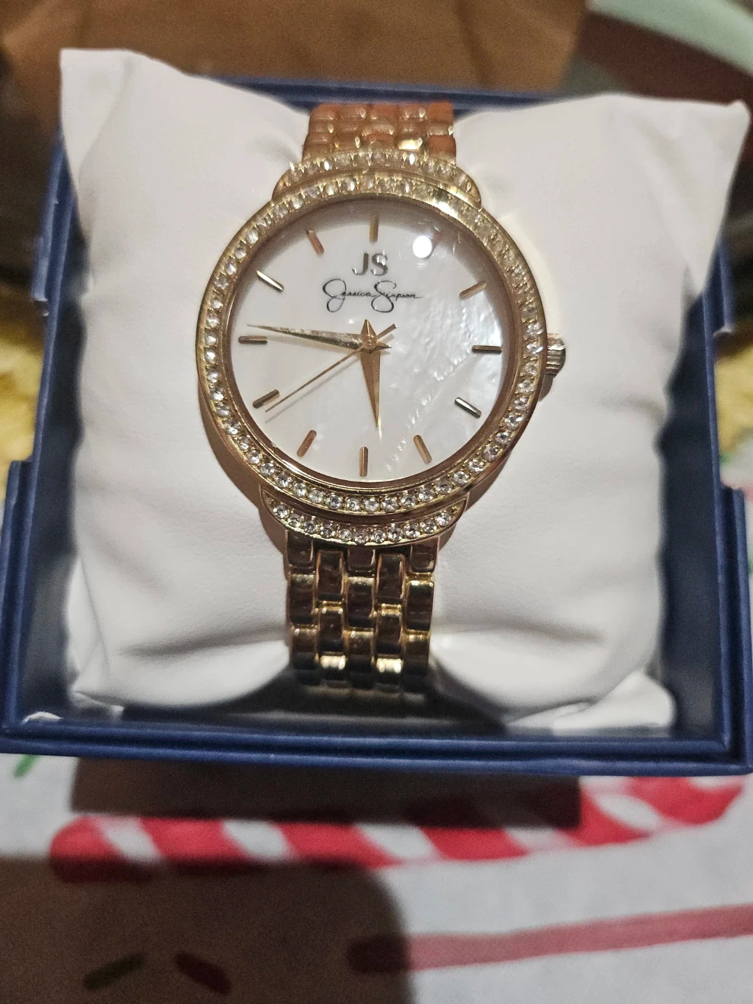Selling a beautiful Jessica Simpson gold watch. It's in great condition and comes with the original box. This watch features a stylish design with a crystal-accented bezel and a gold-tone stainless steel band. Perfect for adding a touch of elegance to any outfit!
