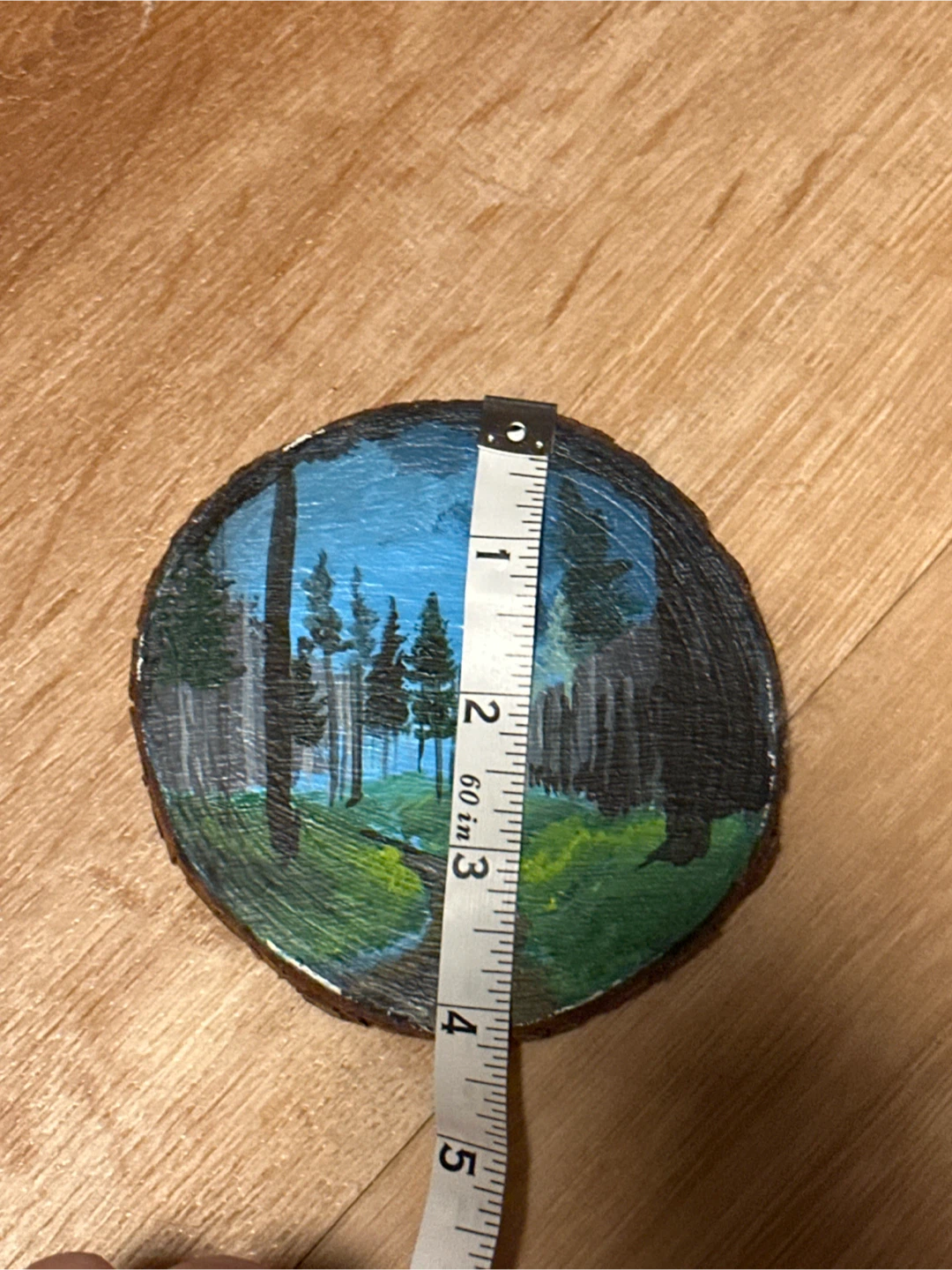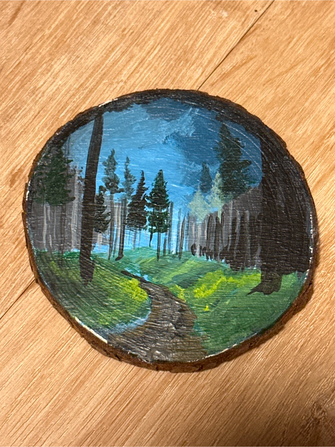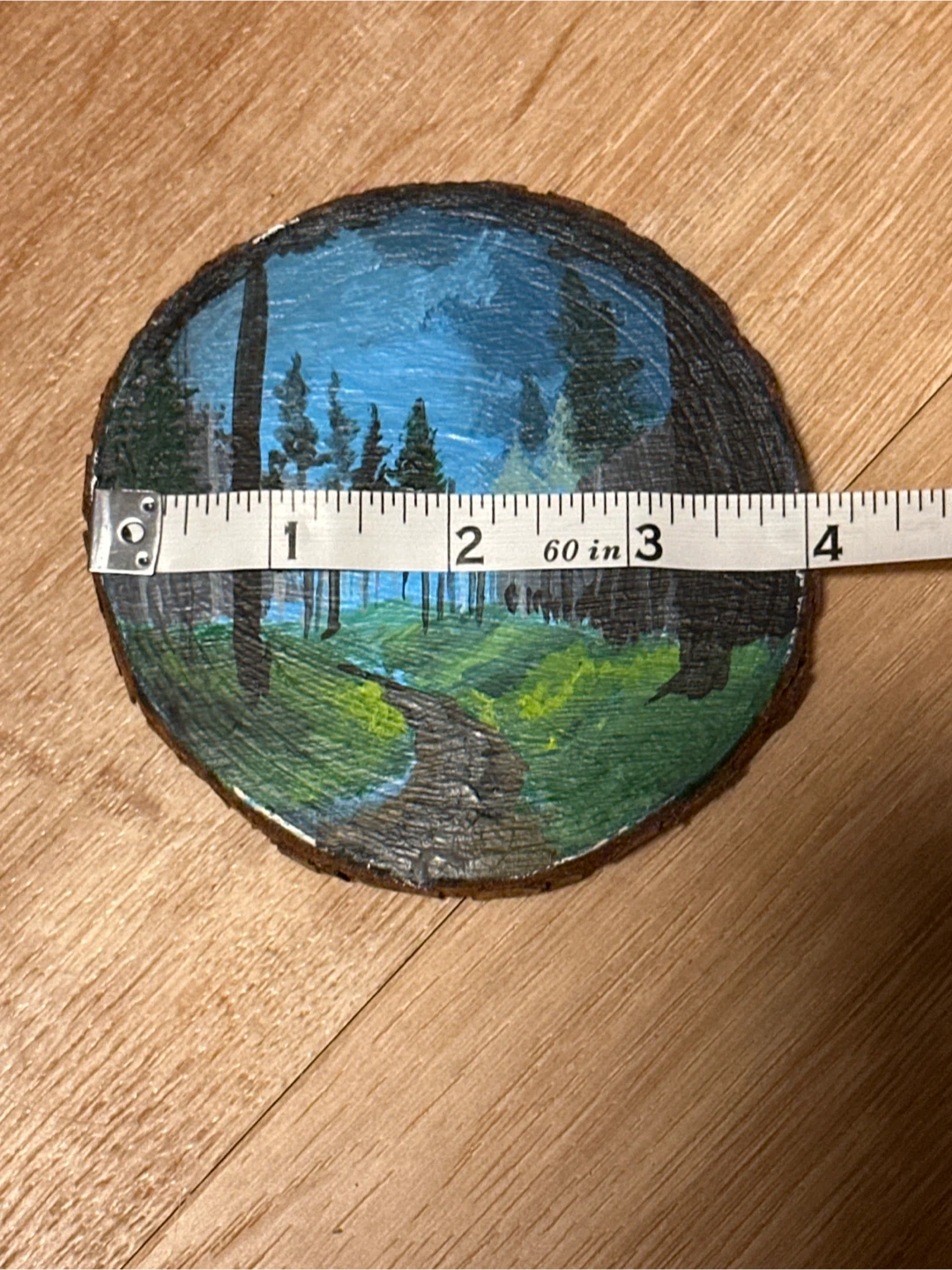 Here's a charming hand-painted wood slice featuring a serene forest scene! It measures approximately 4 inches across, making it a lovely little piece of art to brighten up any space