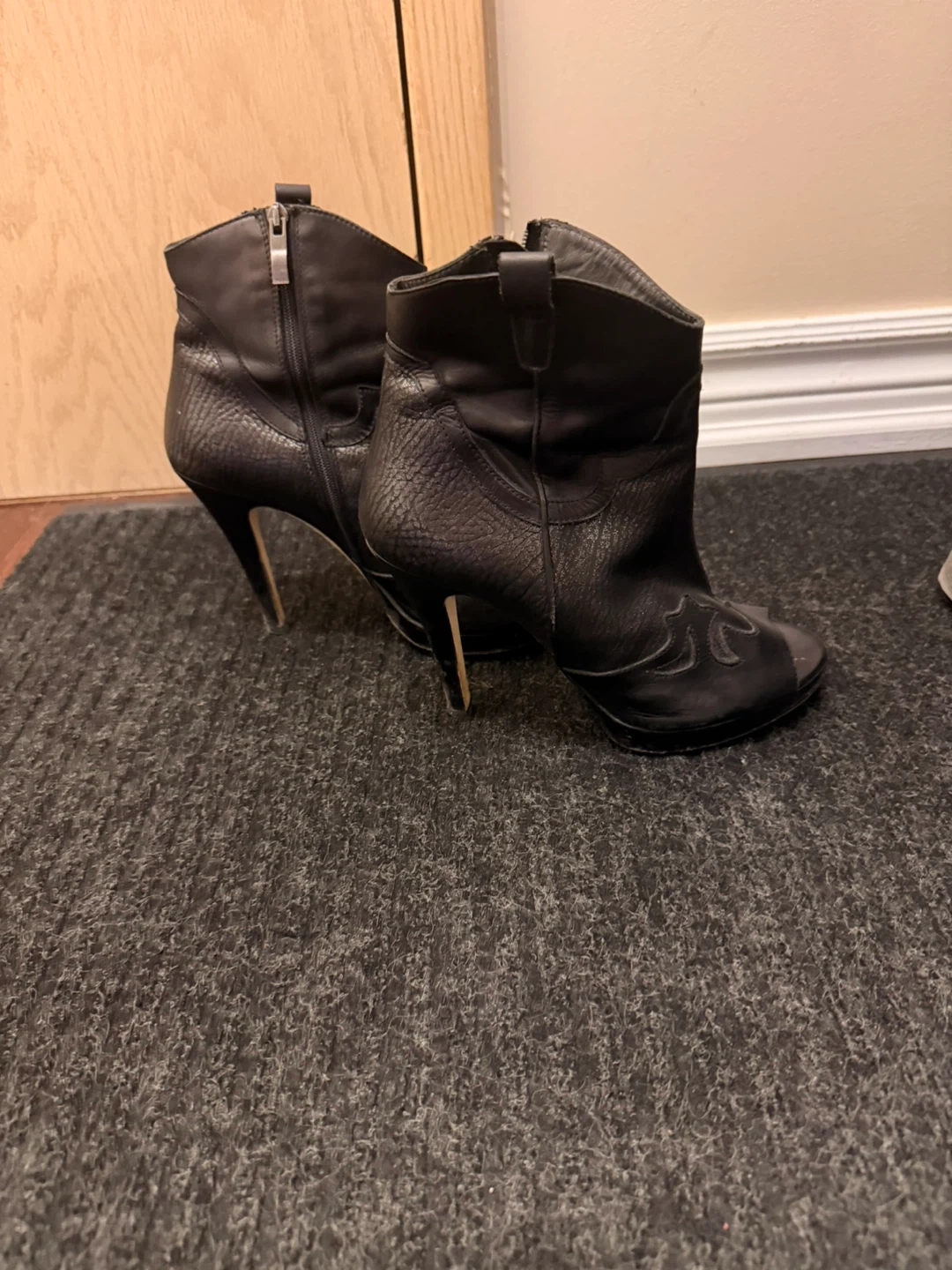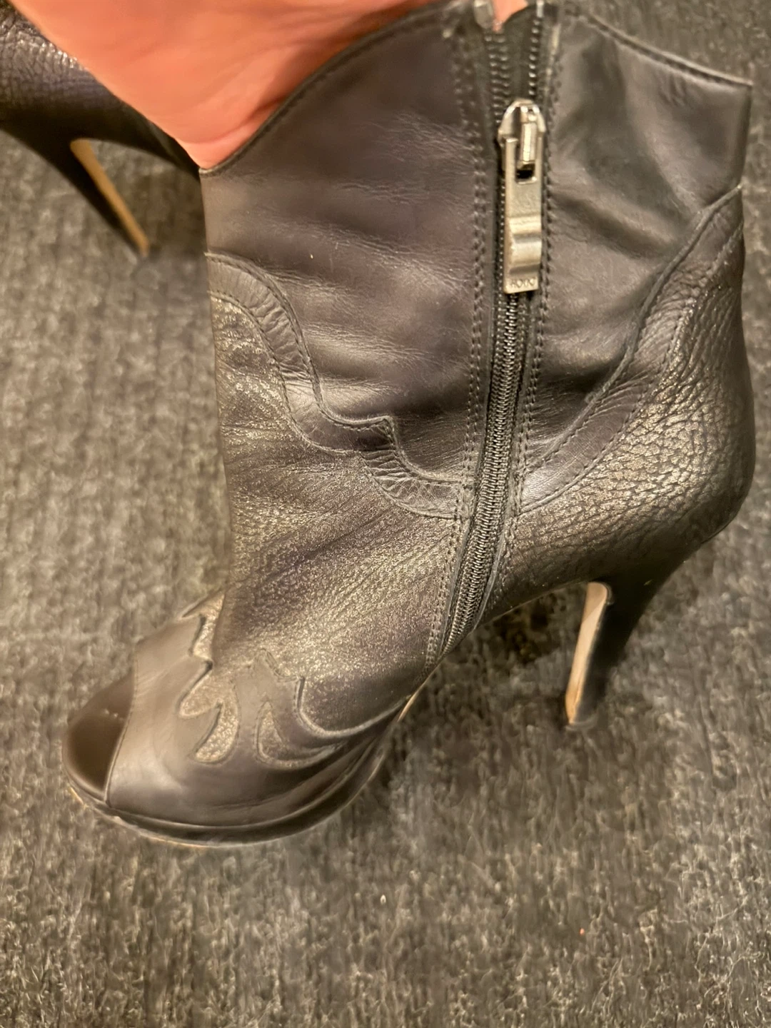 Selling a pair of black leather heeled booties in size 39. They feature a zipper closure and a stylish design. These booties are perfect for adding a touch of edge to any outfit!