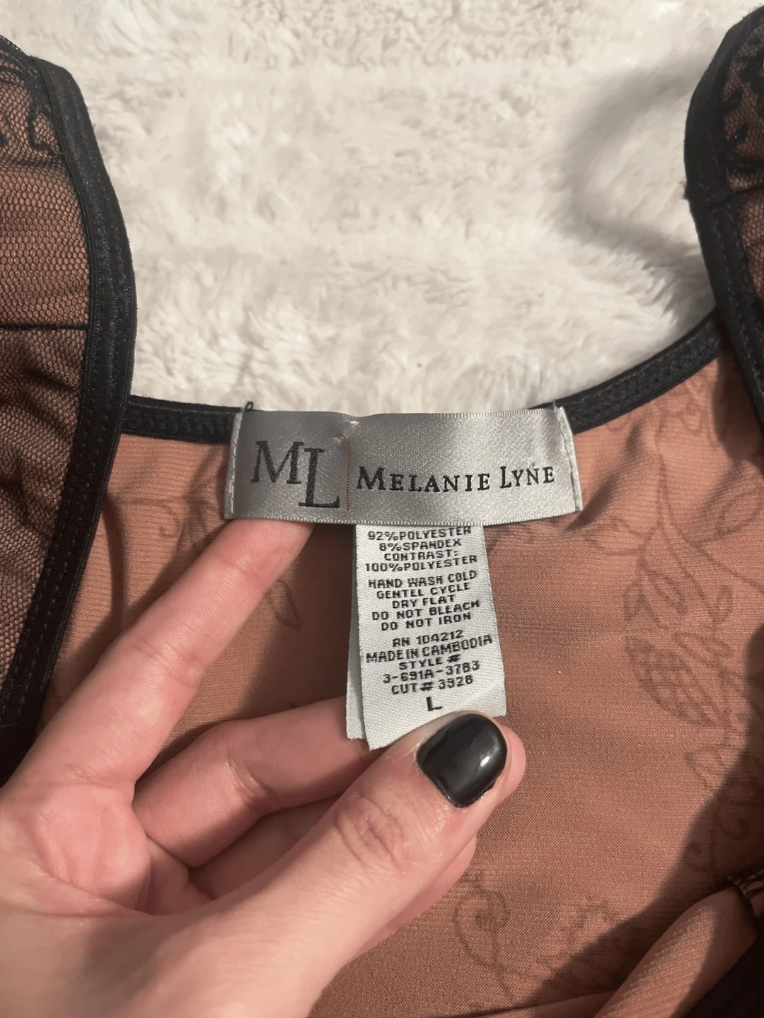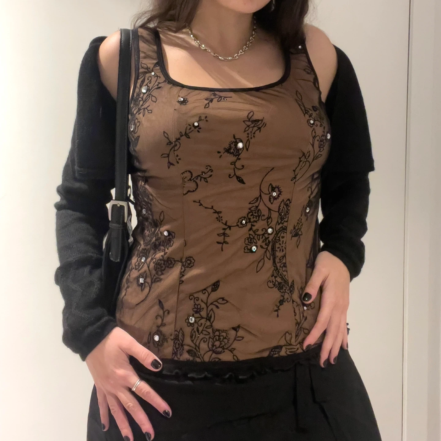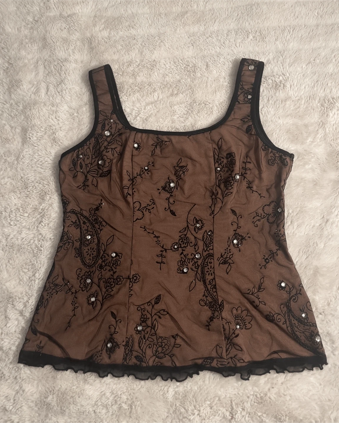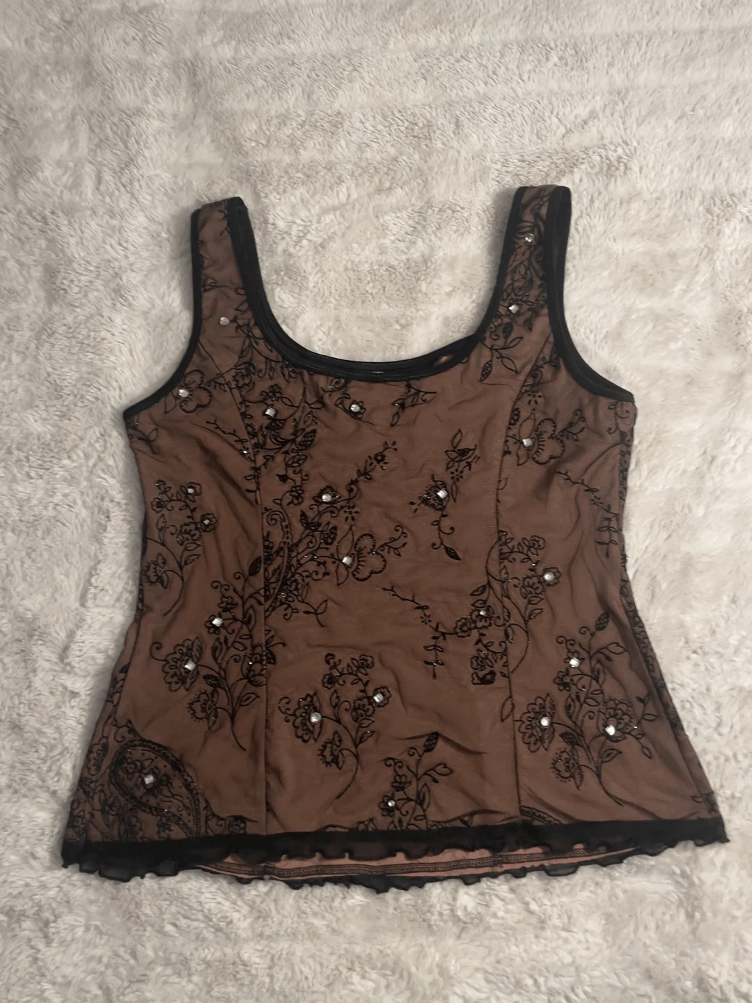 Selling a cute vintage whimsigoth Melanie Lyne tank top in size L! It's brown with black flower detailing and rhinestones.