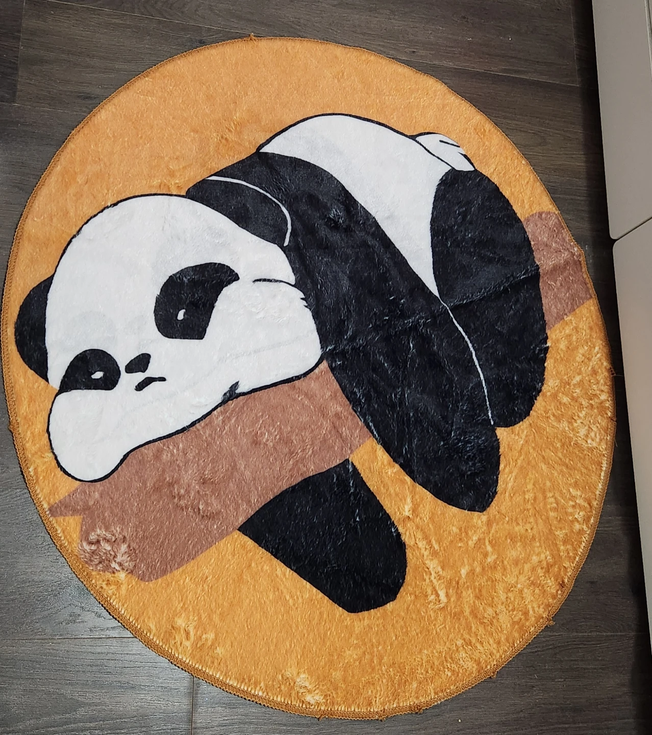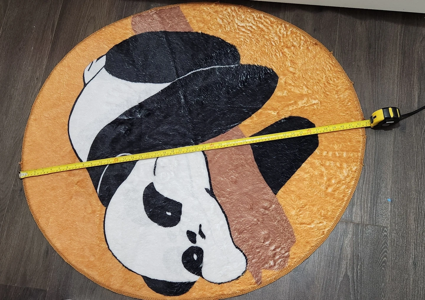 Selling a cute panda round rug! It's in great condition and would be perfect for a kid's room or any panda lover's space. The rug features a sleeping panda design on a round, orange background. It measures approximately 42 inches in diameter.