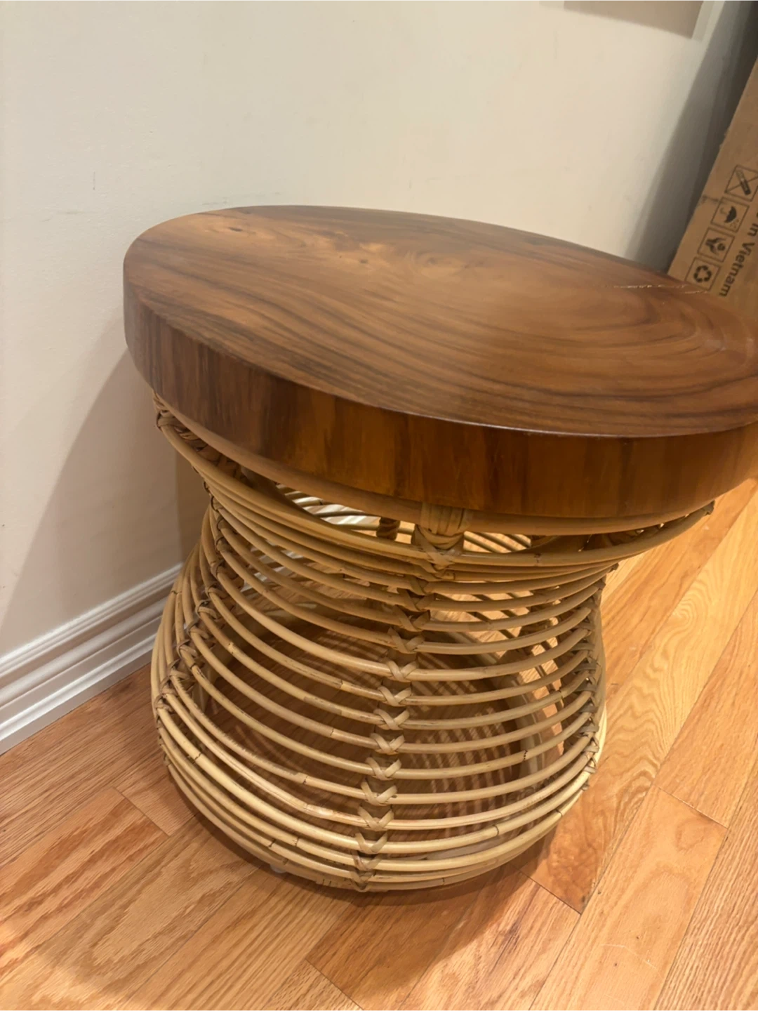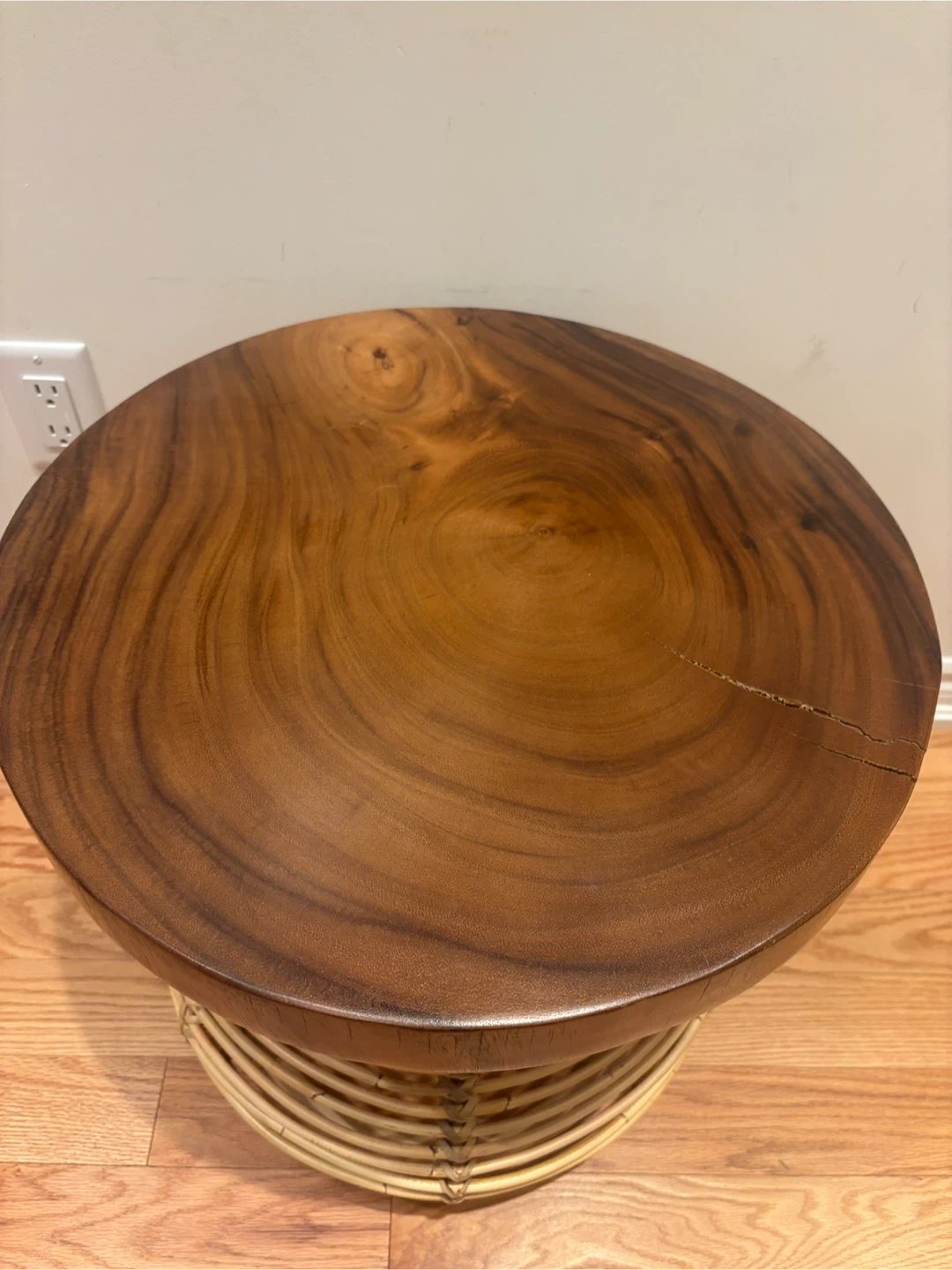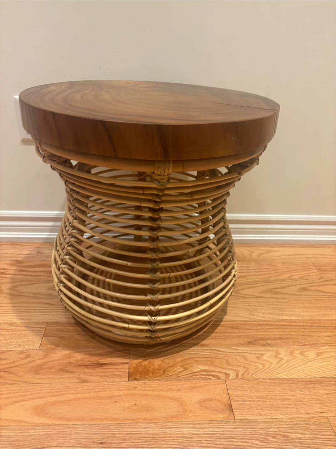 Selling a unique accent table featuring a solid wood top and a woven rattan base. It's would make a lovely addition to any room!