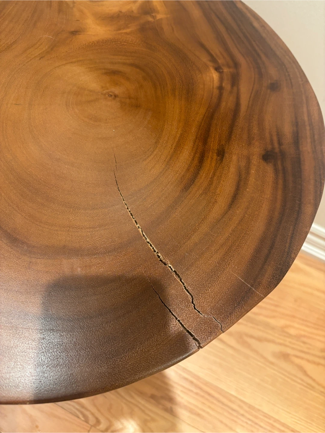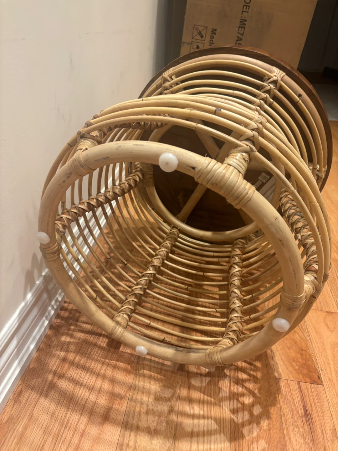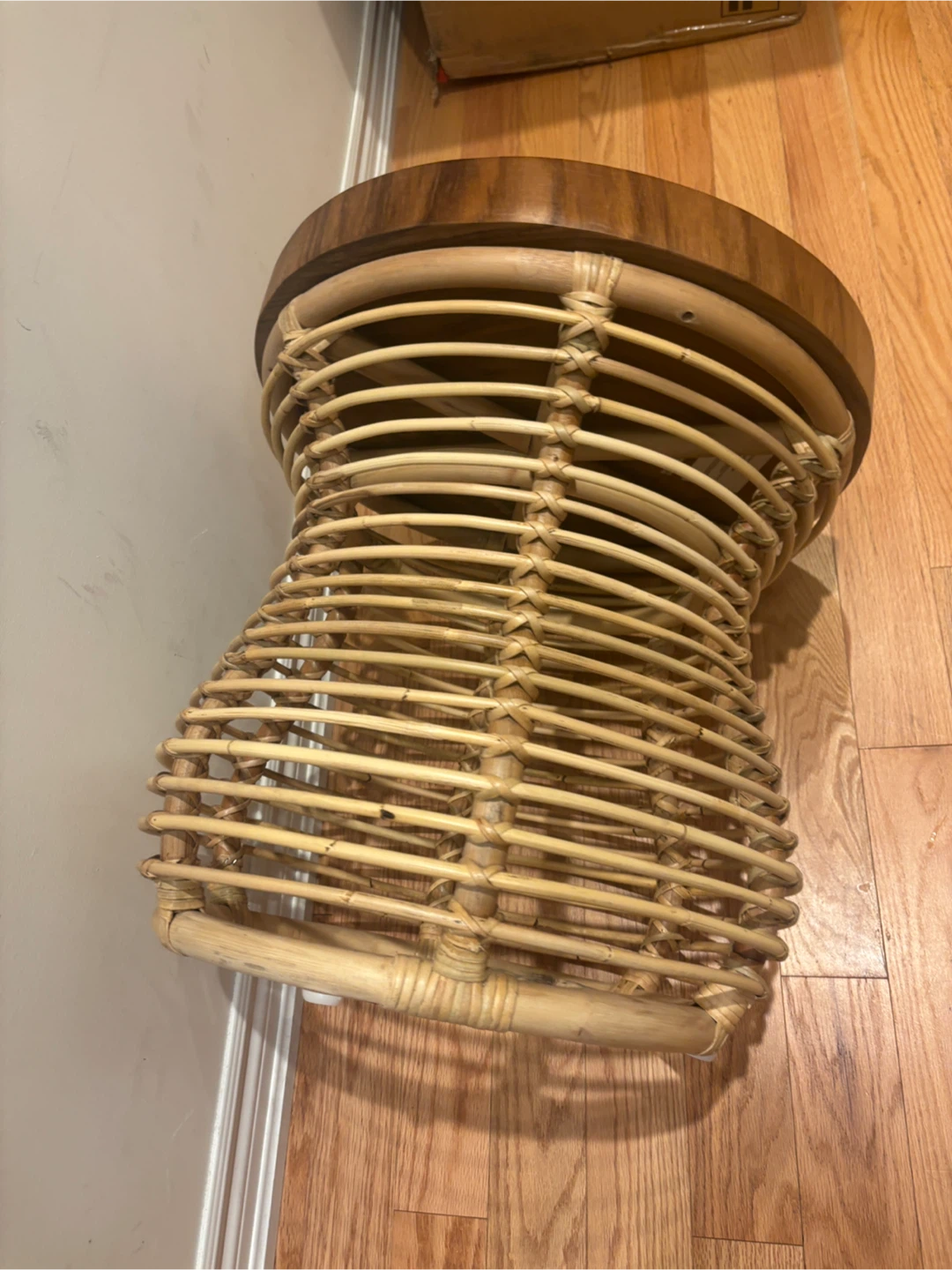 Selling a unique accent table featuring a solid wood top and a woven rattan base. It's would make a lovely addition to any room!