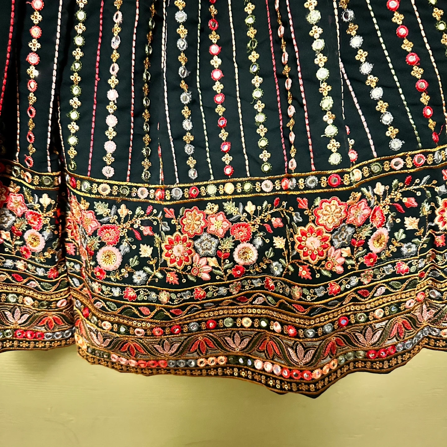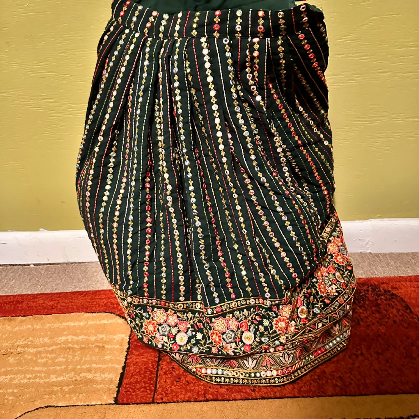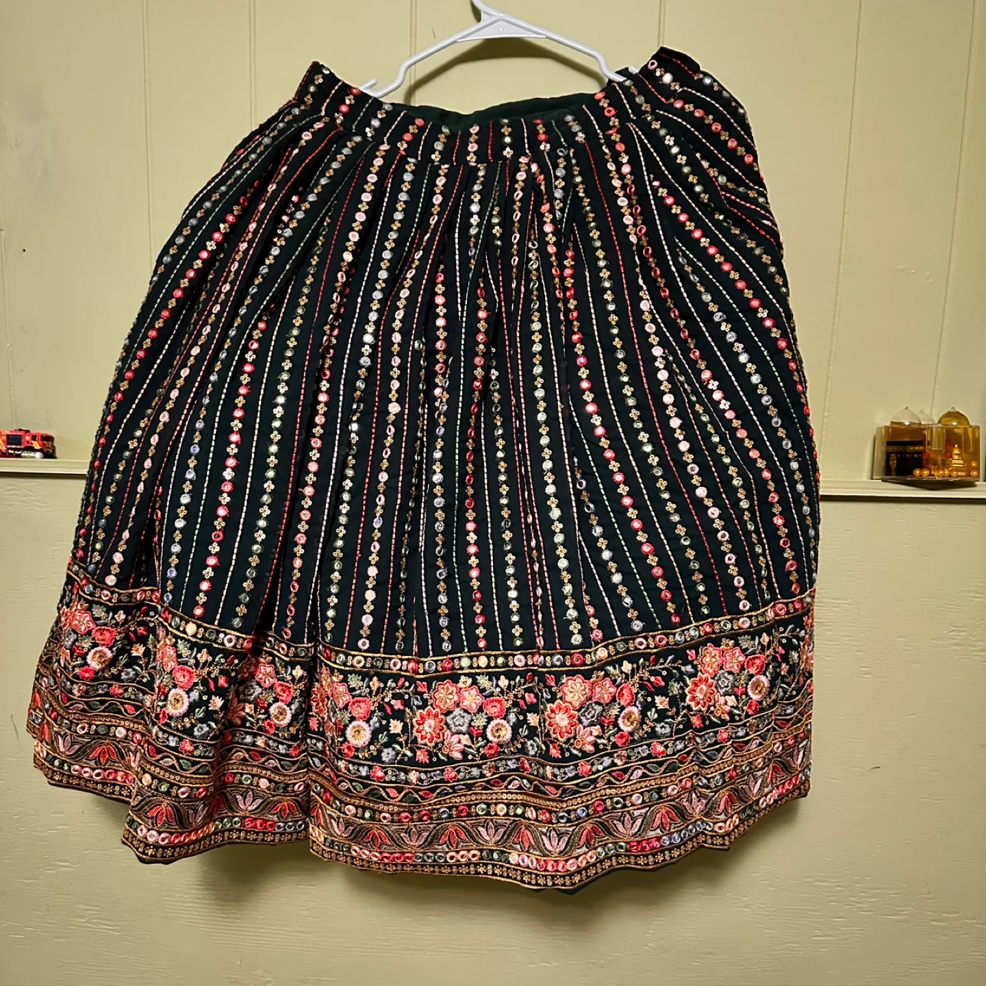 Beautiful dark green lehenga skirt with intricate embroidery and sequin detailing. Perfect for a special occasion! The skirt features a comfortable lining.