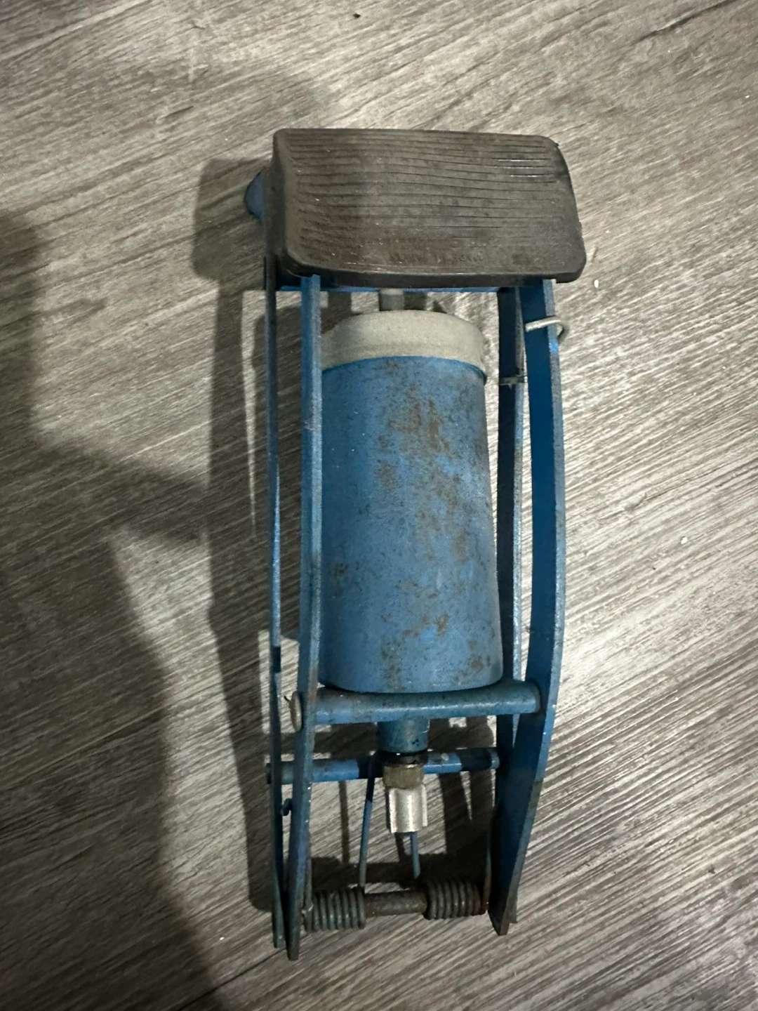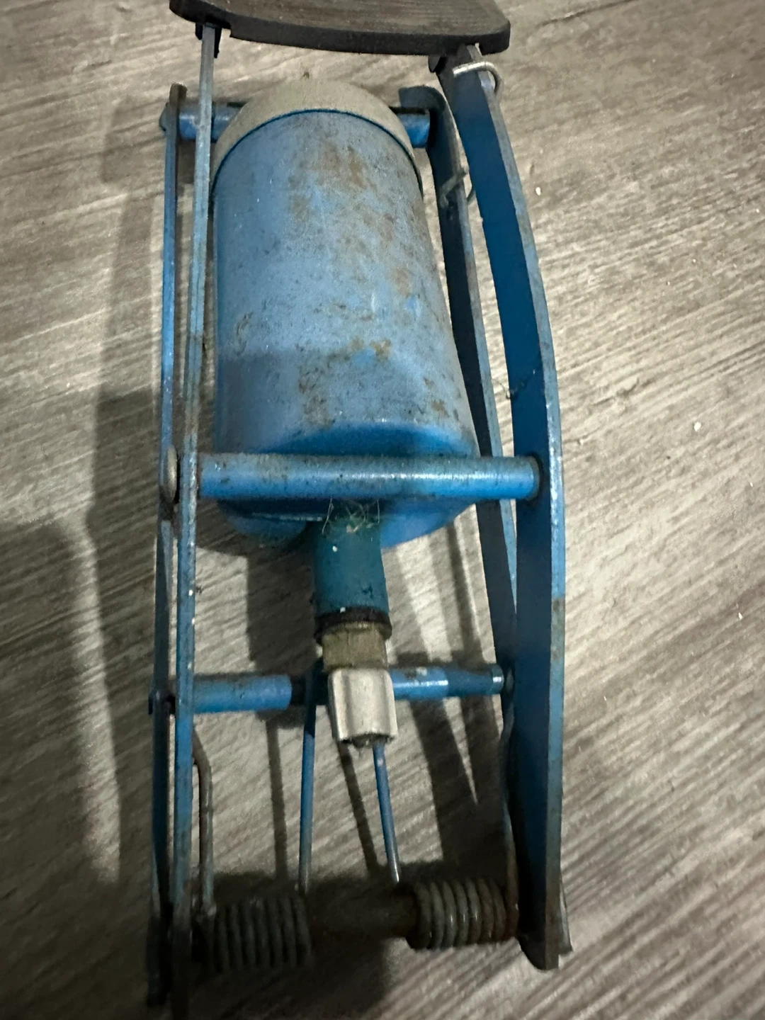 Selling a vintage foot pump! It's blue, but still works. Perfect for inflating tires or other inflatables. A handy tool to have around the garage or car