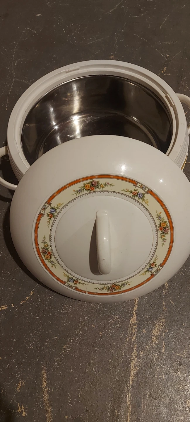 Selling an insulated serving dish. It's white with a floral pattern around the rim of the lid. Perfect for keeping food warm at potlucks or family dinners
