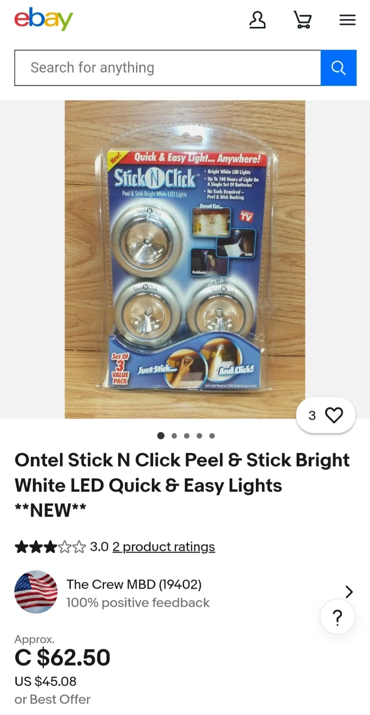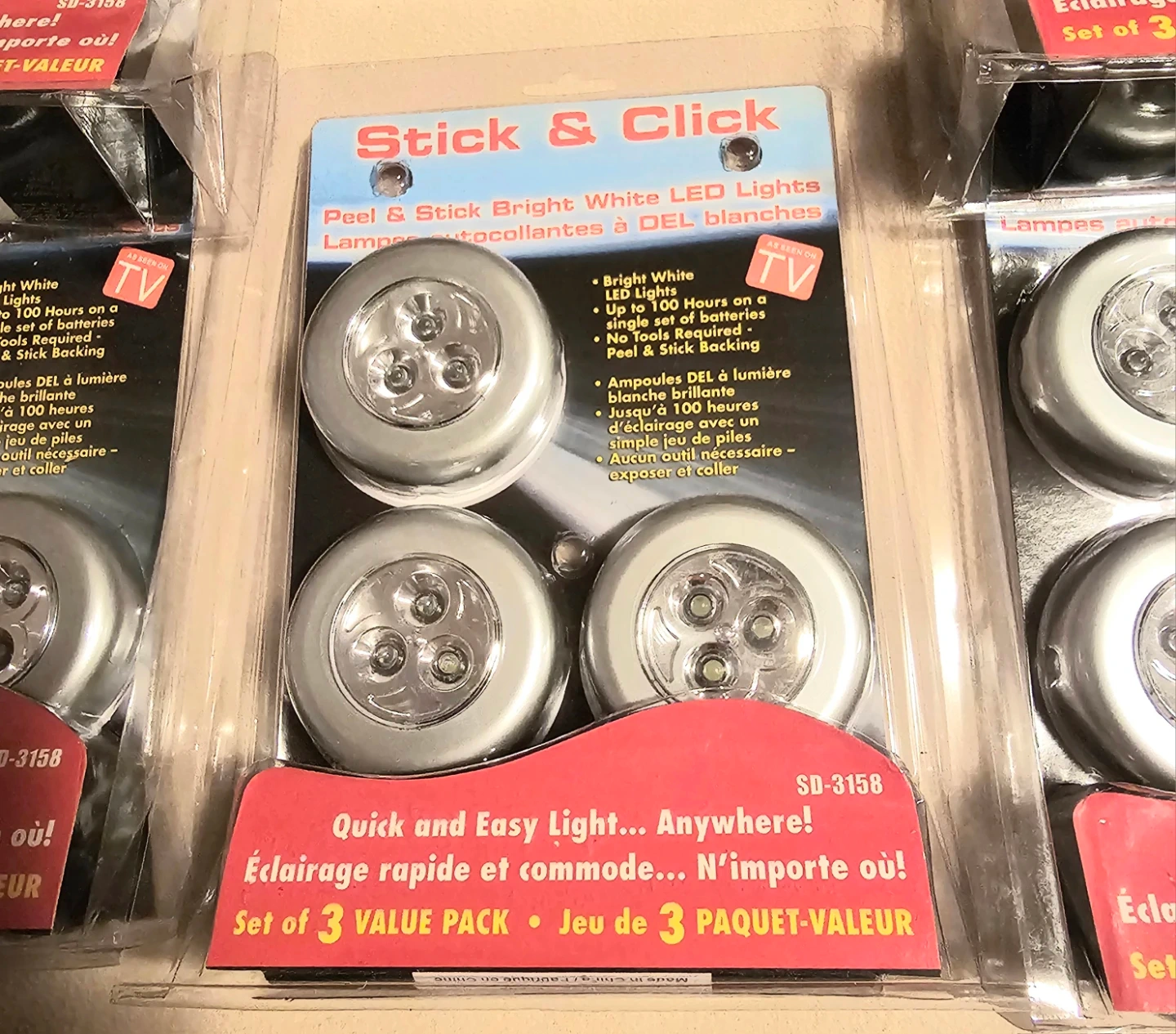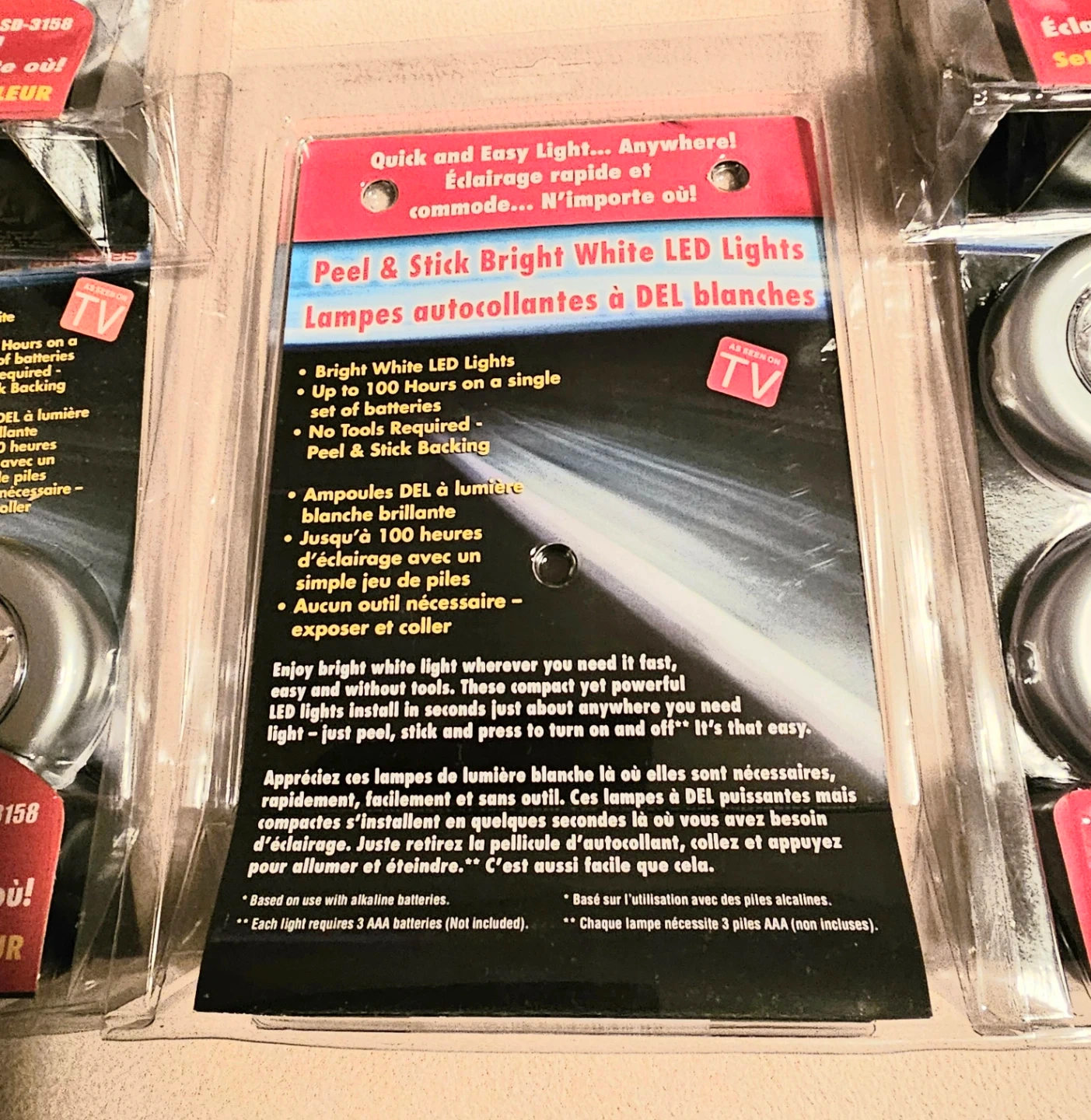 NEW! Unopened Stick & Click Peel & Stick Bright White LED Lights! These lights are quick and easy to install anywhere you need them. They provide bright white light and can last up to 100 hours on a single set of batteries. No tools are required, just peel and stick! $6/pack 38 Available