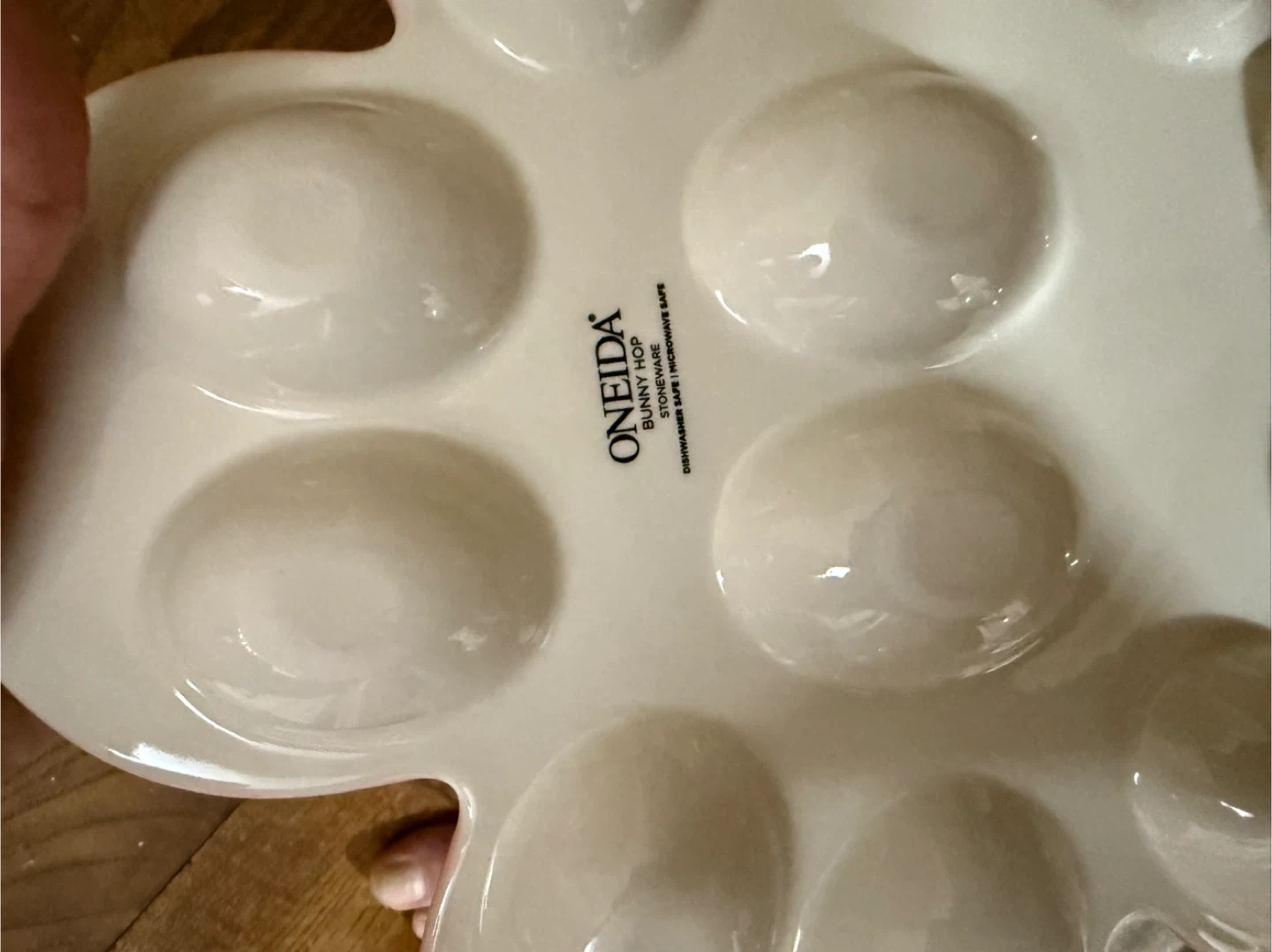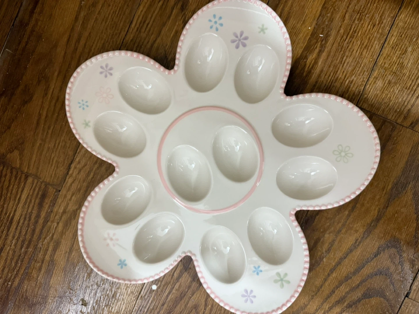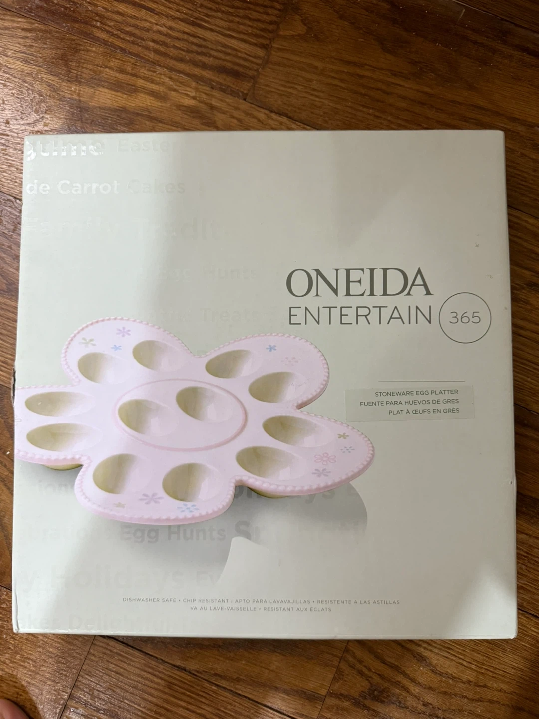 Selling a cute Oneida egg platter! It's in a flower shape with little flower details around the edge. It's part of the Entertain 365 line and is made of stoneware. It's also dishwasher and microwave safe