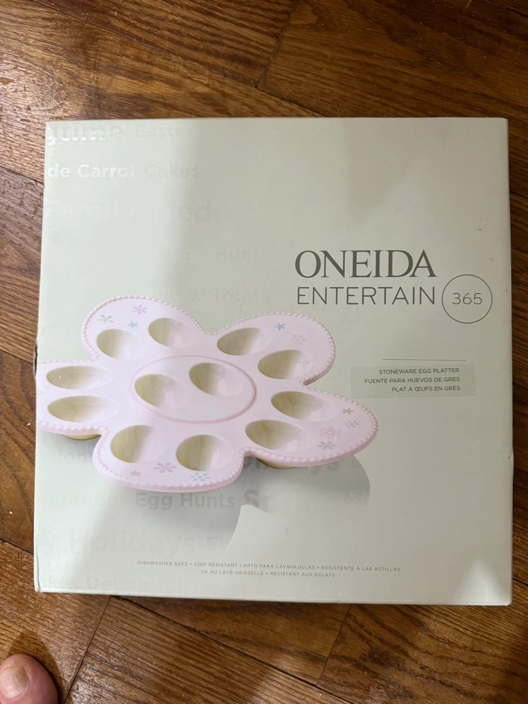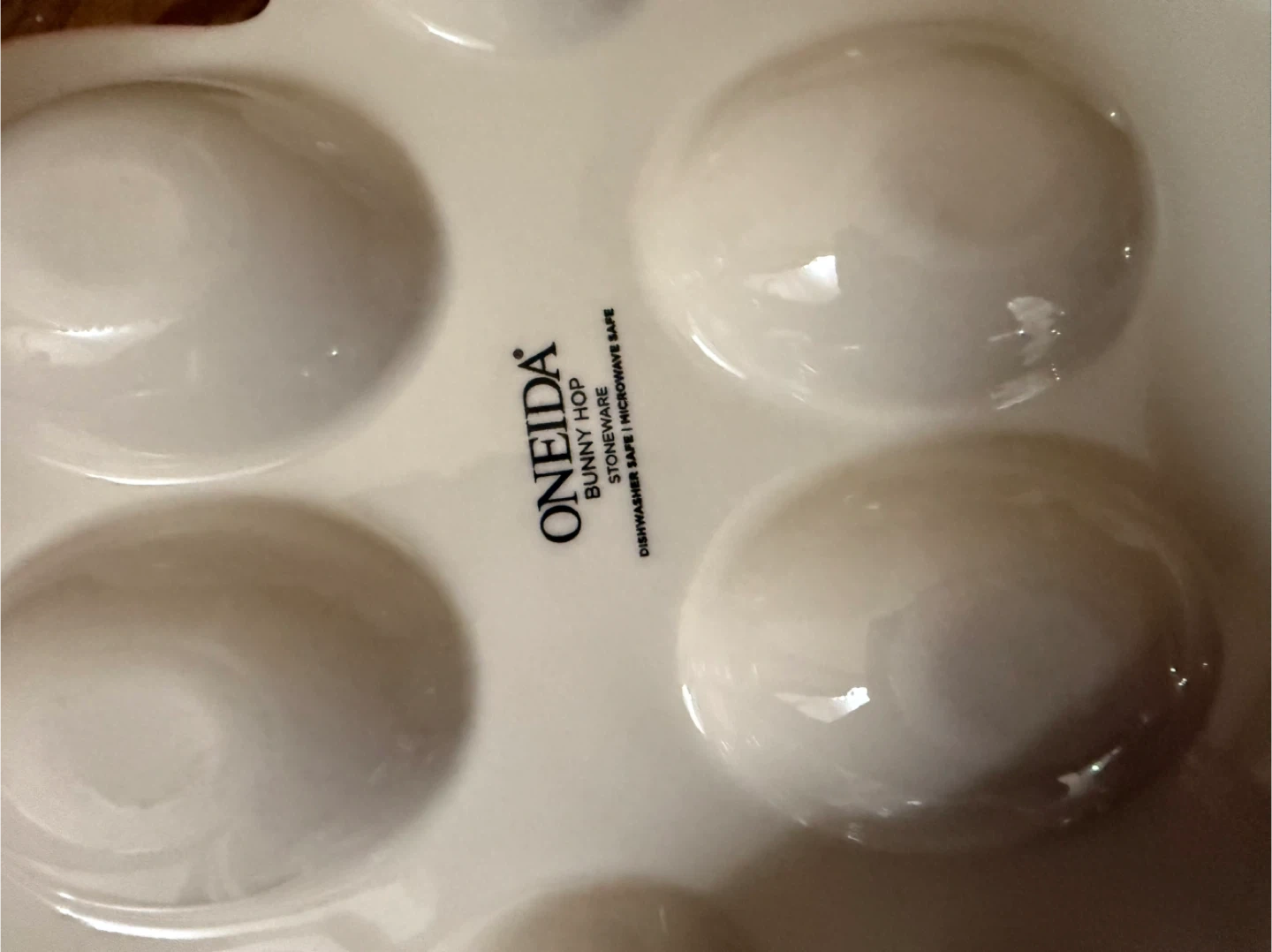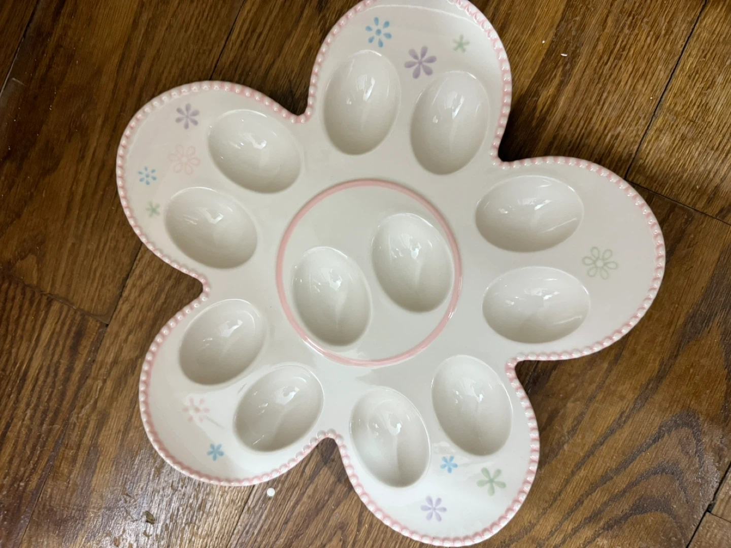 Selling a cute Oneida egg platter! It's in a flower shape with little flower details around the edge. It's part of the Entertain 365 line and is made of stoneware. It's also dishwasher and microwave safe