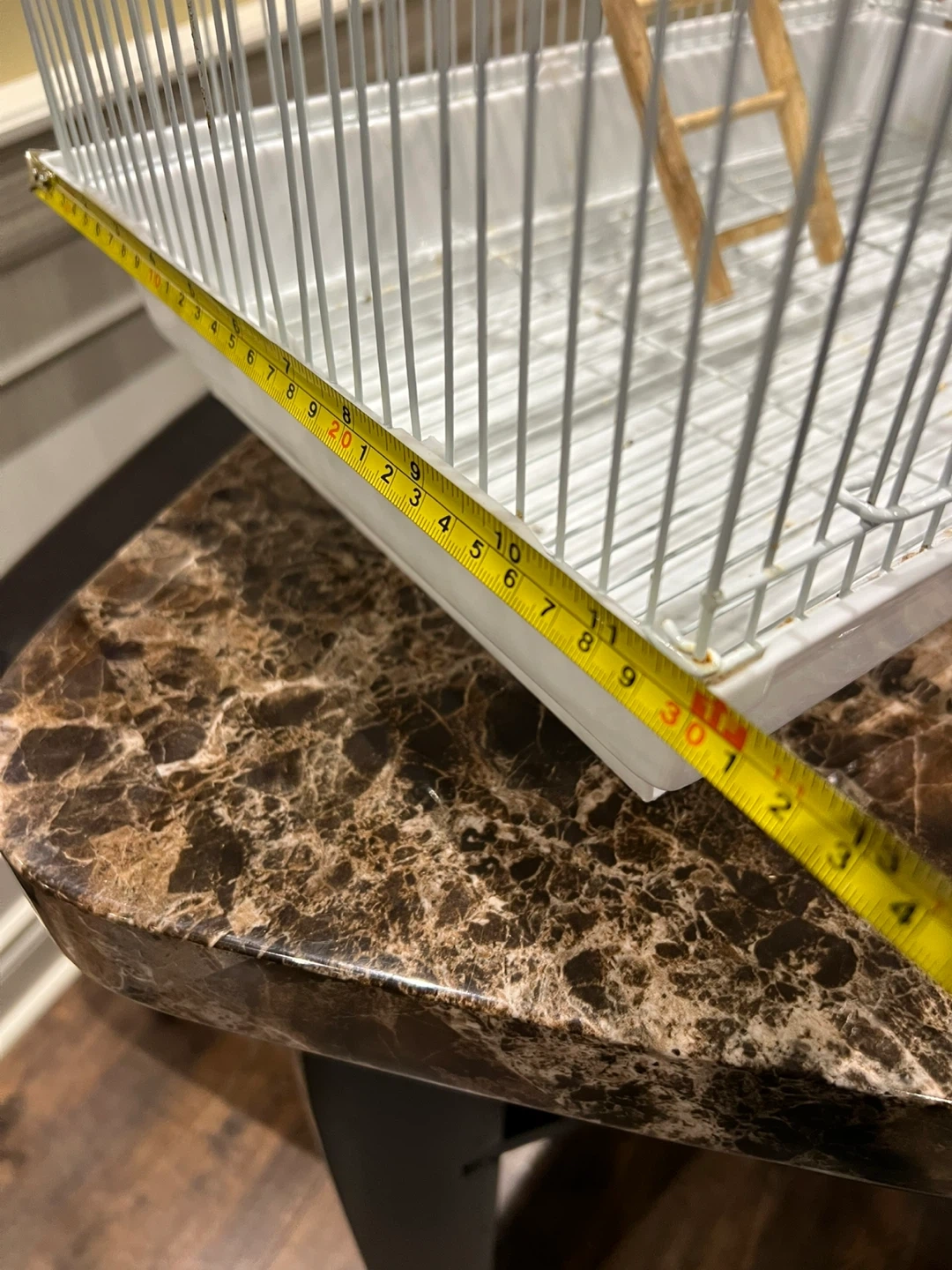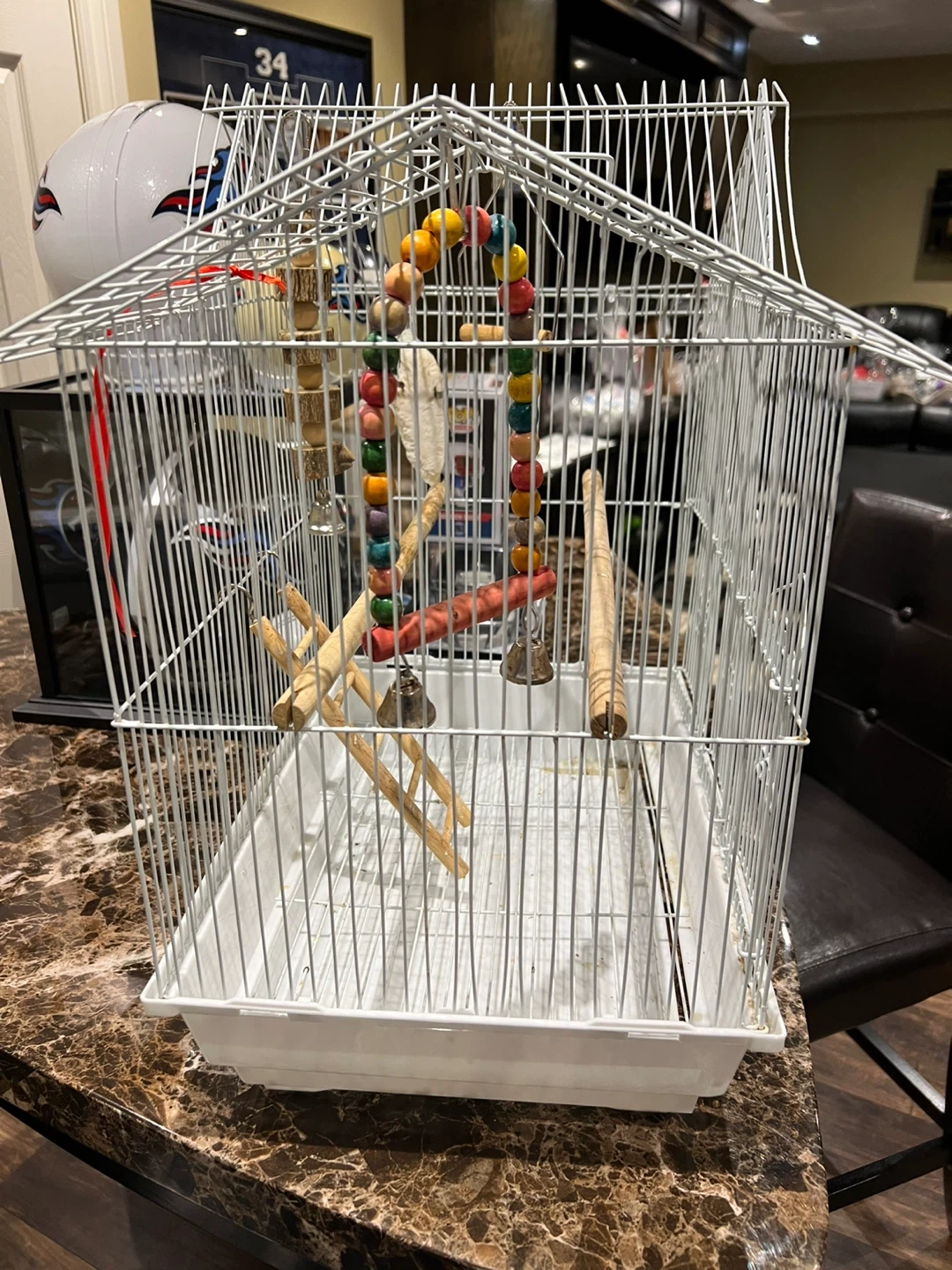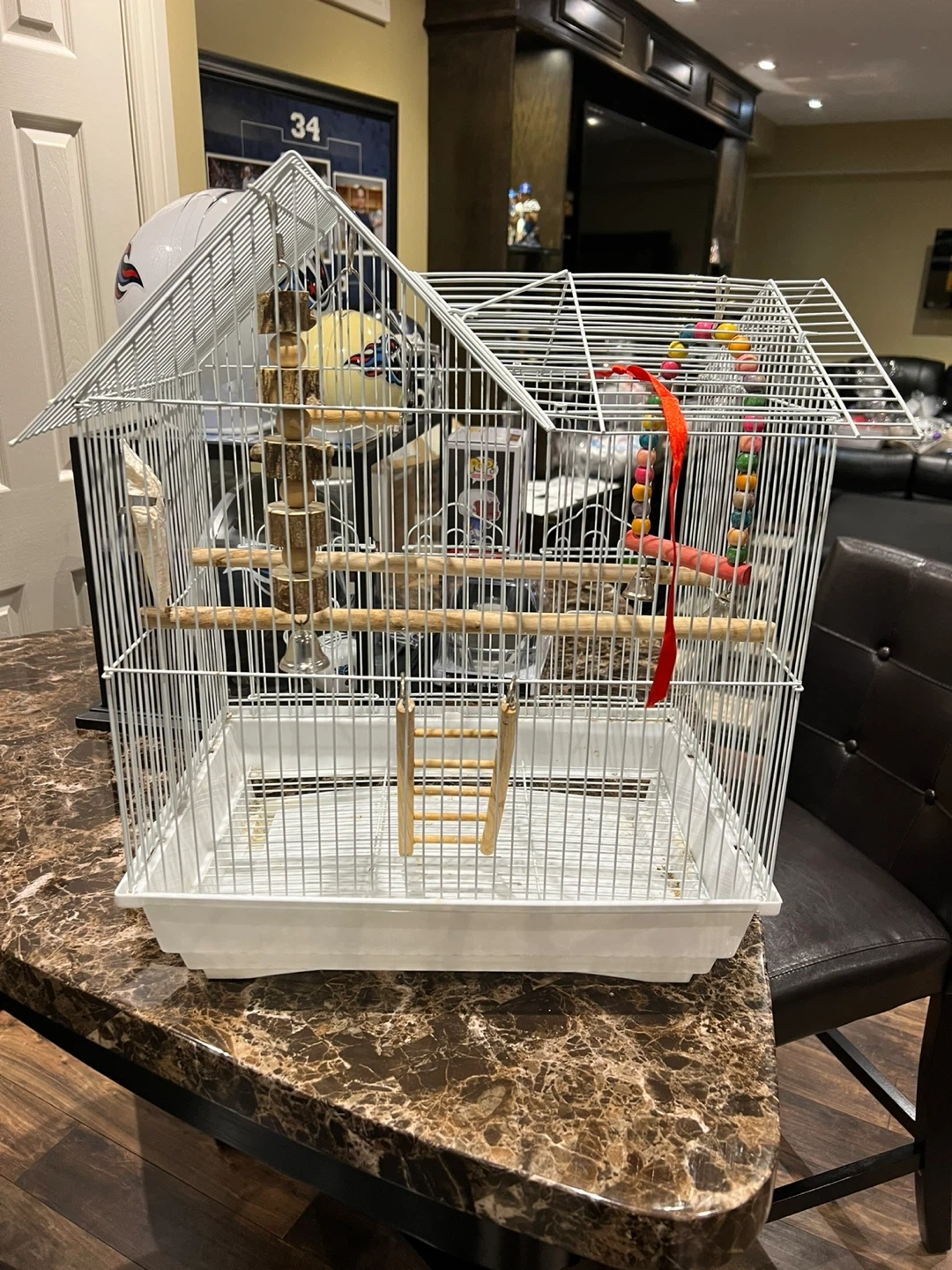 Selling a bird cage that's in great shape! It's white and comes with some fun accessories for your feathered friend, including a ladder, perches, and a colourful beaded toy with bells