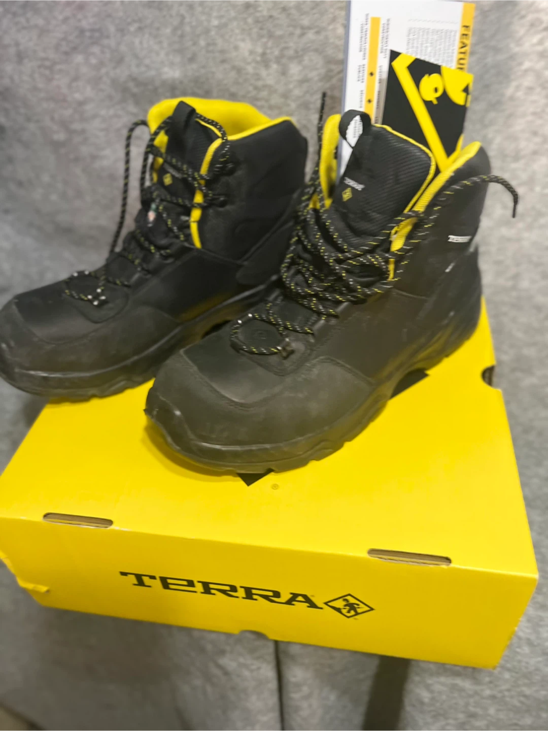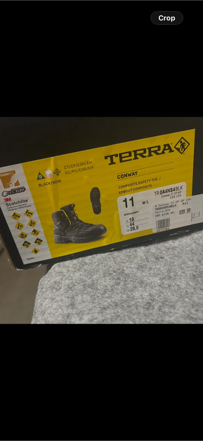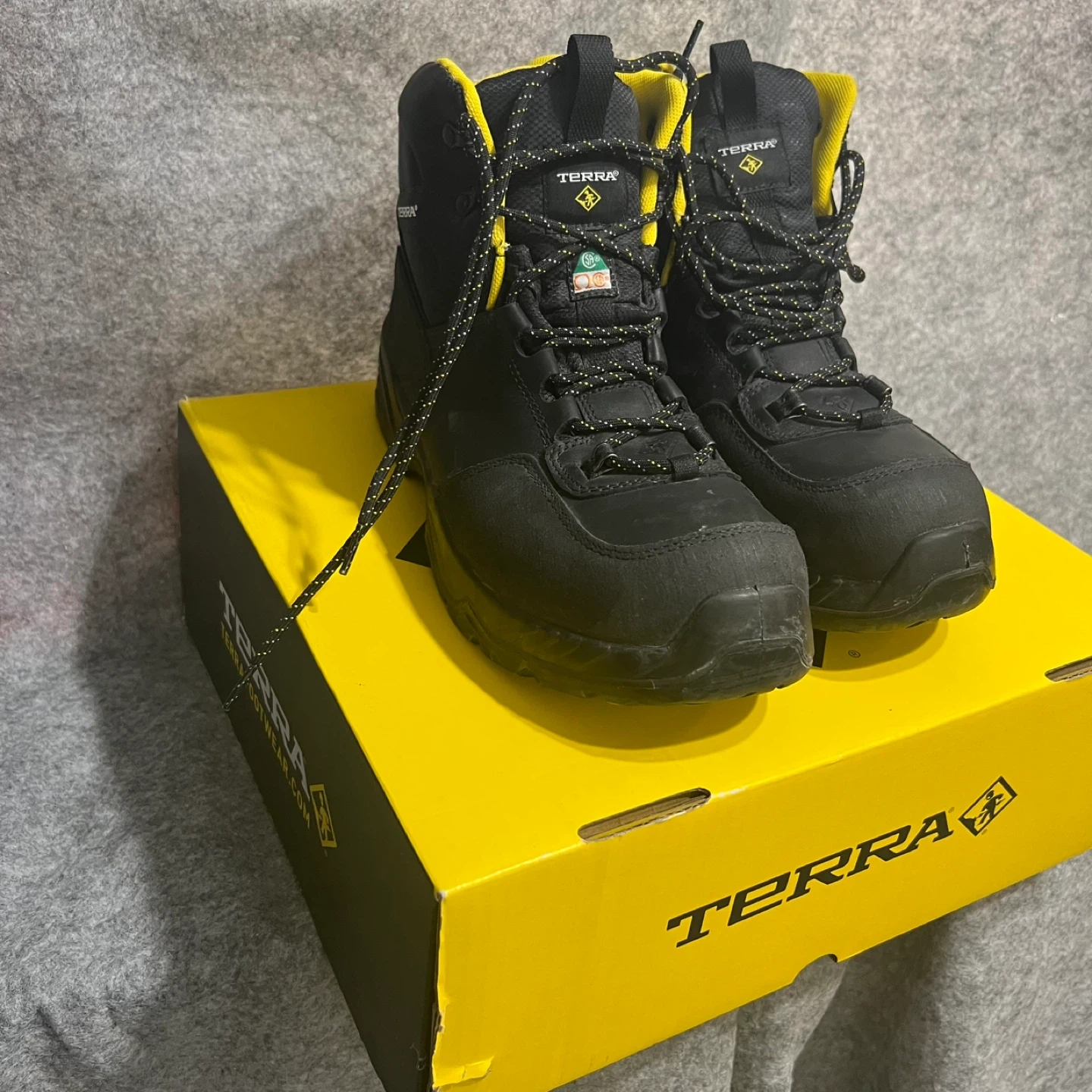 Selling a pair of Terra Conway safety boots in size 11W. These boots feature a composite safety toe and are black with yellow accents. The leather upper is made with balance man-made materials. Originally, these retailed for $199.