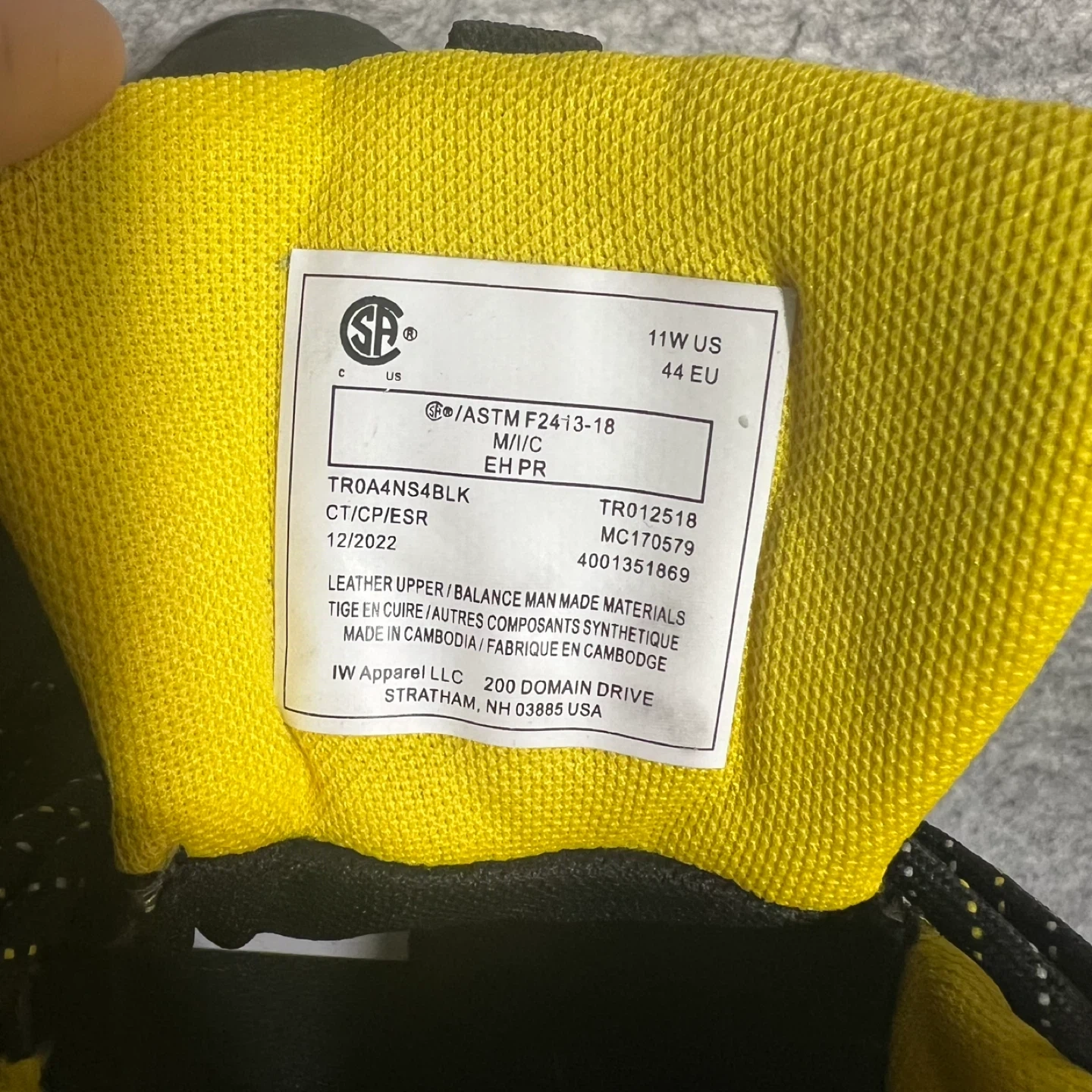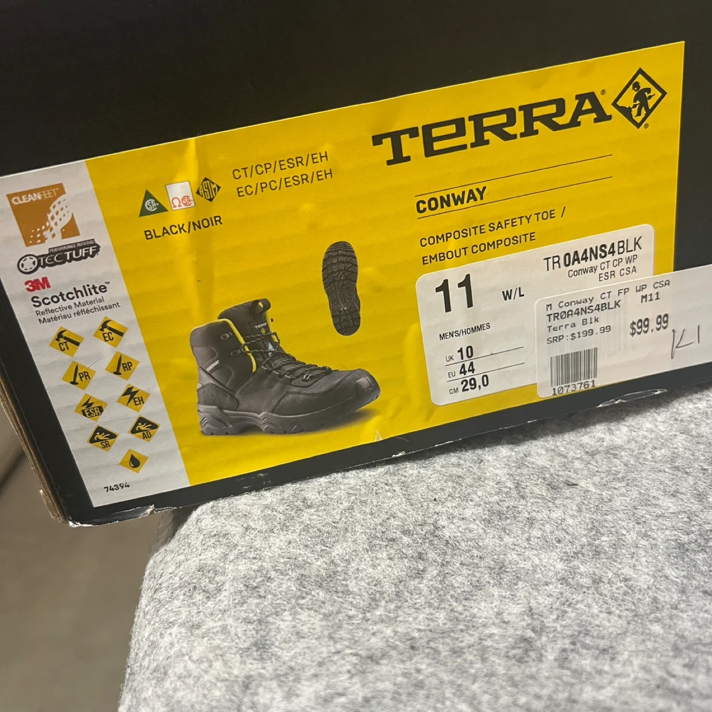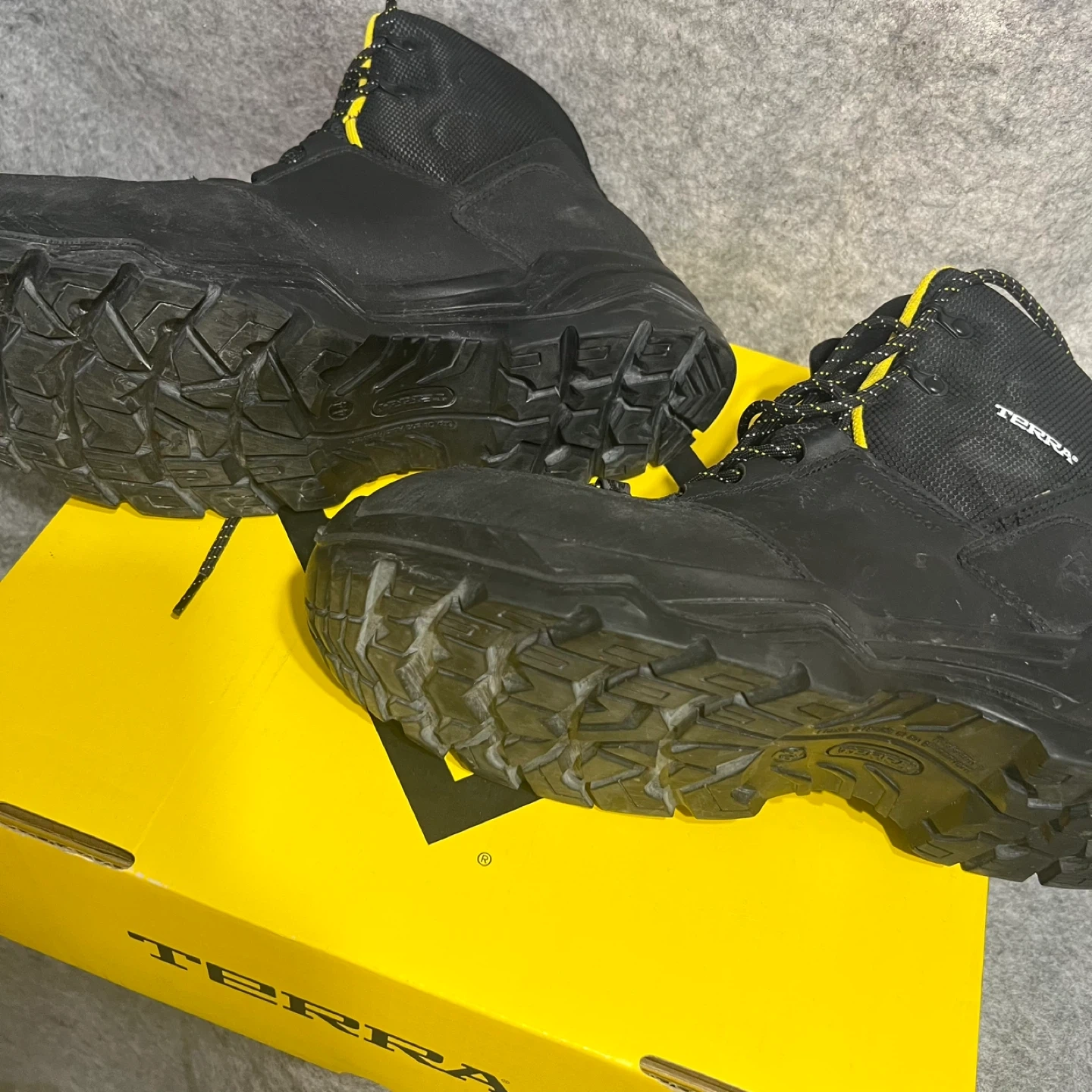 Selling a pair of Terra Conway safety boots in size 11W. These boots feature a composite safety toe and are black with yellow accents. The leather upper is made with balance man-made materials. Originally, these retailed for $199.