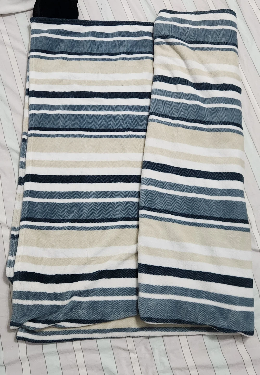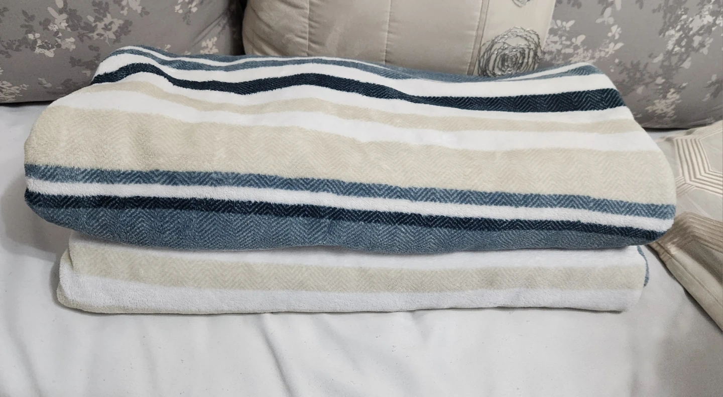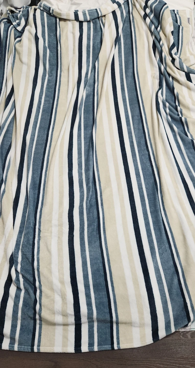 Cozy striped throw blanket in shades of blue, beige, and white. Perfect for adding a touch of warmth and style to your living space!