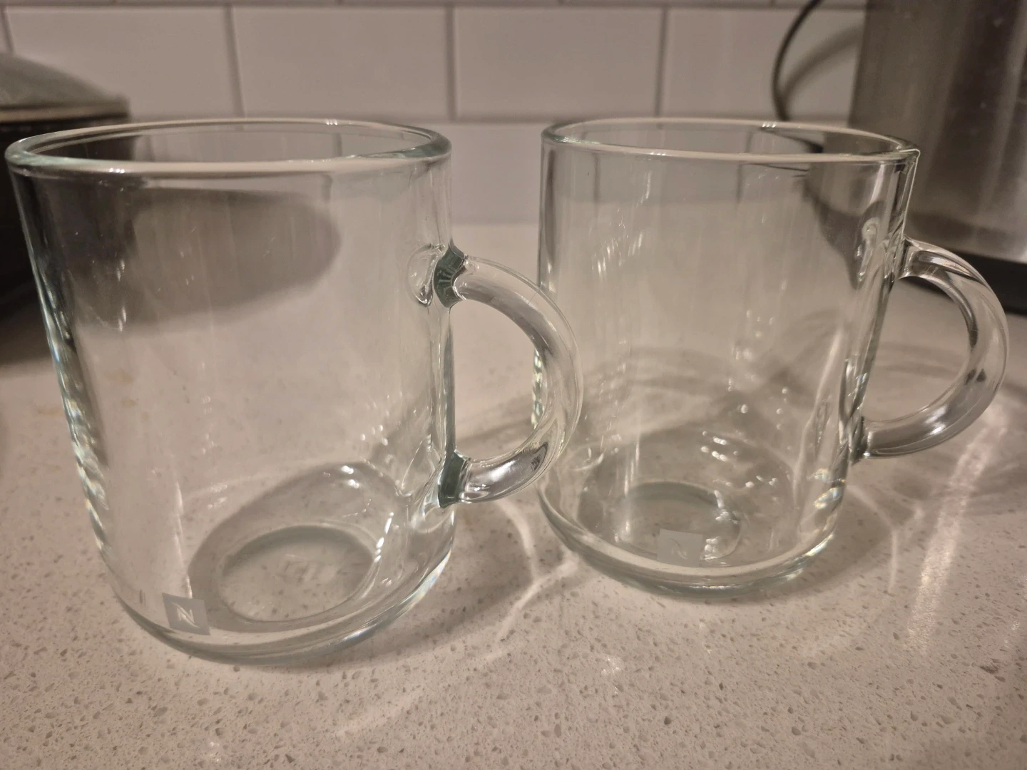 Selling a set of two Nespresso coffee mugs! They're clear glass and have the Nespresso logo on the bottom. Perfect for enjoying your favourite Nespresso coffee